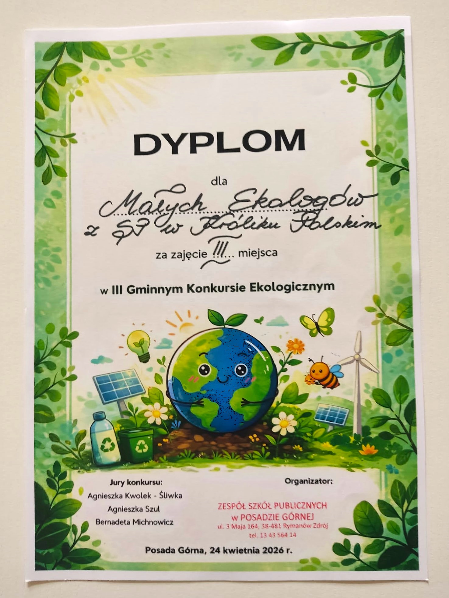 W piątek, 24 kwietnia 2026 r., w Szkole Podstawowej w Posadzie Górnej odbył się III Gminny Konkurs Ekologiczny dla uczniów klas II i III. Do rywalizacji przystąpiło 10 trzyosobowych drużyn ze szkół z terenu Gminy Rymanów.