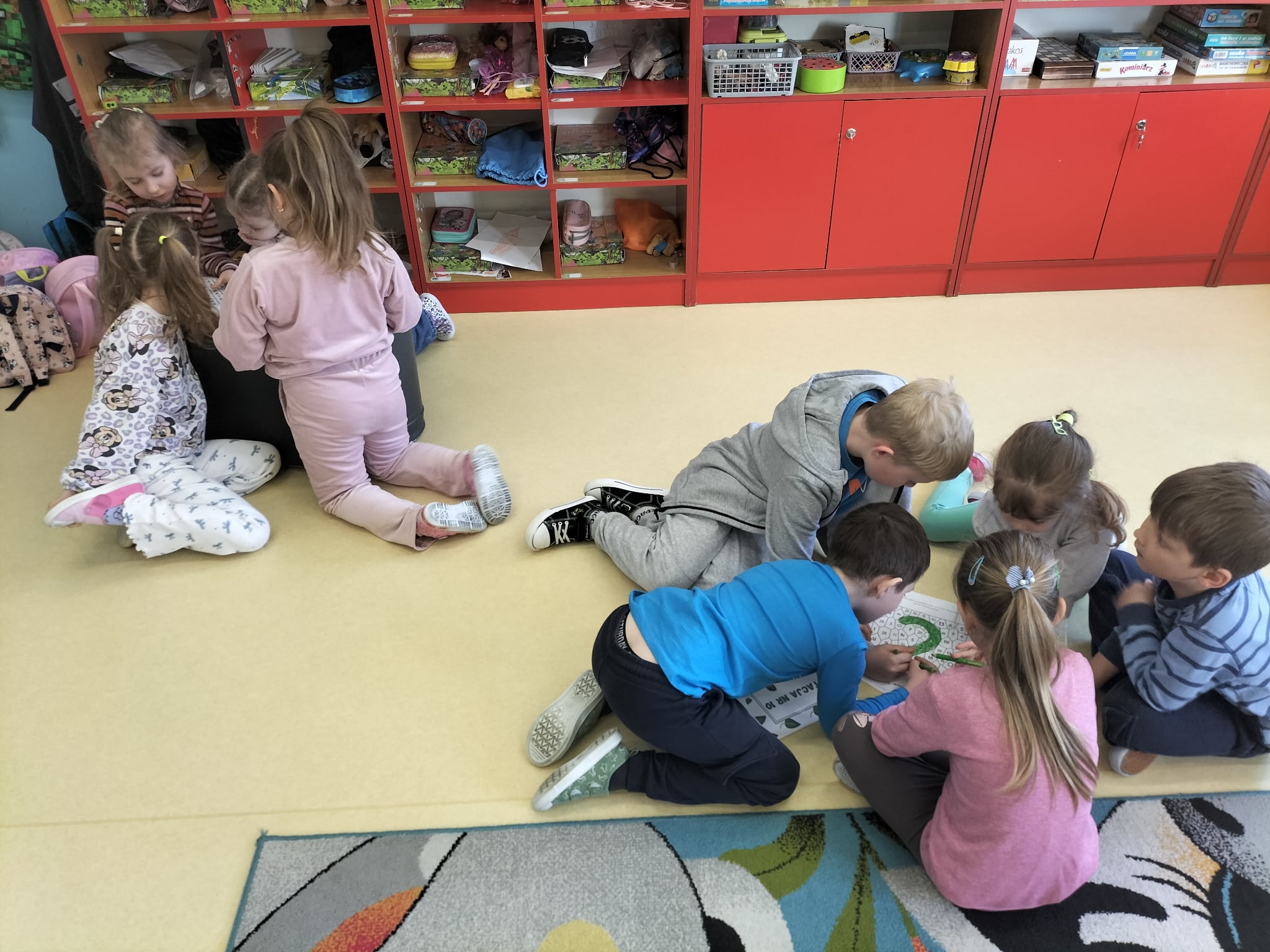Na zakończenie wspólnie pokolorowaliśmy plakat „Dzień Ziemi”, który ozdobił naszą salę. Zajęcia przebiegły w miłej atmosferze, a dzieci aktywnie uczestniczyły we wszystkich proponowanych działaniach.