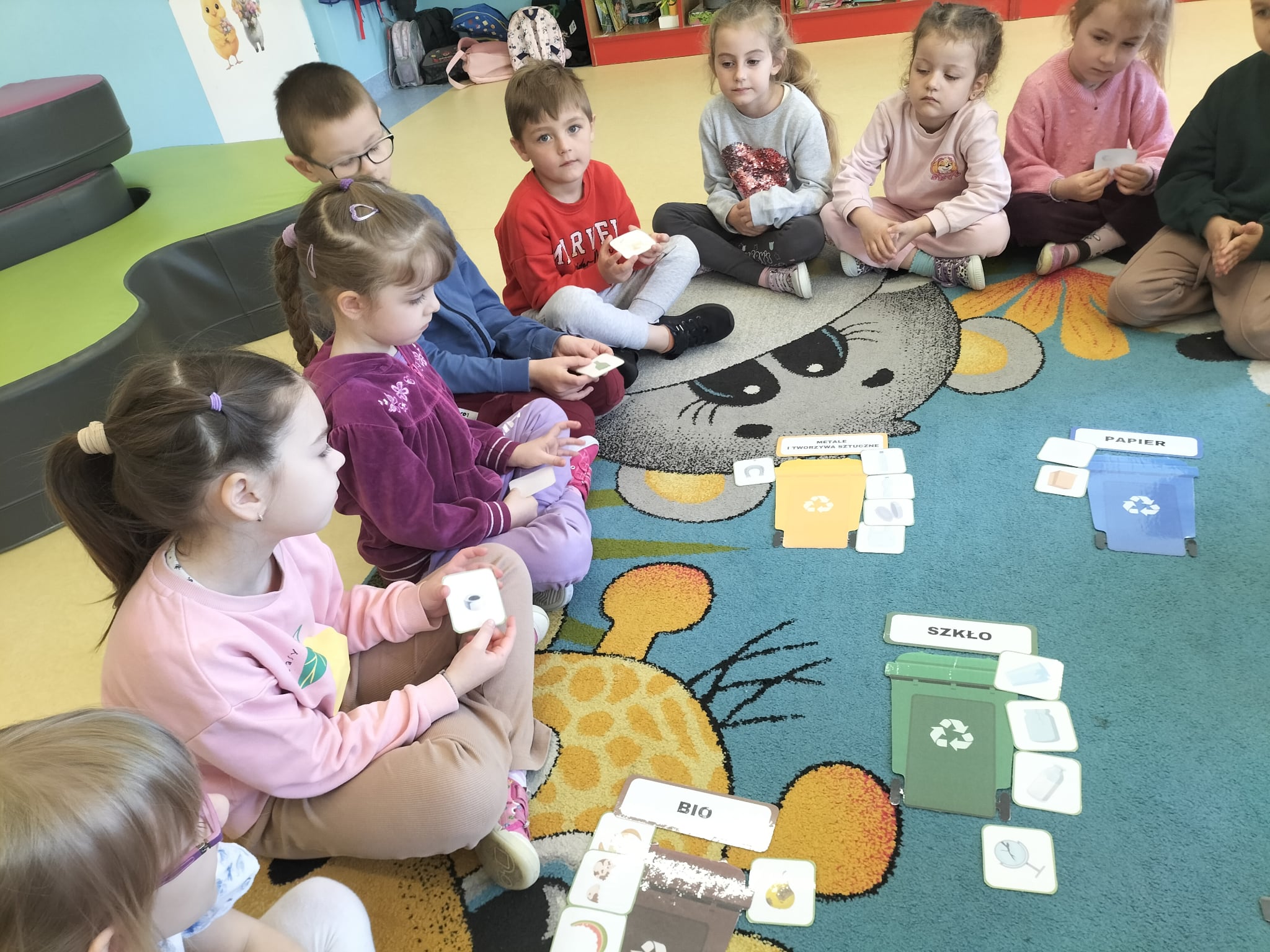 Podczas zajęć dzieci poznały zasady prawidłowej segregacji odpadów oraz kolory worków, które pomagają nam dbać o środowisko. Następnie mogły sprawdzić swoją wiedzę w praktyce, segregując śmieci do odpowiednich pojemników. Odbyła się zabawa „Ja mam… kto ma…”, a także gimnastyka z wykorzystaniem kart obrazkowych, która dostarczyła dzieciom wiele radości. Dzieci ćwiczyły również liczenie, dopasowując ilość elementów do właściwych cyfr.