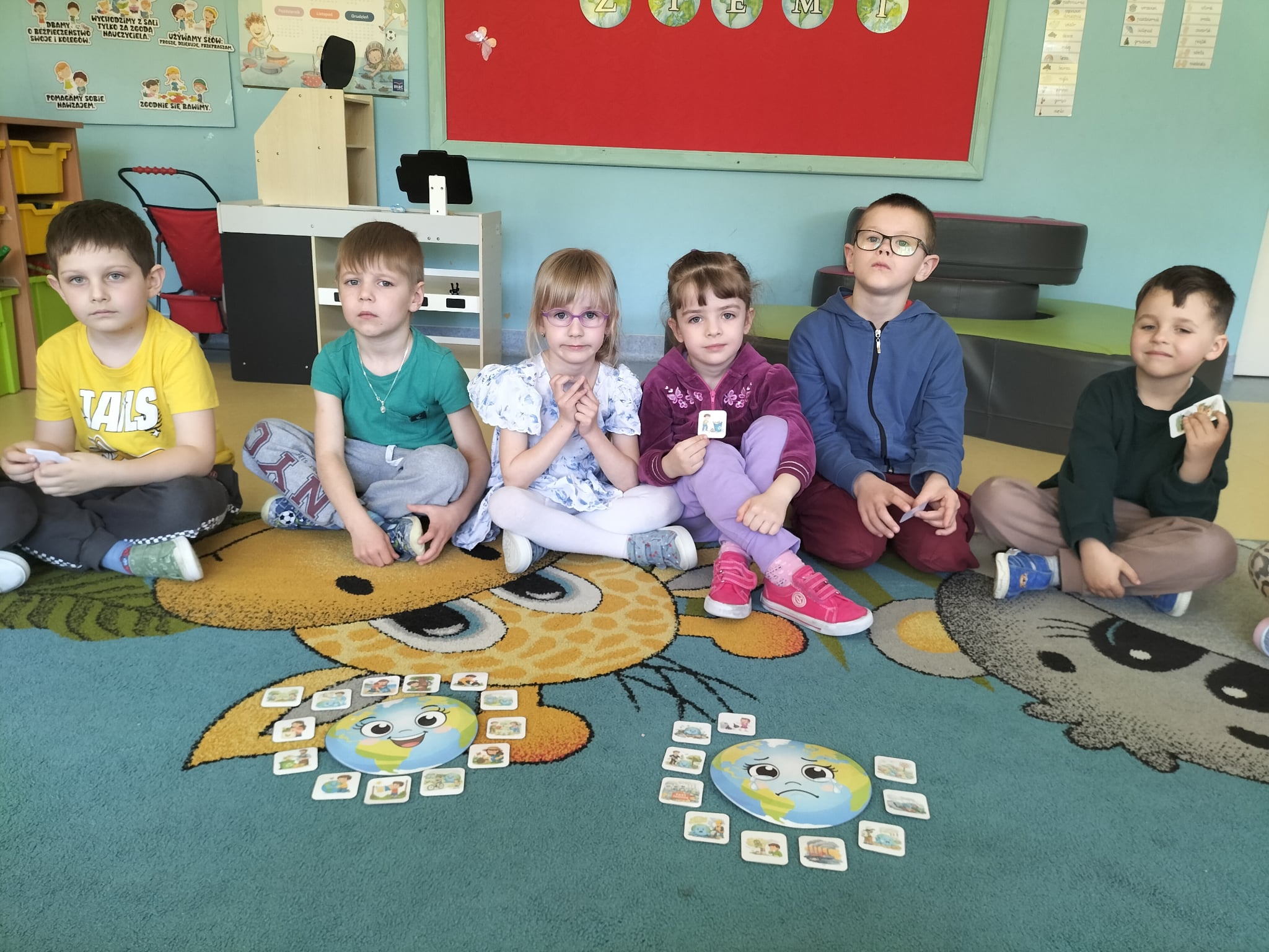 Następnie przedszkolaki brały udział w zabawie polegającej na segregowaniu śmieci do odpowiednich pojemników, utrwalając wiedzę na temat recyklingu. Kolejnym zadaniem było określanie, jakie sytuacje sprawiają, że Ziemia jest smutna, a jakie – że radosna. Dzieci chętnie wypowiadały się i wybierały odpowiednie obrazki, rozwijając swoją świadomość ekologiczną. W części plastycznej dzieci wykonały prace przedstawiające planetę Ziemię.