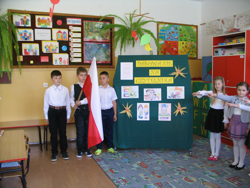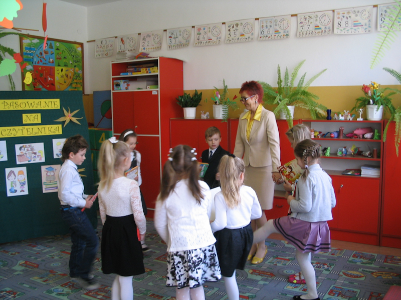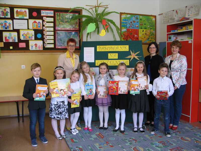 Dzień 19 maja 2016 r. był dniem szczególnym dla pierwszoklasistów. Po wielu miesiącach wytężonej pracy uczniowie poznali wreszcie wszystkie literki alfabetu i opanowali sztukę czytania. Nadszedł więc czas, aby ośmioro dzieci z klasy I zostało przyjętych do grona czytelników biblioteki szkolnej. W uroczystości uczestniczyły: Dyrektor szkoły pani Marta Kogut, wychowawczyni kl. I pani Teresa Wais oraz nauczyciel języka angielskiego pani Kamila Krukar.