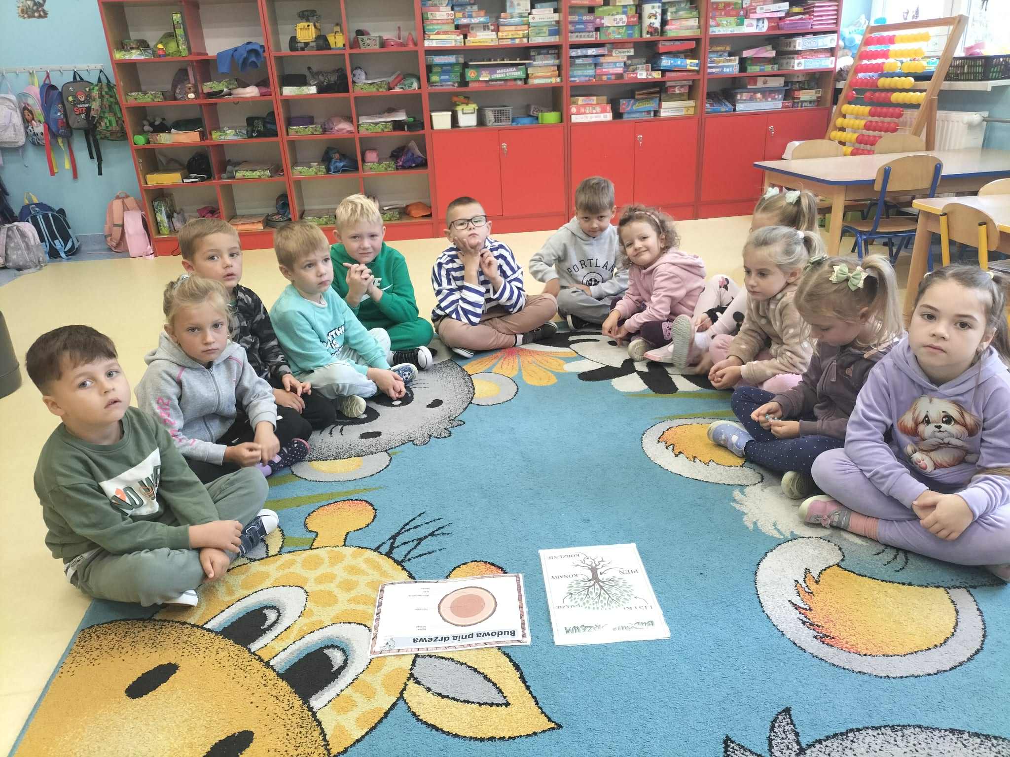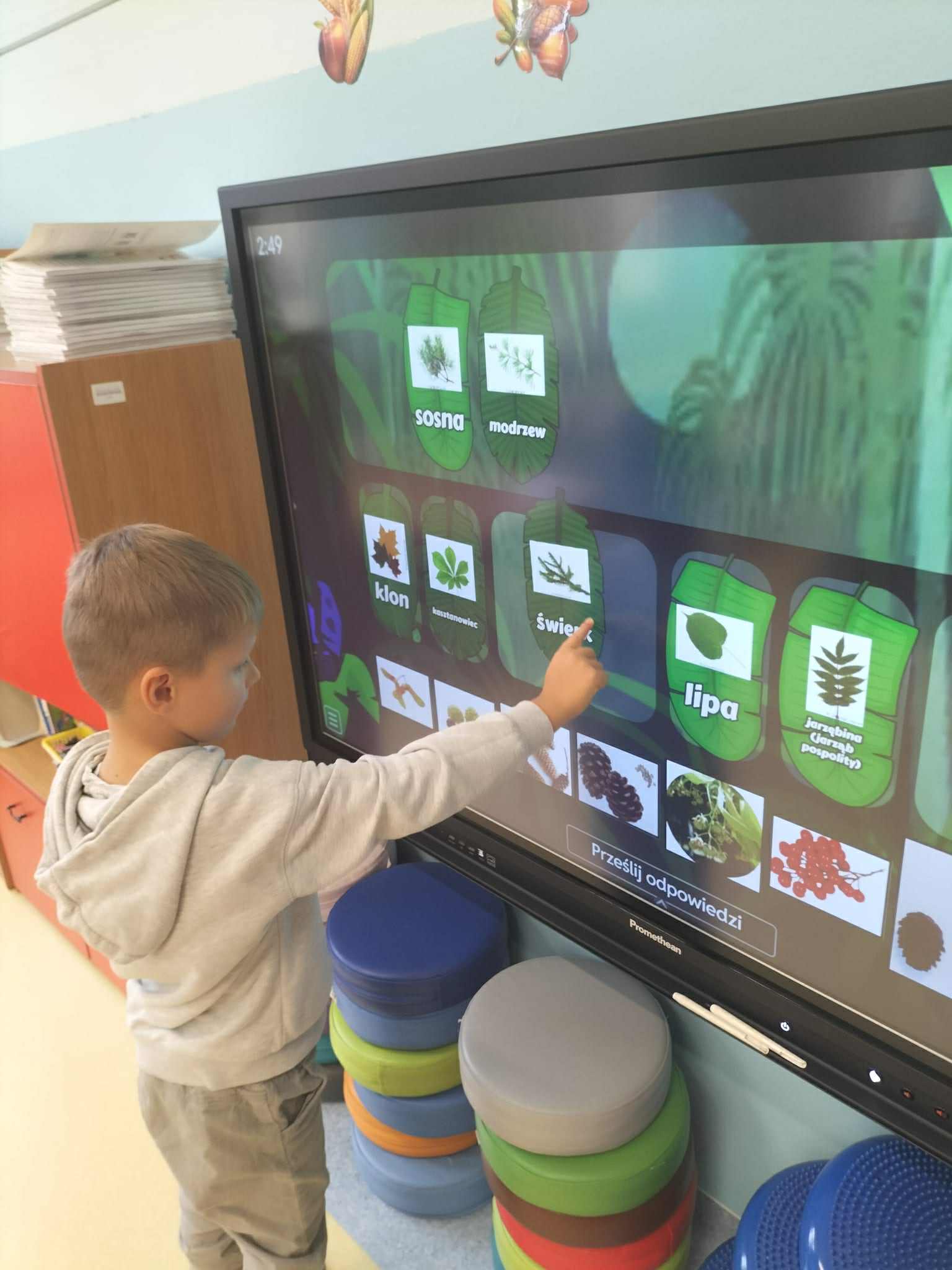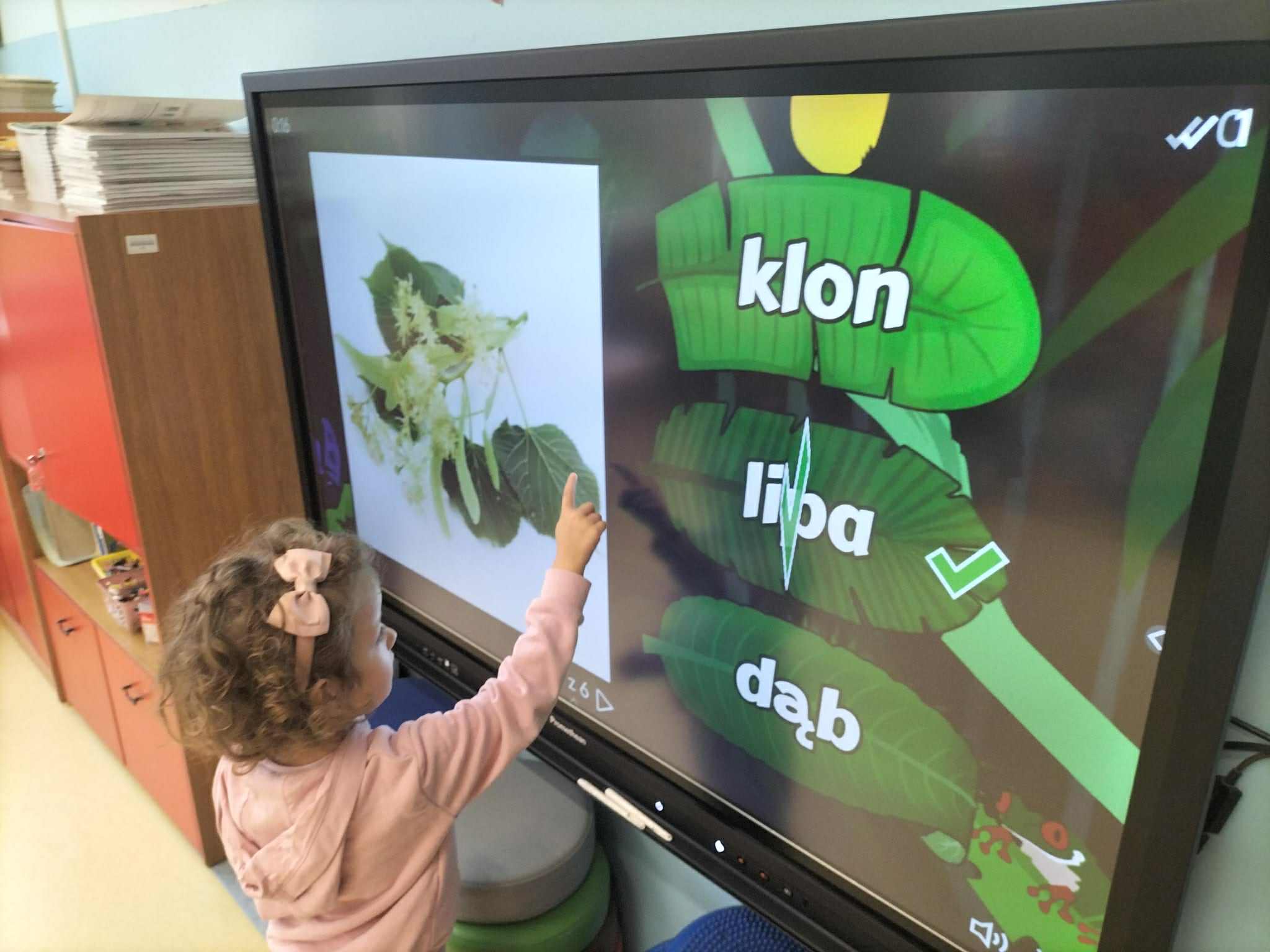 Poznały ich budowę oraz kolejne etapy wzrostu – od maleńkiego nasionka po dorodne, rozłożyste drzewo. Rozmawialiśmy też o tym, jak ważne są drzewa w przyrodzie i jak wiele pożytku dają człowiekowi, ale też jakie są zagrożenia dla drzew. Dzieci zapoznały się z podziałem drzew na liściaste i iglaste. W części praktycznej dzieci układały w parach puzzle, odszukiwały ich prawidłowych kształtów z figur geometrycznych, kodowały rysunek drzewa oraz rozwiązywały zadania na tablicy multimedialnej.