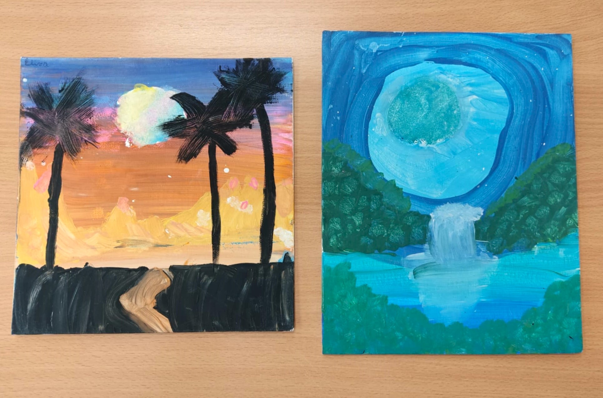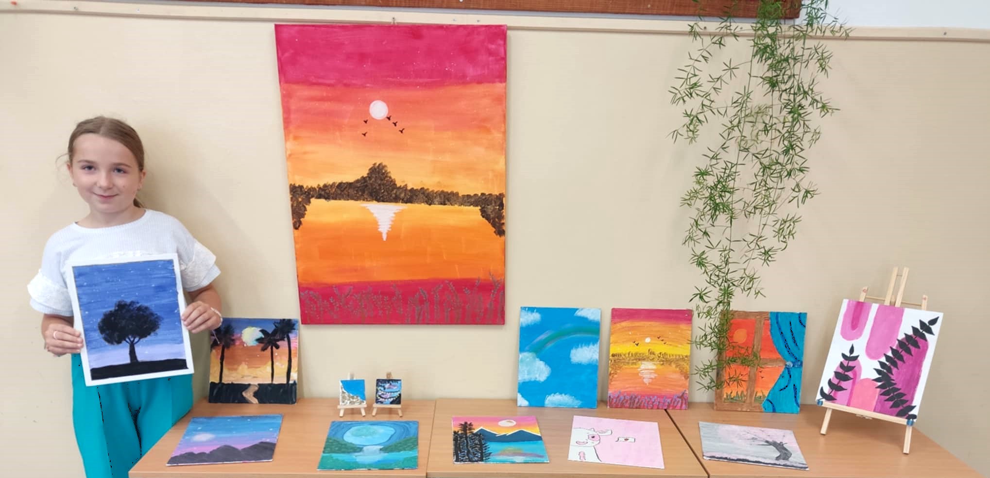 Zapraszamy do obejrzenia szkolnej wystawy prac, które wyszły spod jej ręki. Zaprezentowała nam jedynie niewielki fragment swojej twórczości, jak sama przyznaje w domu pozostało mnóstwo obrazów jej autorstwa. Inspiracji mała artystka poszukuje w książkach i otaczającym ją świecie, są one barwne, ciekawe i pomysłowe.