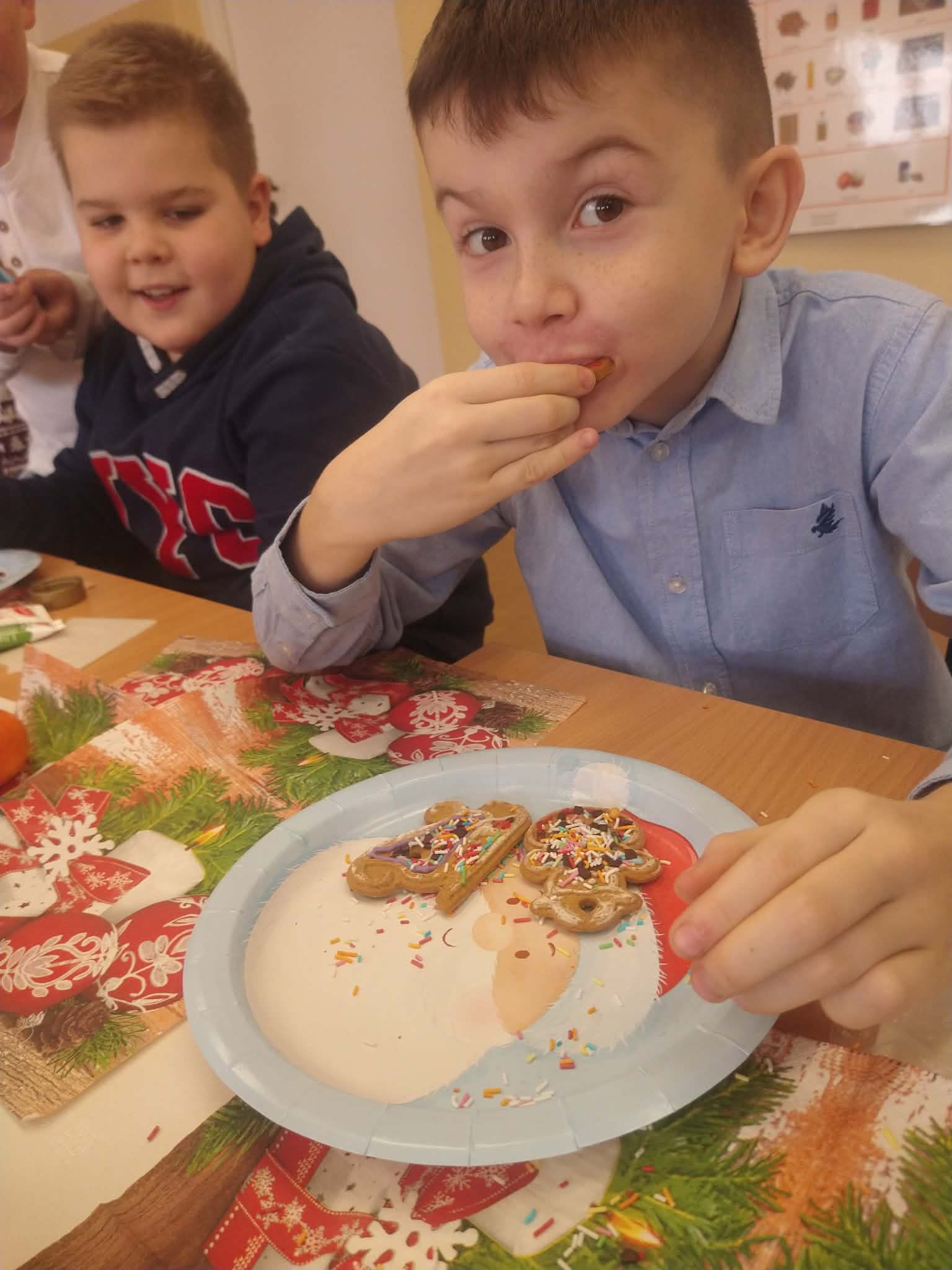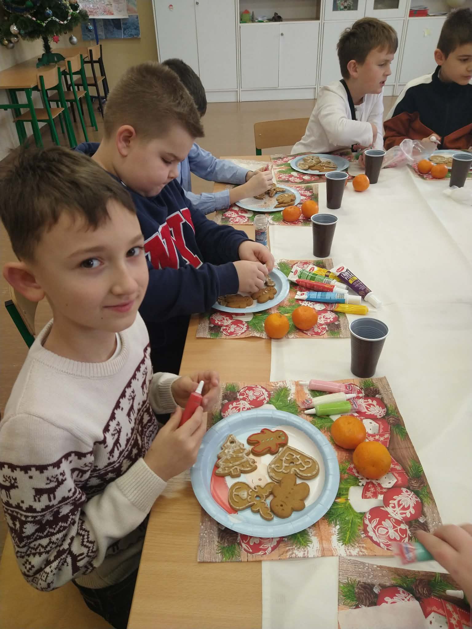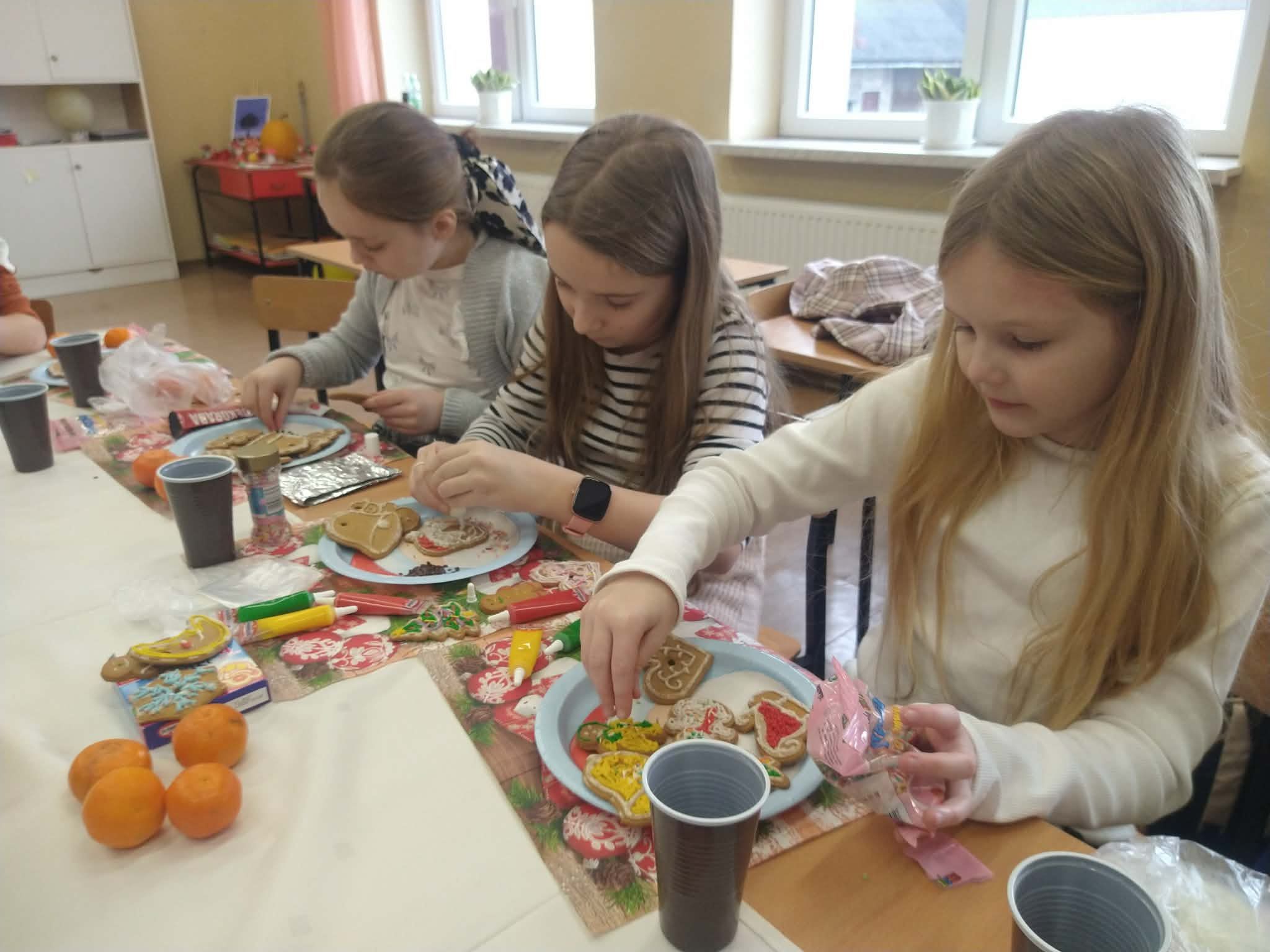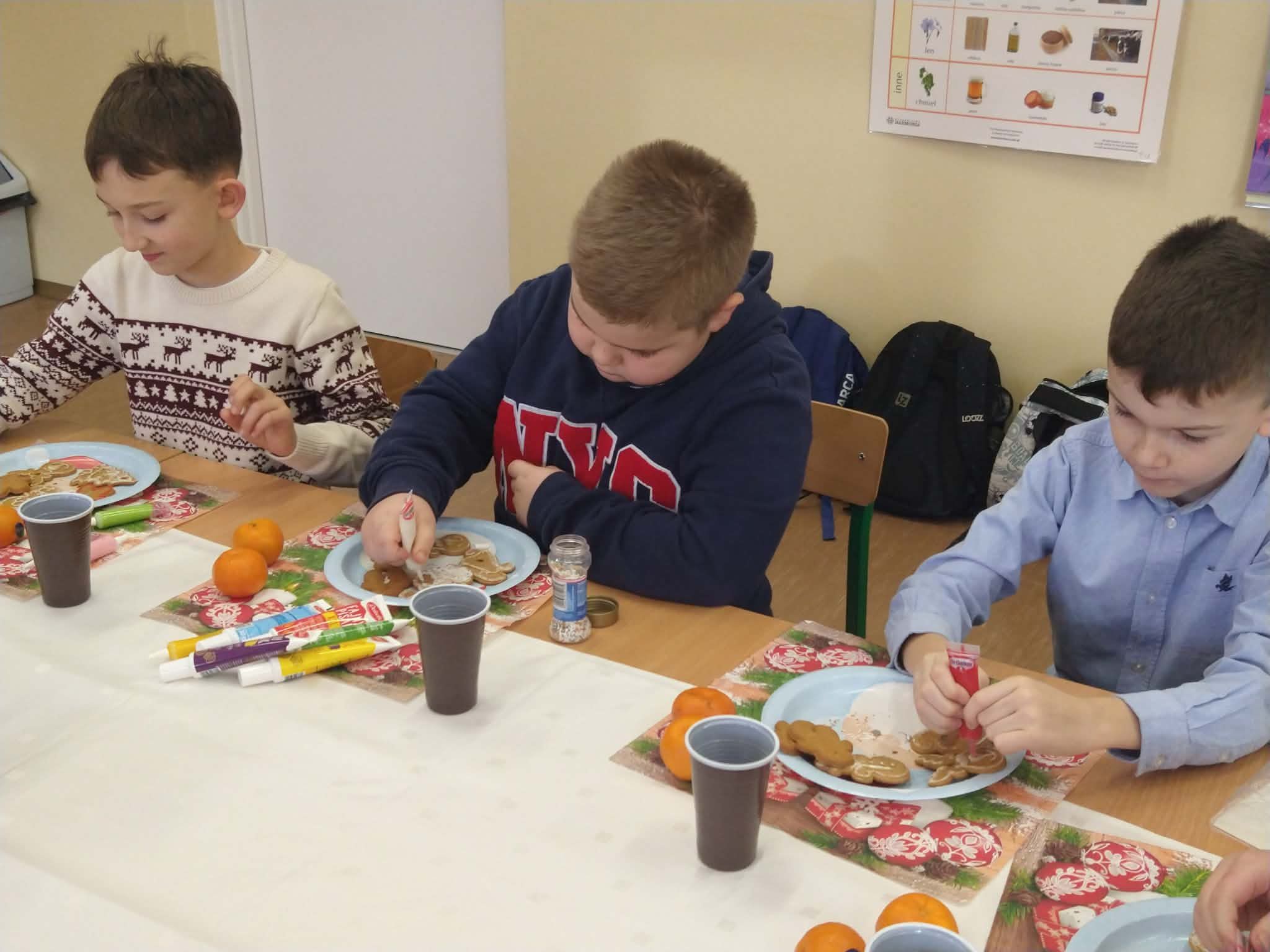 W oczekiwaniu na Święta Bożego Narodzenia uczniowie klasy II i III postanowili udekorować świąteczne pierniczki. Po przypomnieniu świątecznych tradycji, przy dźwiękach kolęd, uczniowie przystąpili do pracy. Z wielkim zaangażowaniem dekorowali pierniczki za pomocą kolorowego lukru, barwnej posypki, cukierków i innych ozdób. Było dużo radości, kreatywności i pysznych efektów. Pięknie udekorowane pierniczki, dzieci mogły zabrać do domu, zjeść lub powiesić na choince. Na koniec, wszyscy złożyli sobie świąteczne życzenia łamiąc się opłatkiem i śpiewając kolędy.