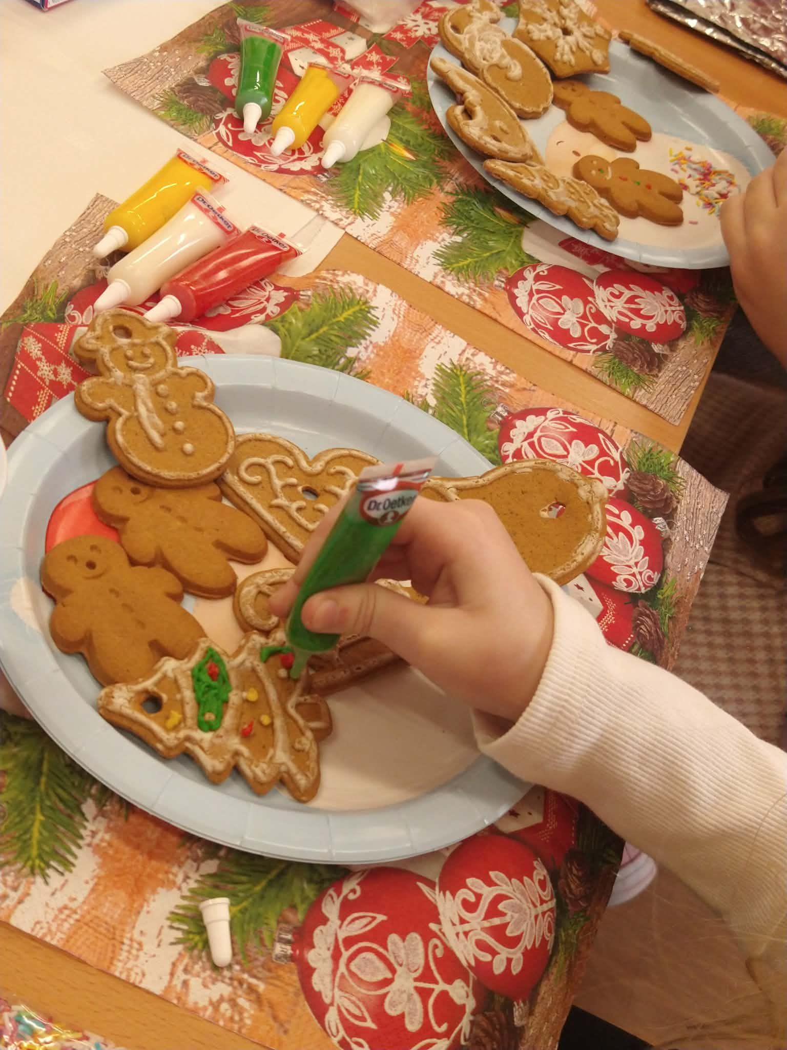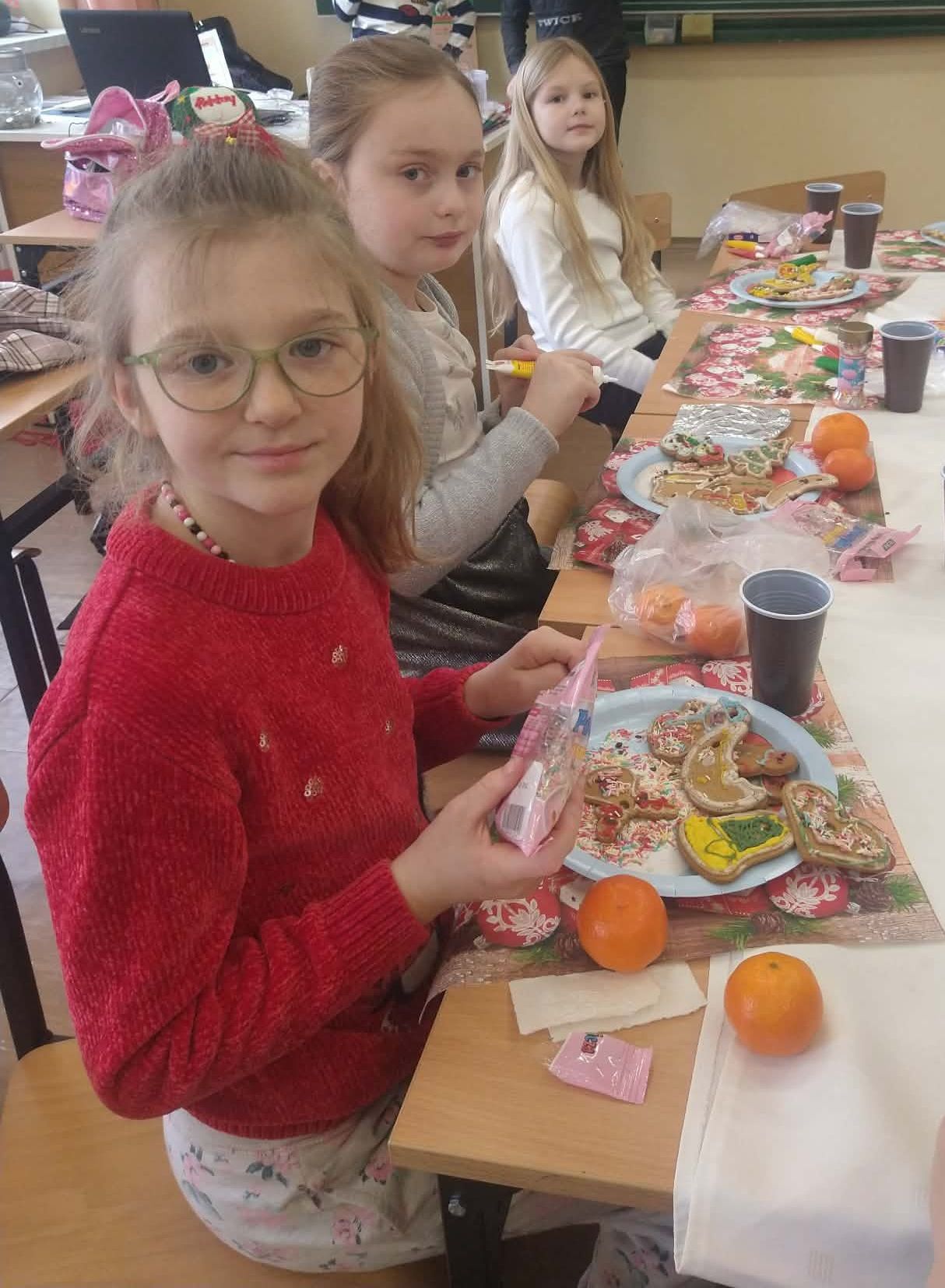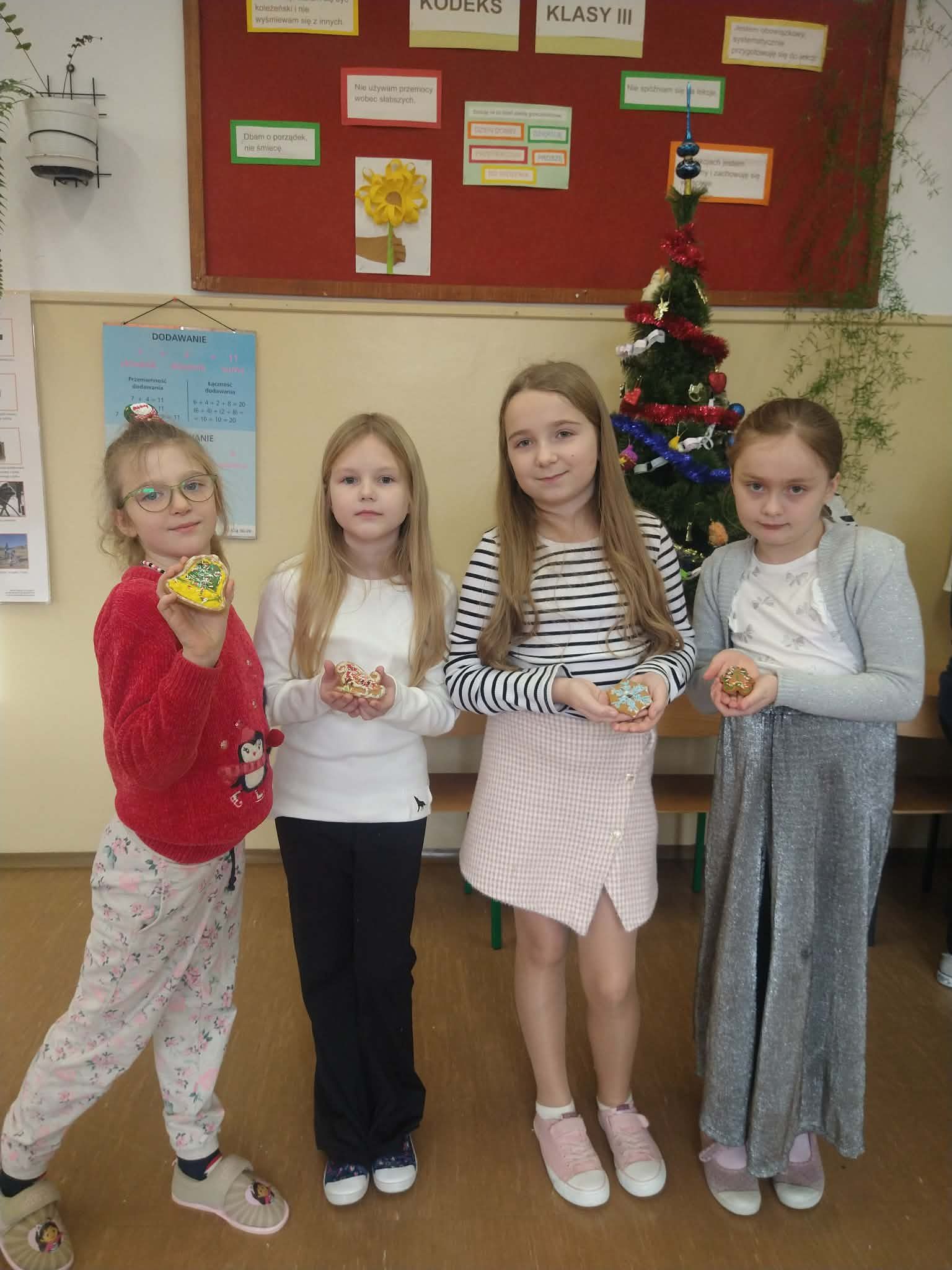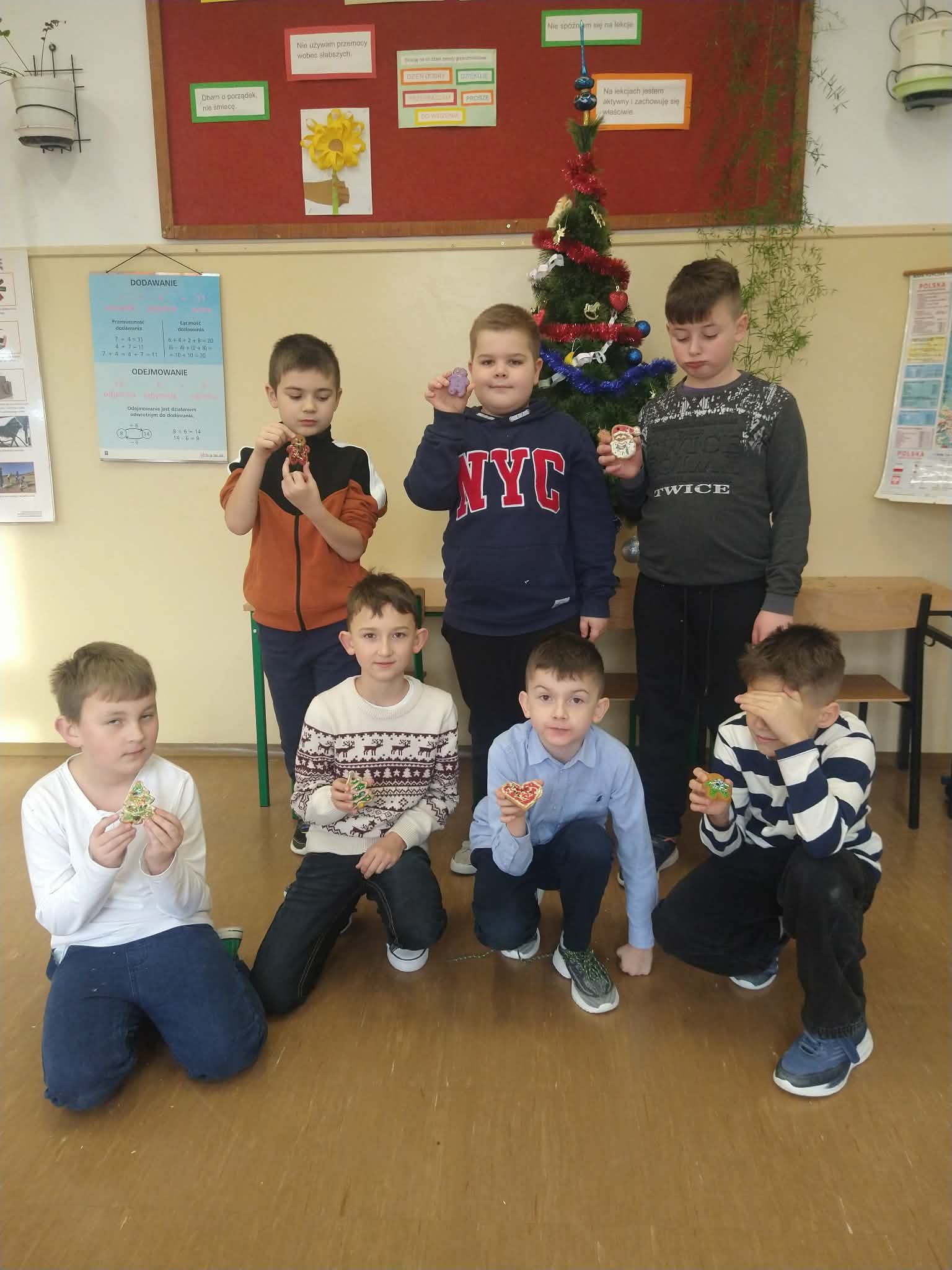 W oczekiwaniu na Święta Bożego Narodzenia uczniowie klasy II i III postanowili udekorować świąteczne pierniczki. Po przypomnieniu świątecznych tradycji, przy dźwiękach kolęd, uczniowie przystąpili do pracy. Z wielkim zaangażowaniem dekorowali pierniczki za pomocą kolorowego lukru, barwnej posypki, cukierków i innych ozdób. Było dużo radości, kreatywności i pysznych efektów. Pięknie udekorowane pierniczki, dzieci mogły zabrać do domu, zjeść lub powiesić na choince. Na koniec, wszyscy złożyli sobie świąteczne życzenia łamiąc się opłatkiem i śpiewając kolędy.