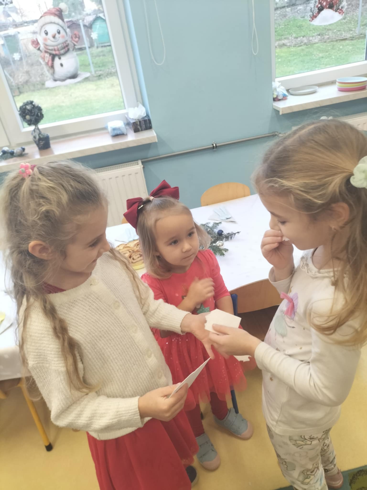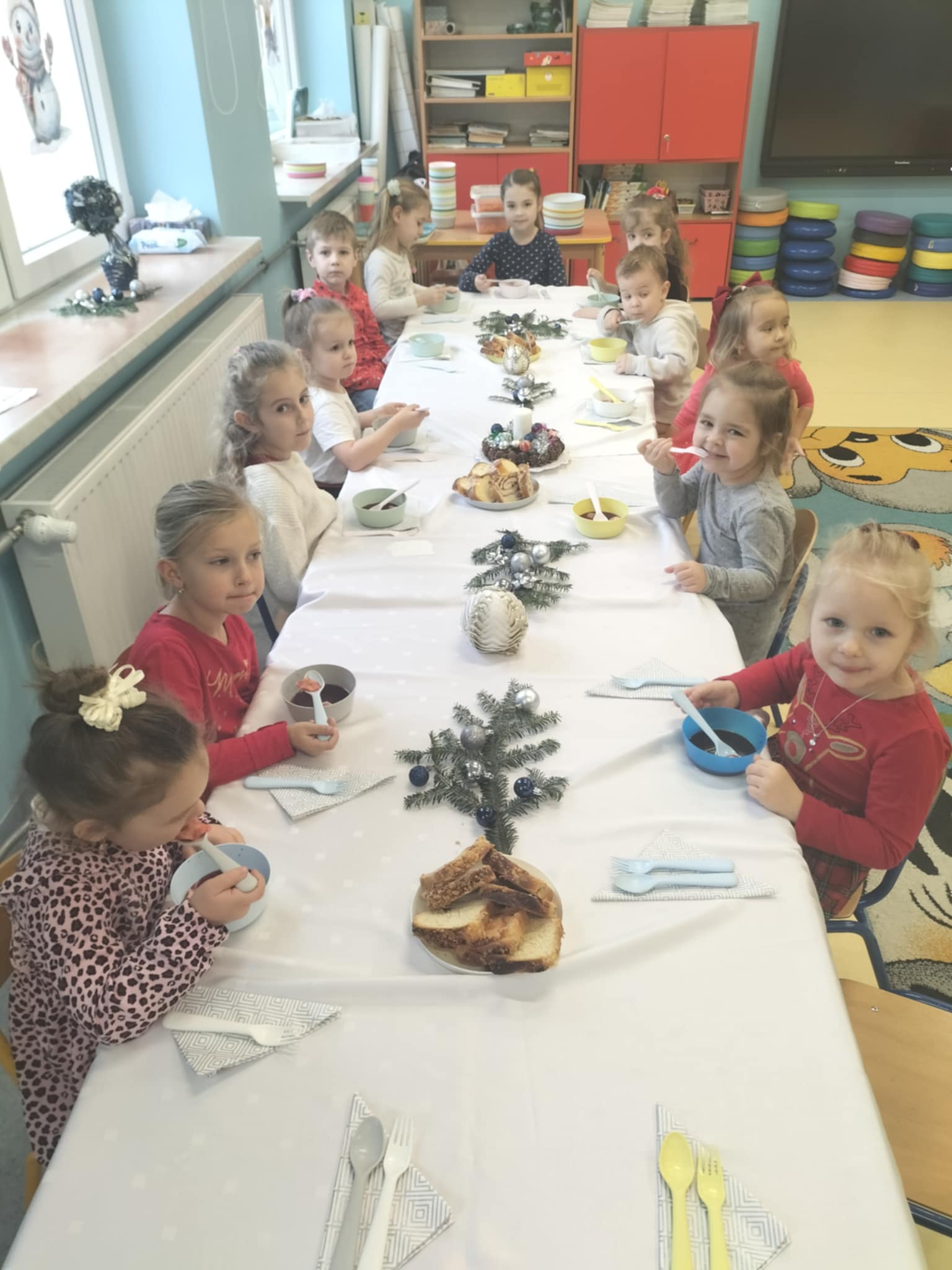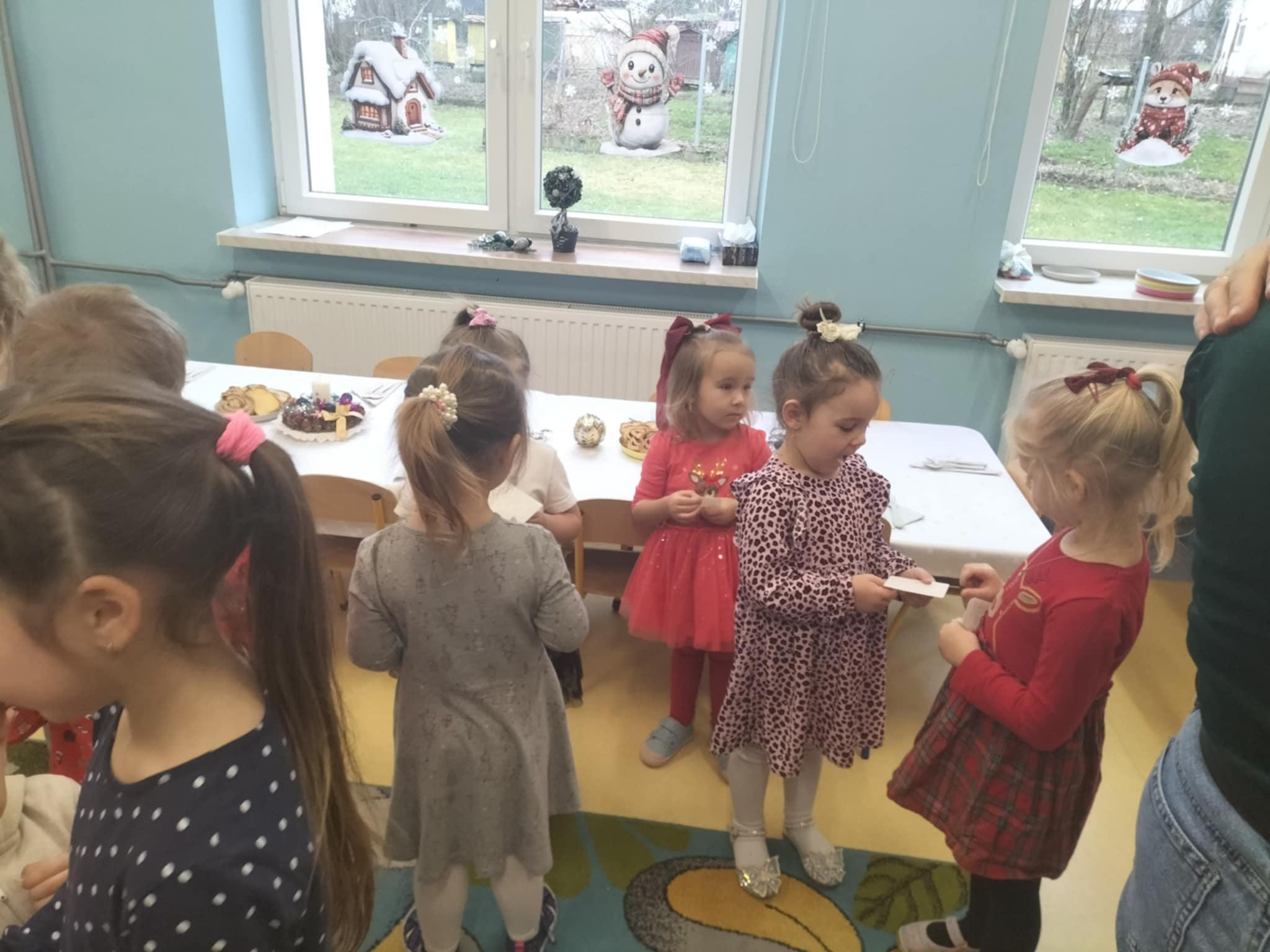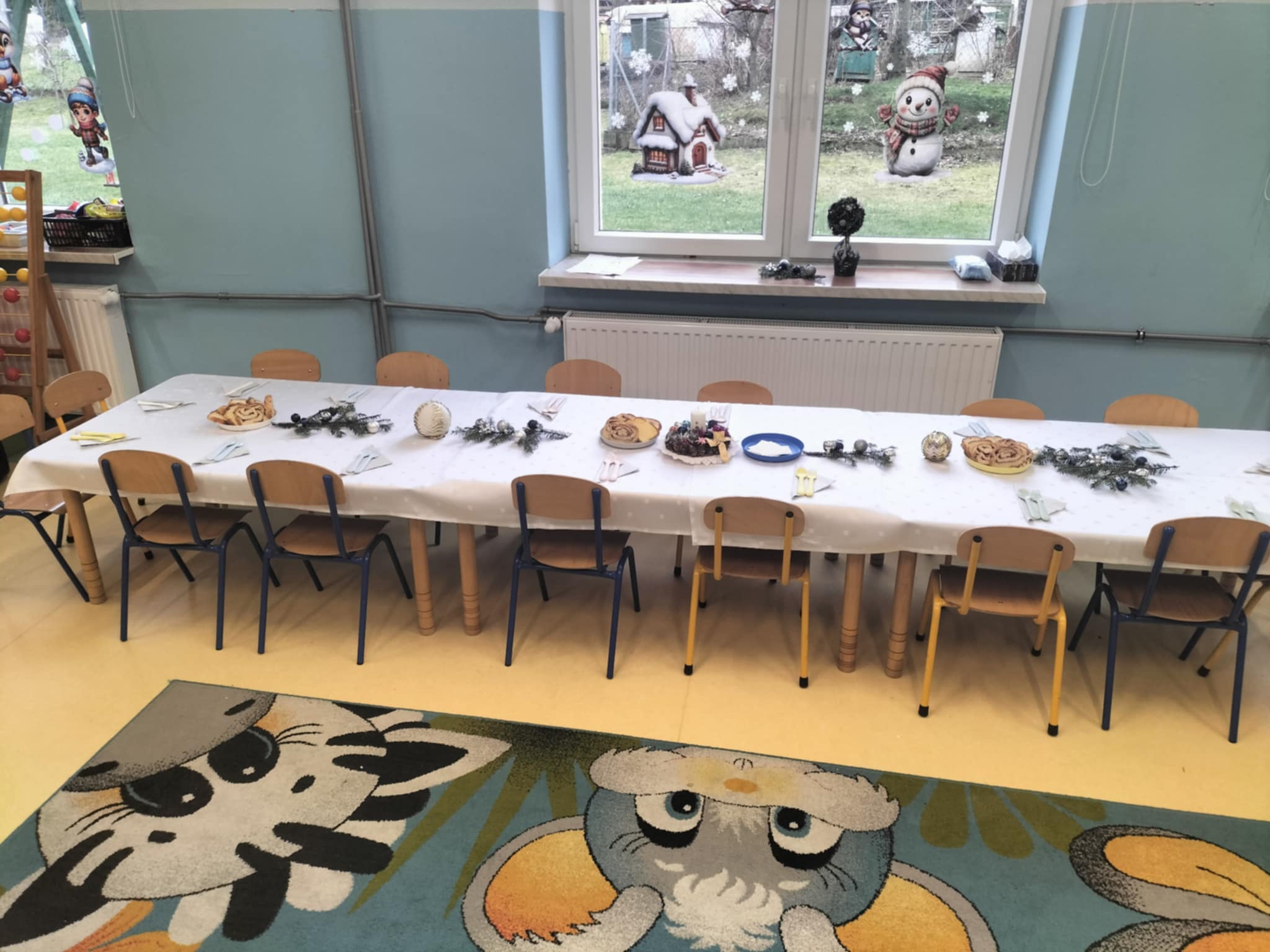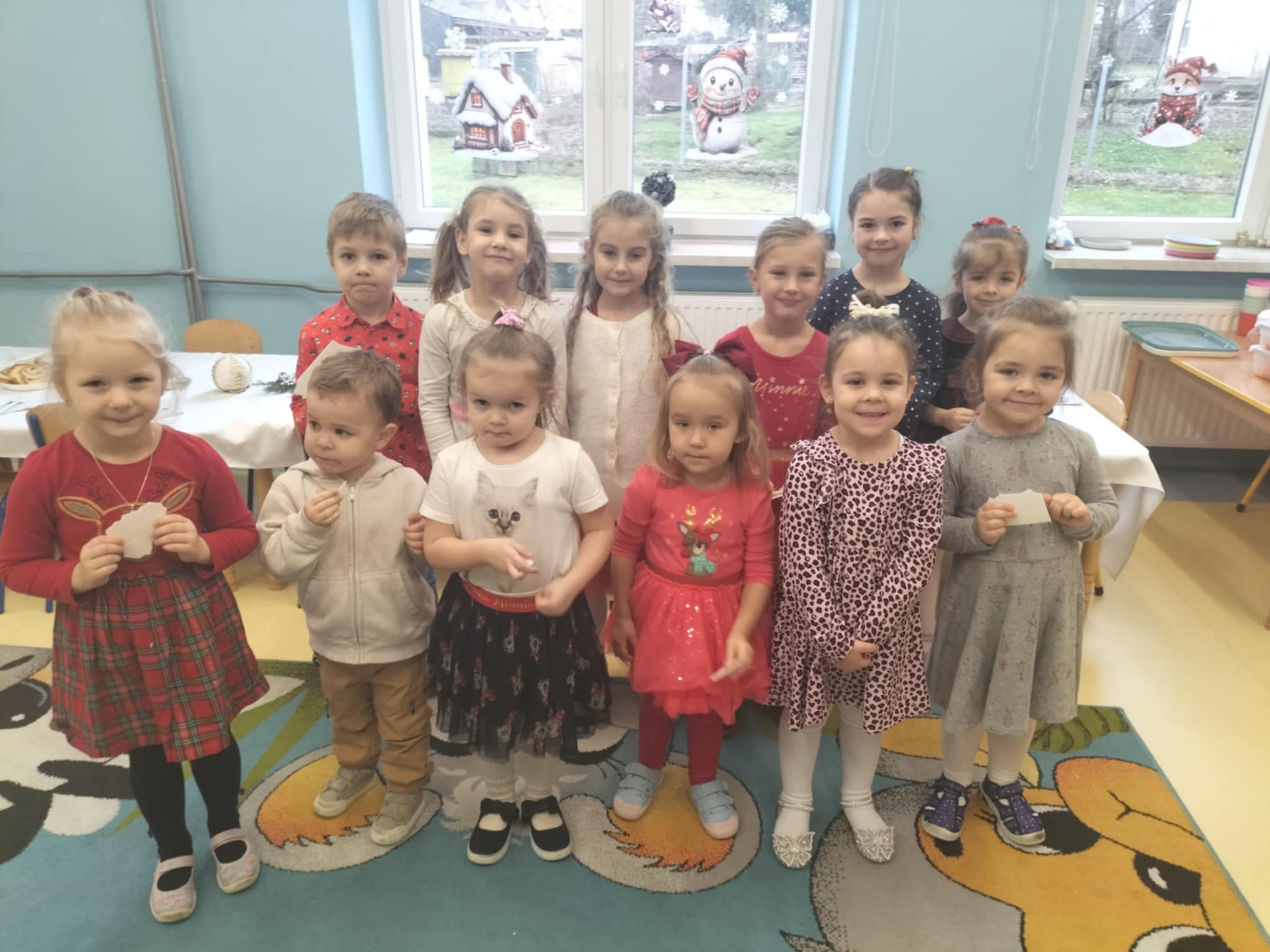W dniu dzisiejszym w naszym oddziale przedszkolnym odbyło się uroczyste spotkanie wigilijne, które wprowadziło całą społeczność przedszkolną w wyjątkową atmosferę Świąt Bożego Narodzenia. Dzieci, kultywując piękne polskie tradycje, dzieliły się opłatkiem, składały sobie serdeczne życzenia oraz wspólnie śpiewały kolędy. Spotkanie było okazją do wzmacniania więzi, budowania poczucia wspólnoty oraz kształtowania u najmłodszych postaw życzliwości, empatii i wzajemnego szacunku. Radosne chwile spędzone razem przyczyniły się do stworzenia ciepłej, pełnej spokoju i serdecznej atmosfery.