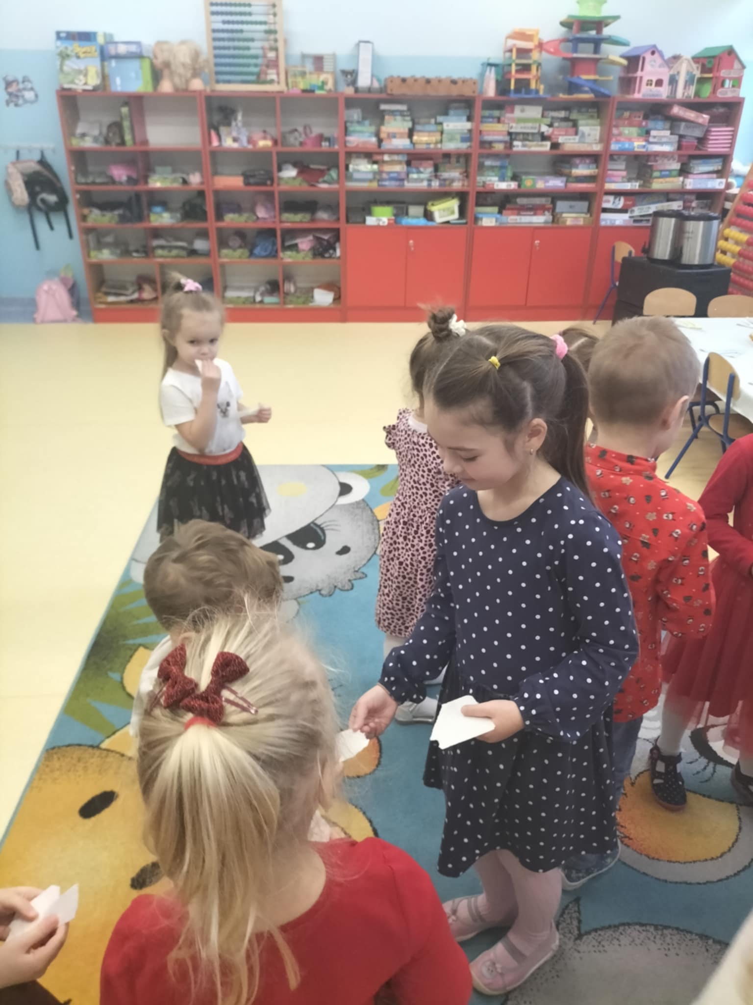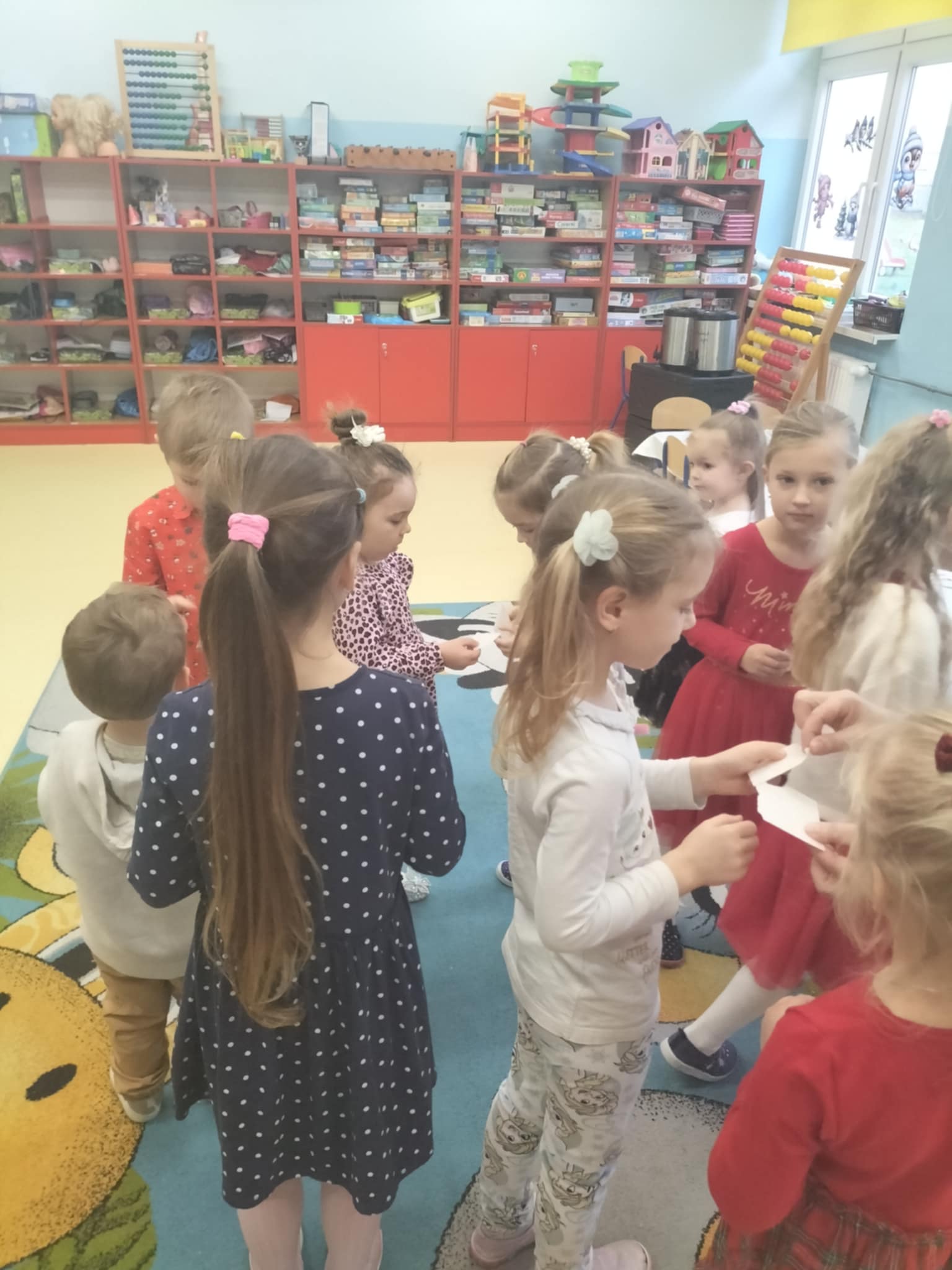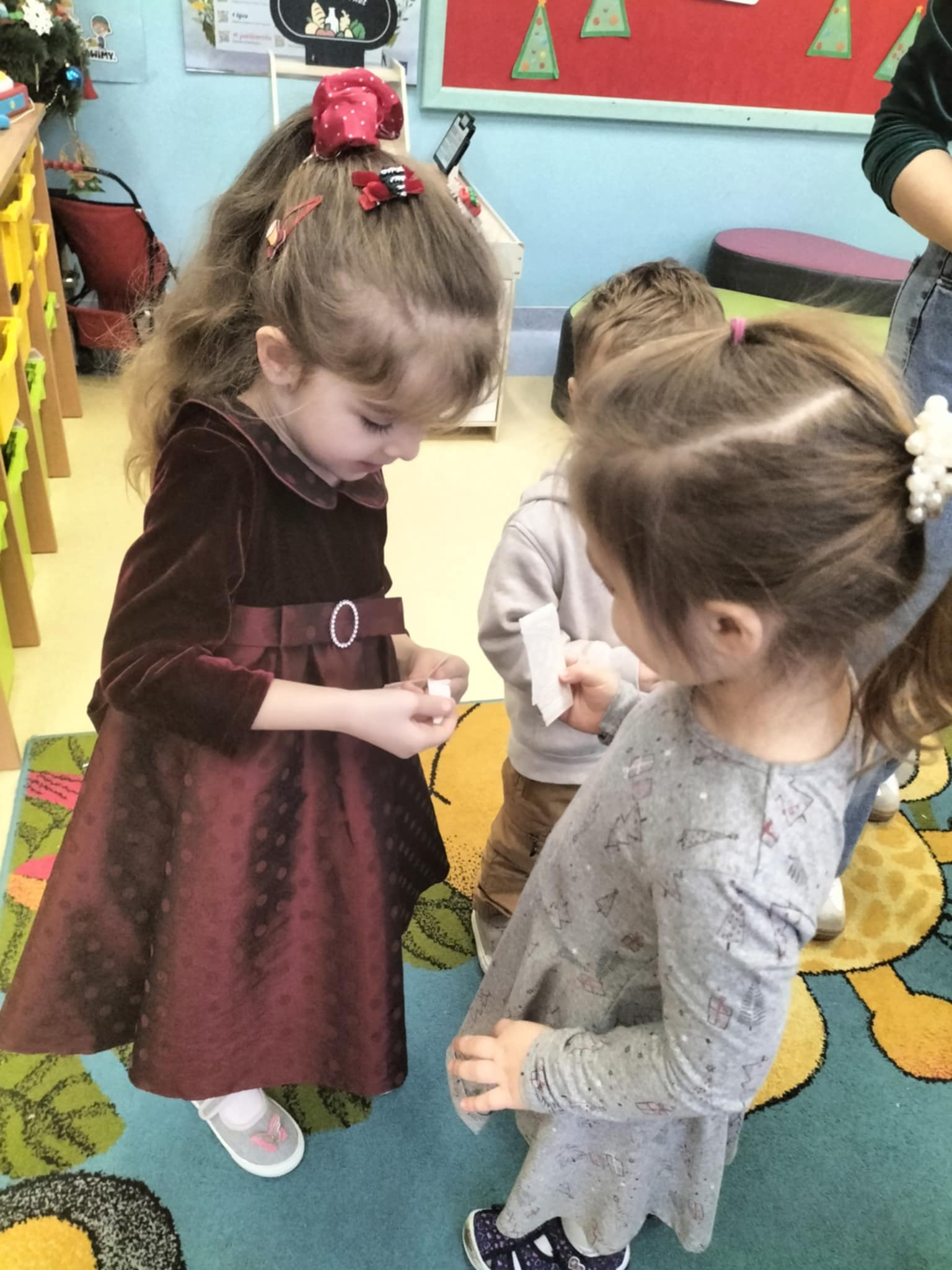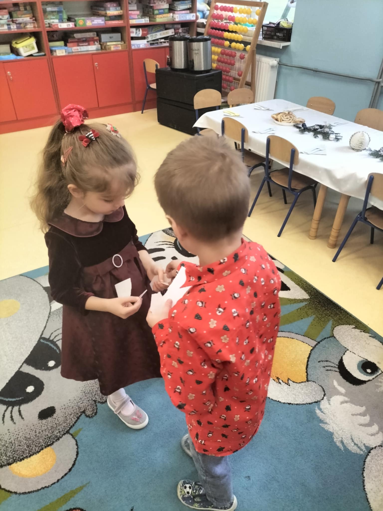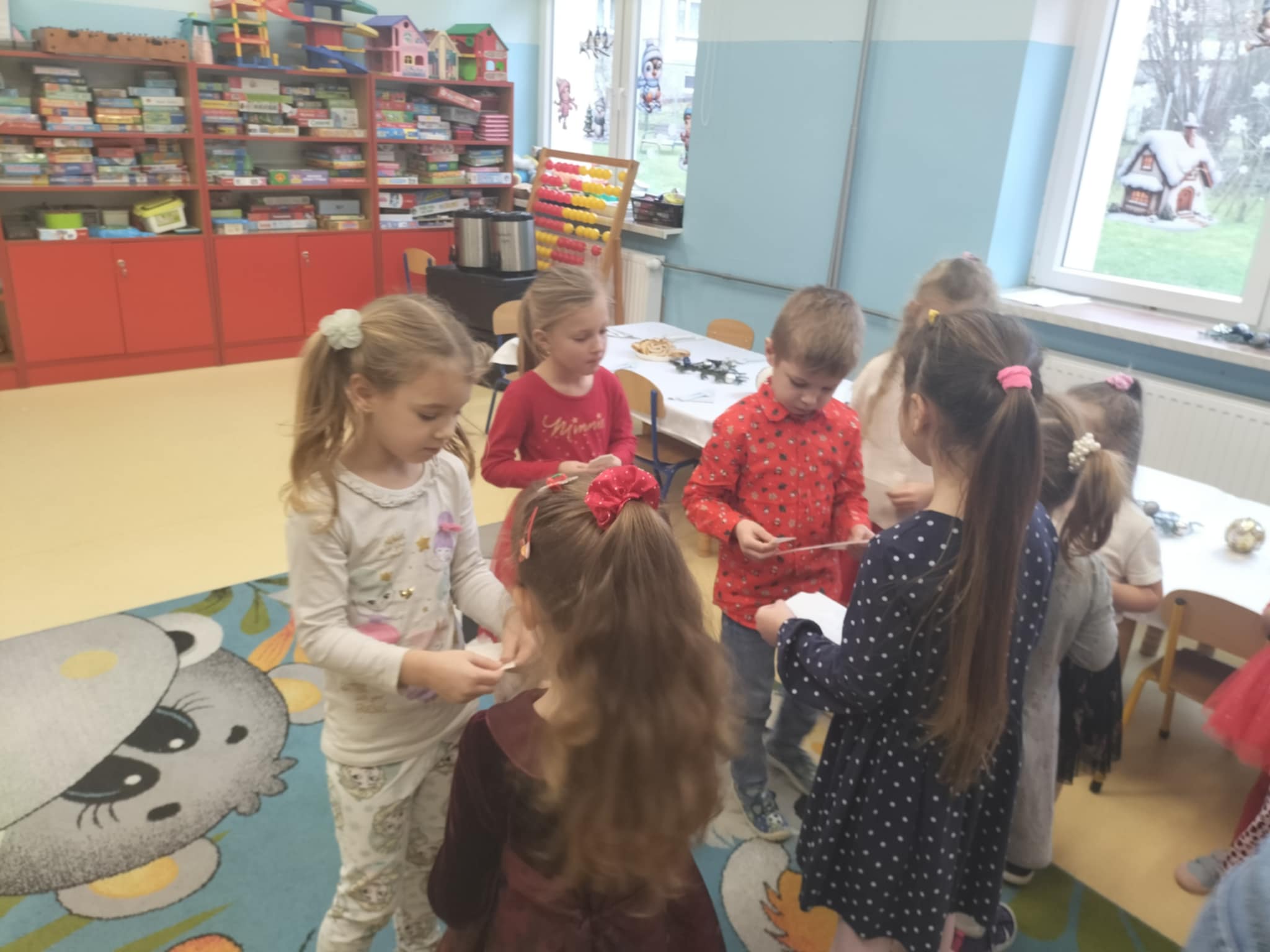 W dniu dzisiejszym w naszym oddziale przedszkolnym odbyło się uroczyste spotkanie wigilijne, które wprowadziło całą społeczność przedszkolną w wyjątkową atmosferę Świąt Bożego Narodzenia. Dzieci, kultywując piękne polskie tradycje, dzieliły się opłatkiem, składały sobie serdeczne życzenia oraz wspólnie śpiewały kolędy. Spotkanie było okazją do wzmacniania więzi, budowania poczucia wspólnoty oraz kształtowania u najmłodszych postaw życzliwości, empatii i wzajemnego szacunku. Radosne chwile spędzone razem przyczyniły się do stworzenia ciepłej, pełnej spokoju i serdecznej atmosfery.