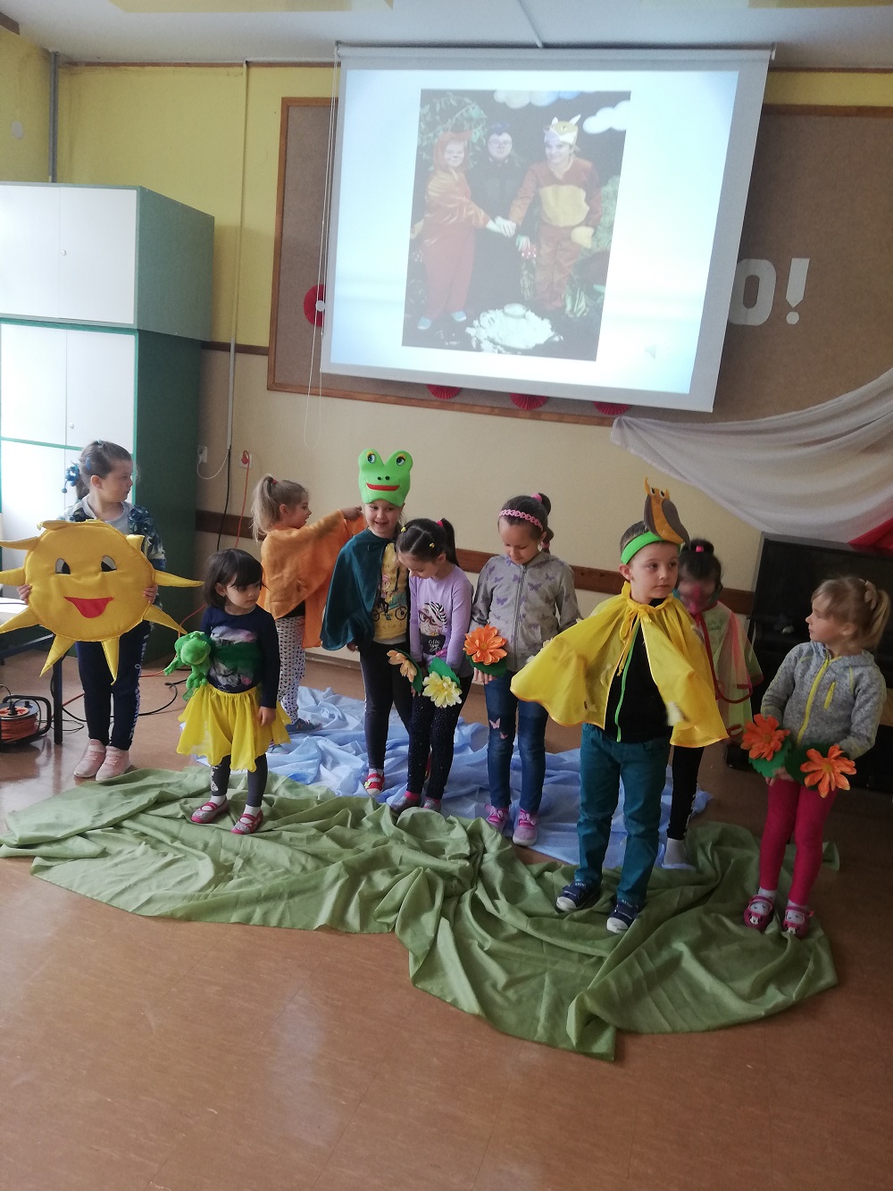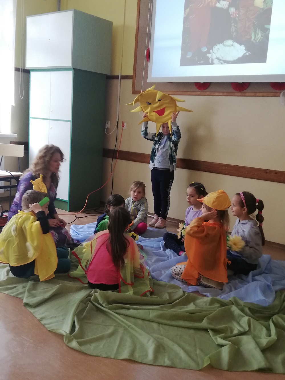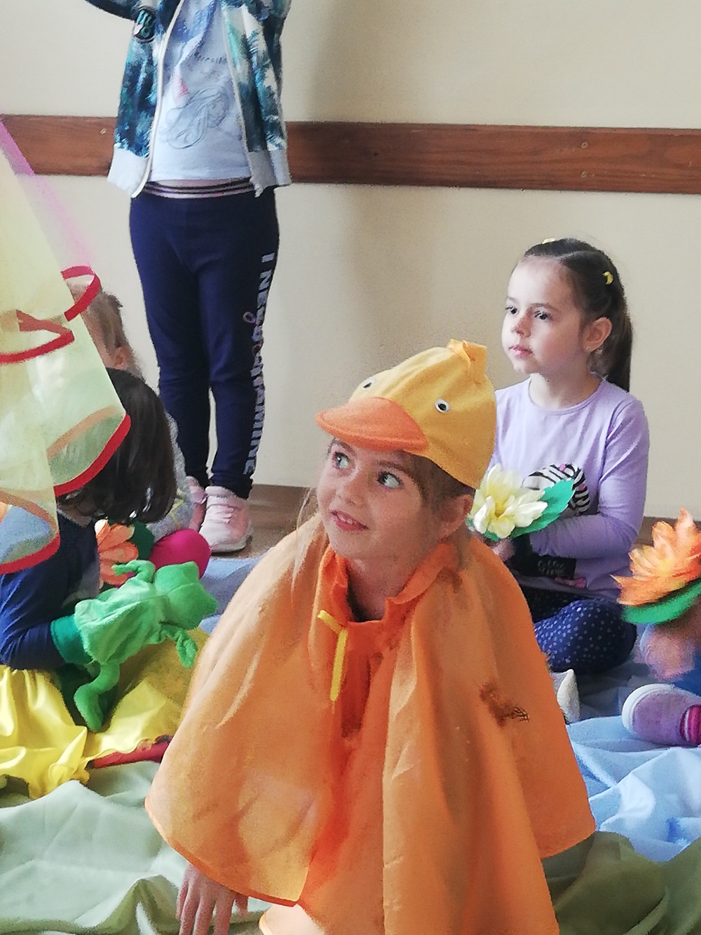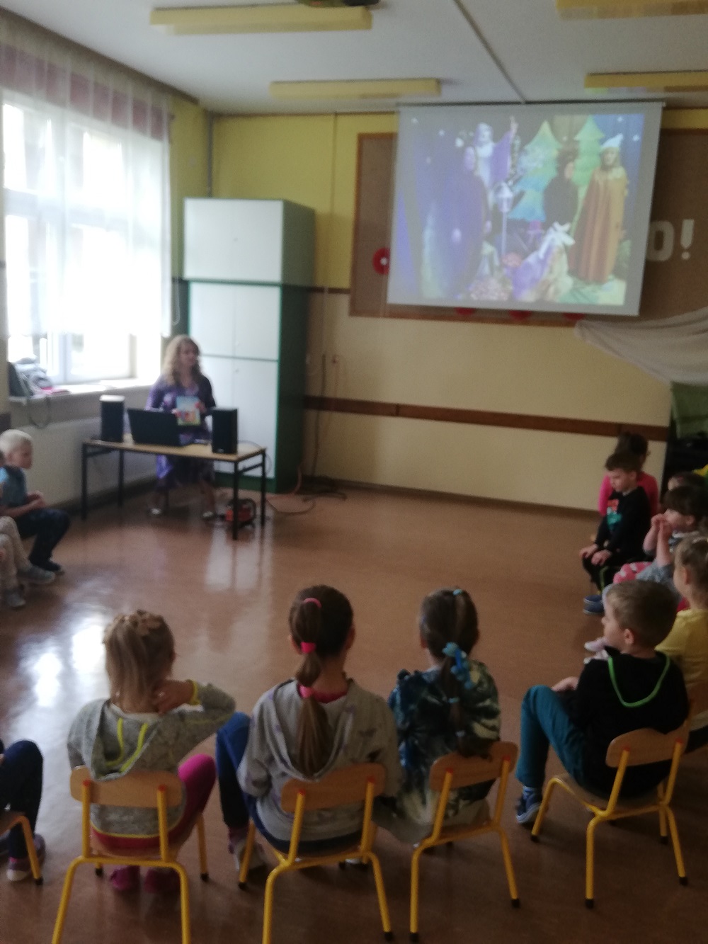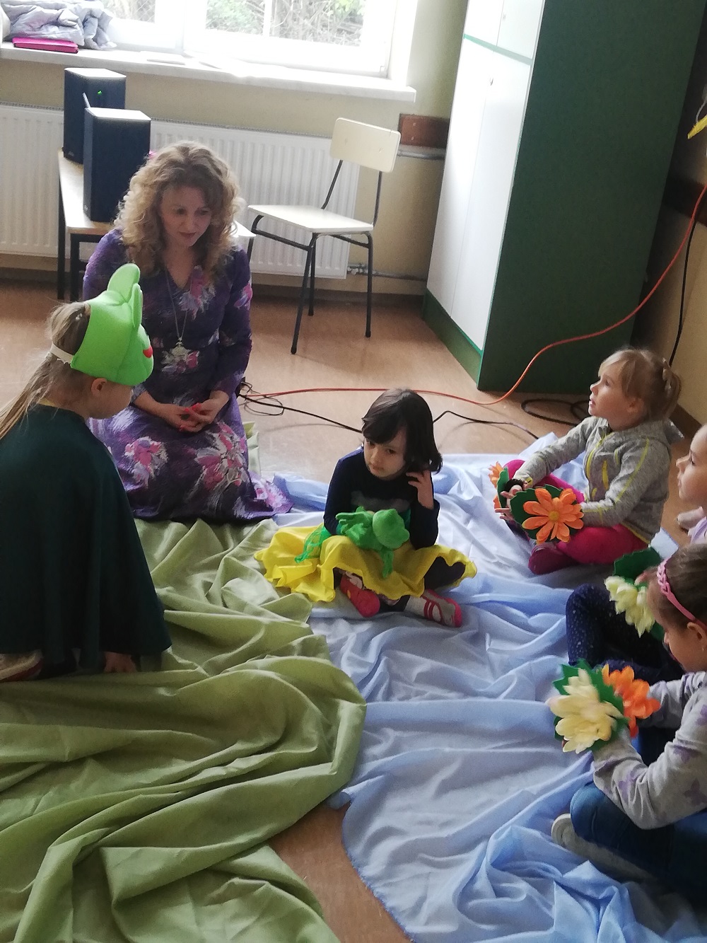Po odśpiewaniu nowo poznanej piosenki powitalnej przez dzieci rozpoczęły się zajęcia teatralne, które zapoczątkował krótki filmik dotyczący podstawowych wiadomości o teatrze. Dzieci z uwagą go obejrzały, a następnie odgadywały zagadki związane właśnie z tym rodzajem sztuki. Następnie przedszkolaki wysłuchały jednej z bajek terapeutycznych, której motywem przewodnim było kłamstwo. Rymowana historyjka o żabce poparta kolorowymi ilustracjami bardzo spodobała się dzieciom, które trafnie wysnuły naukę z niej płynąca. Poznały też znaczenie powiedzeń związanych z kłamstwem. Dzieci miały również okazję wcielić się w różne role, a tym samym mogły poczuć się jak prawdziwi aktorzy. Na zakończenie spotkania przedszkolaki obejrzały kolejny filmik, tym razem przedstawiający różne postawy i zachowania dzieci w momencie, gdy dopuszczają się kłamstwa. Pani Beata rozdała też najmłodszym rysunek żabki do pokolorowania oraz podarowała książkę ze swoimi wierszami. Spotkanie przebiegło w miłej i wesołej atmosferze, która udzieliła się wszystkim jego uczestnikom.
