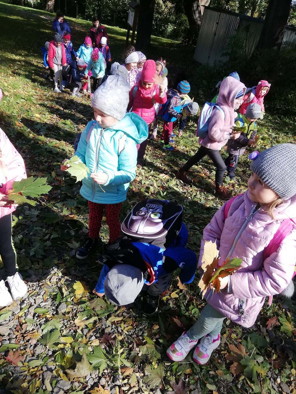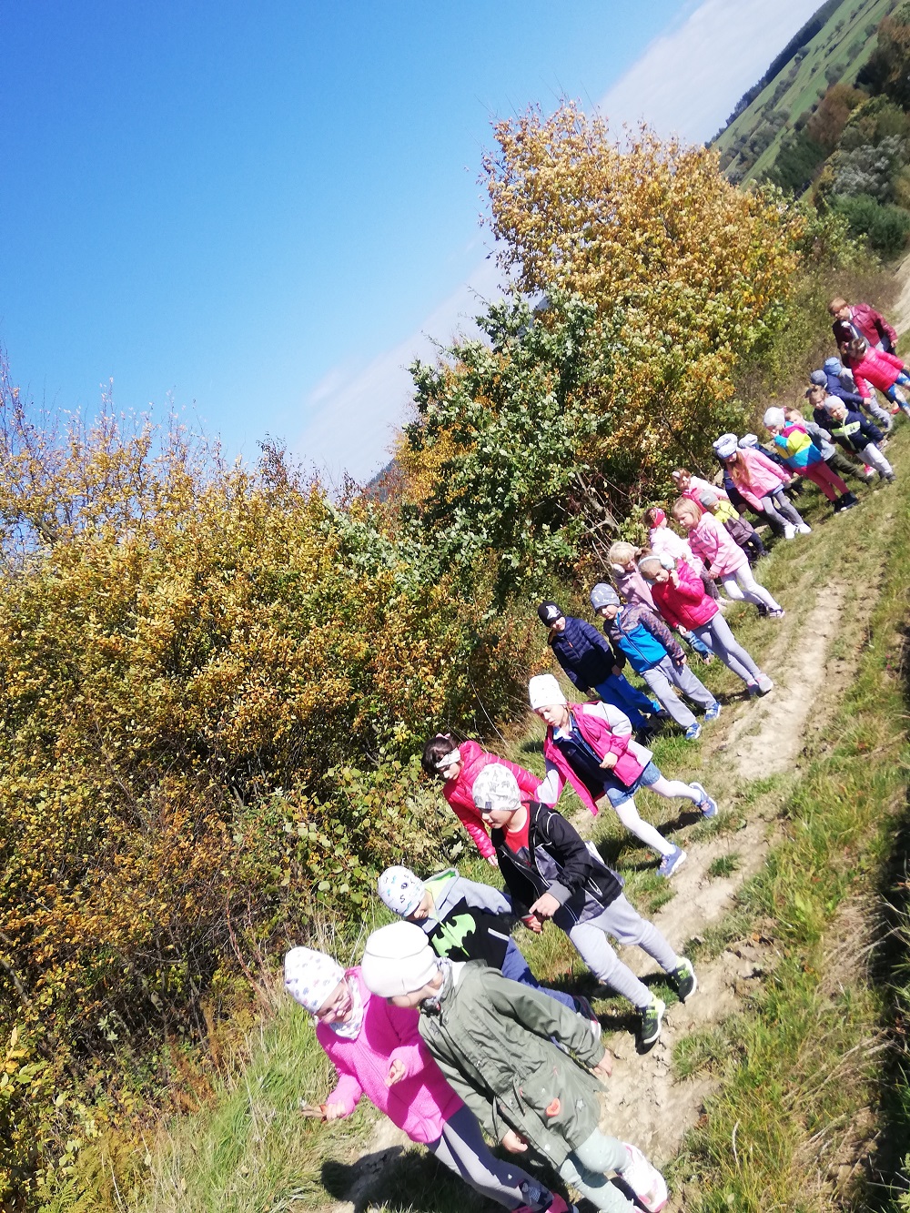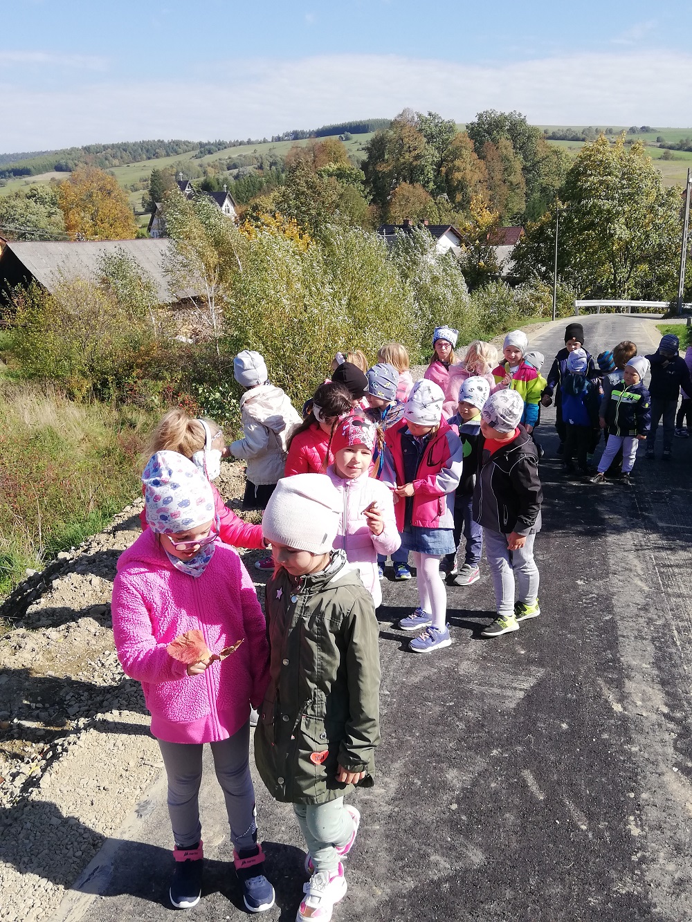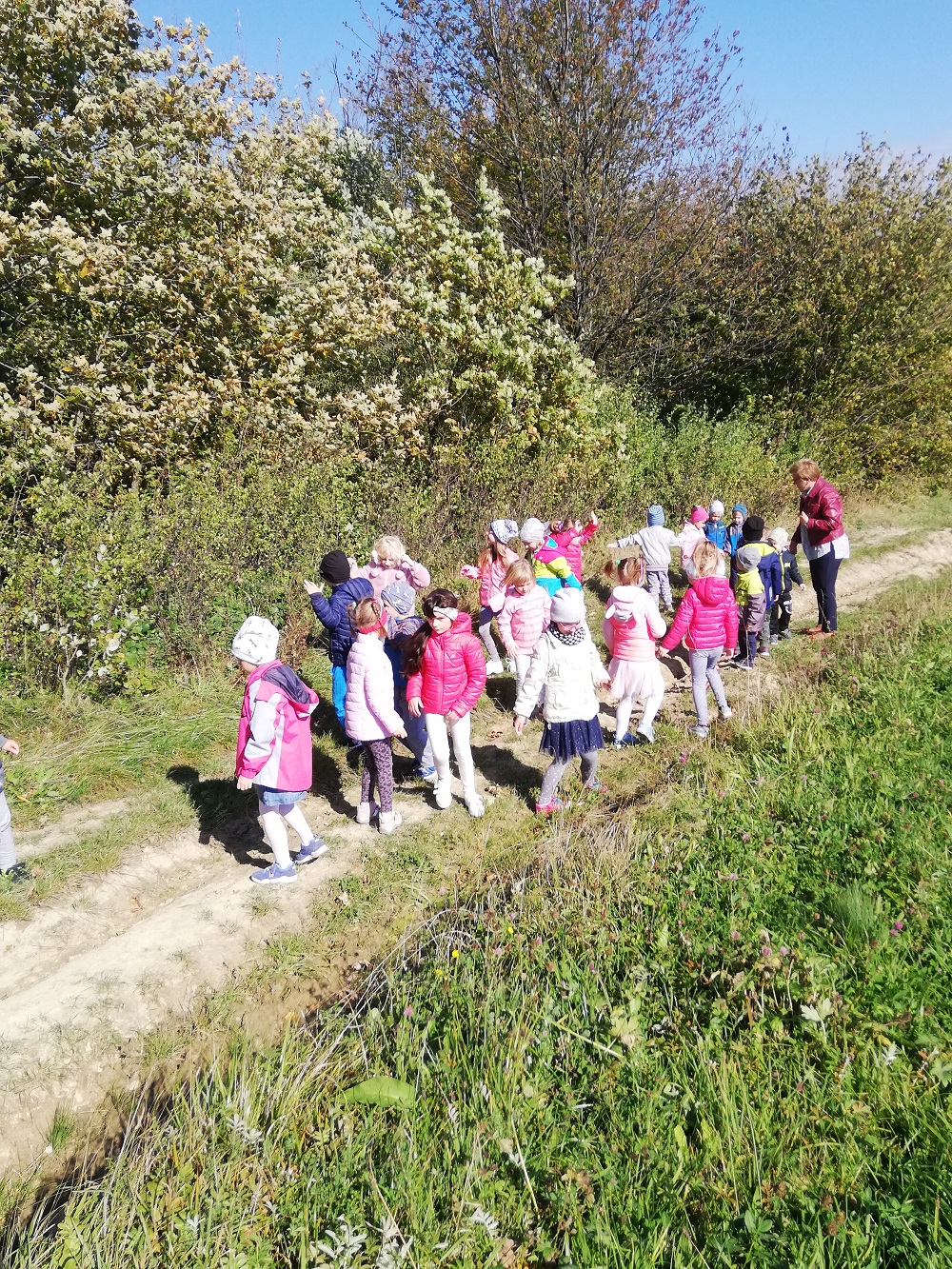 Korzystając z pięknej pogody, dzieci z grup przedszkolnych wybrały się na wycieczkę do pobliskiego lasu.