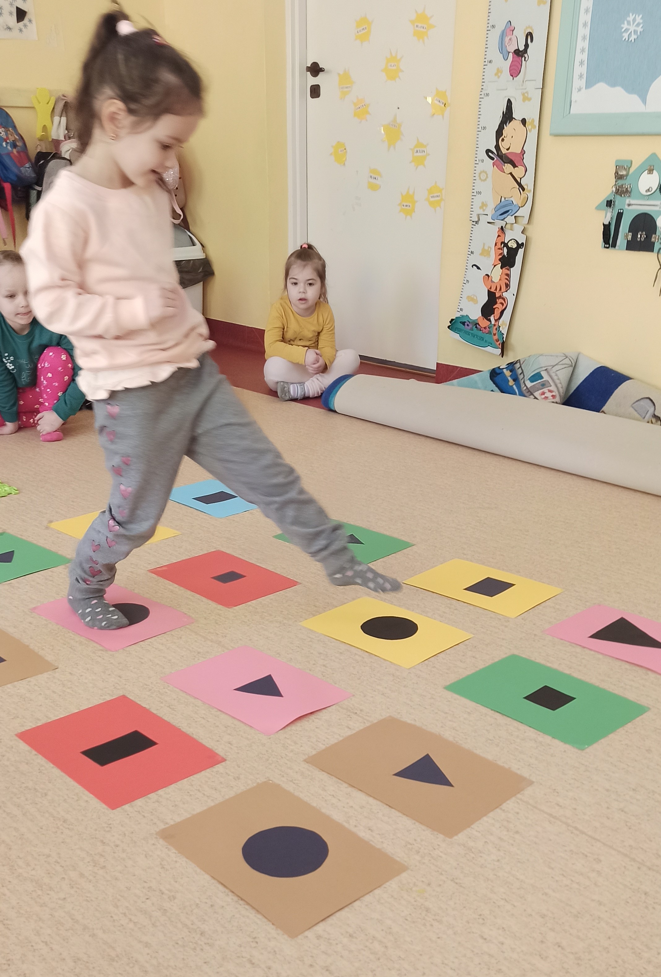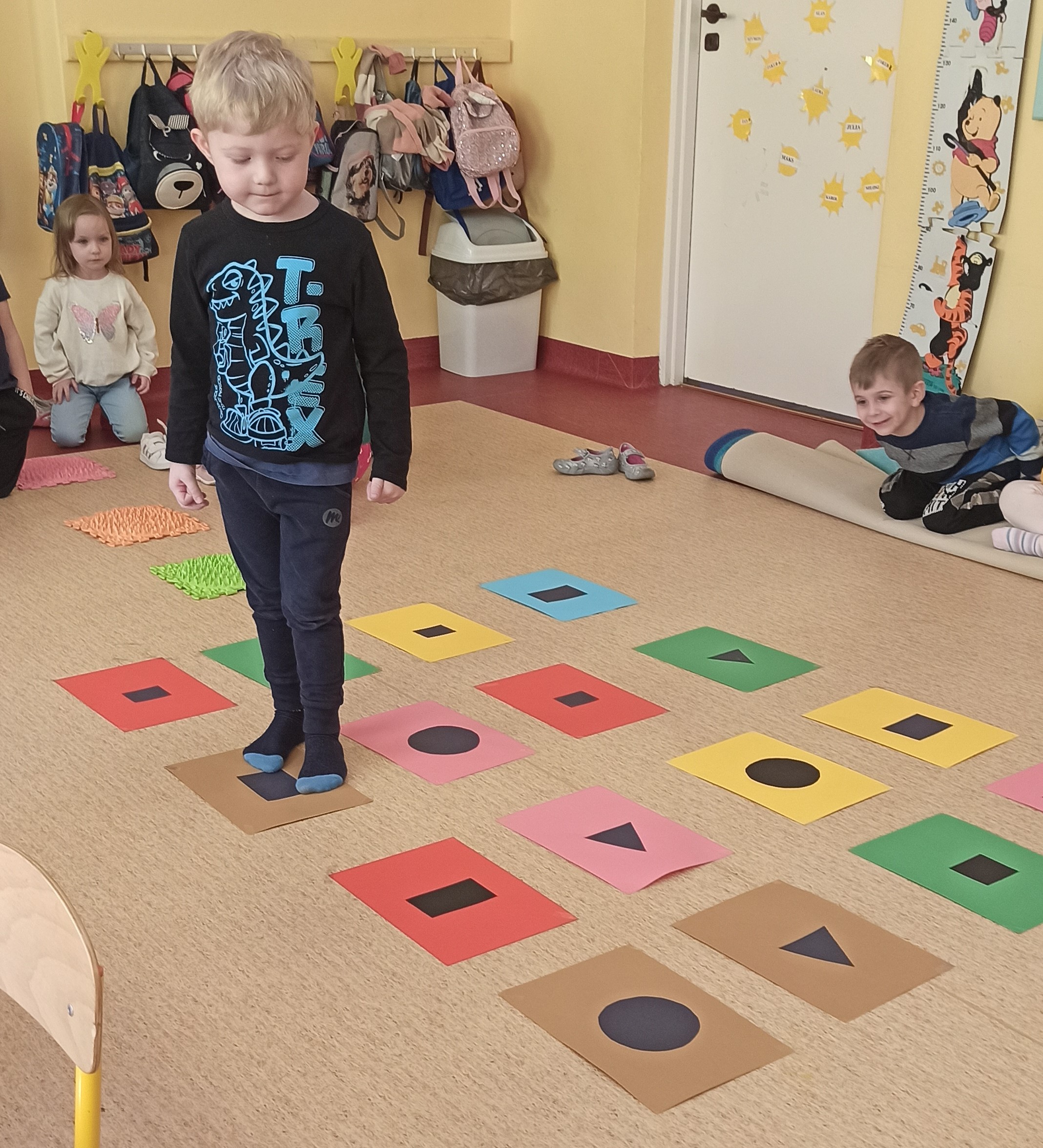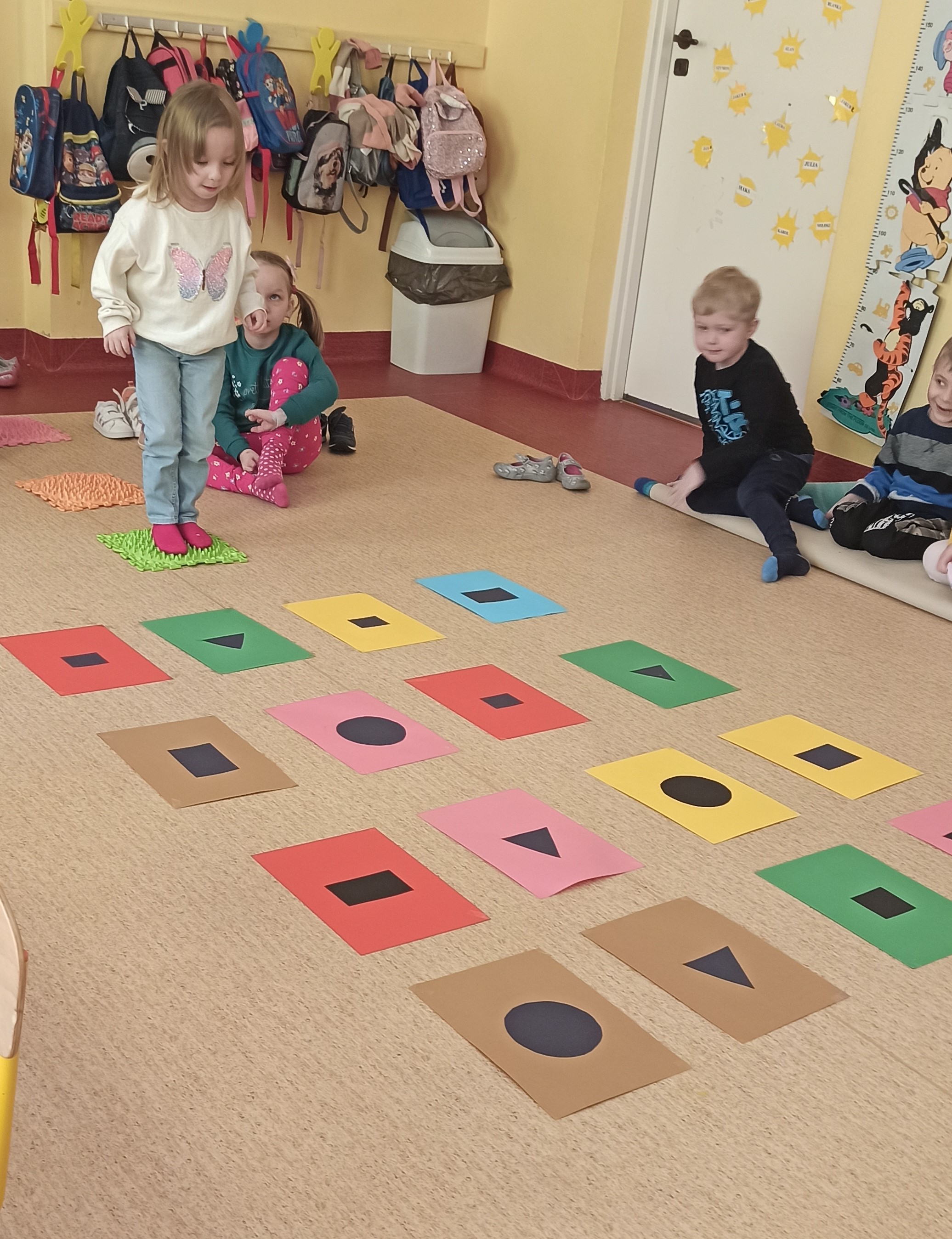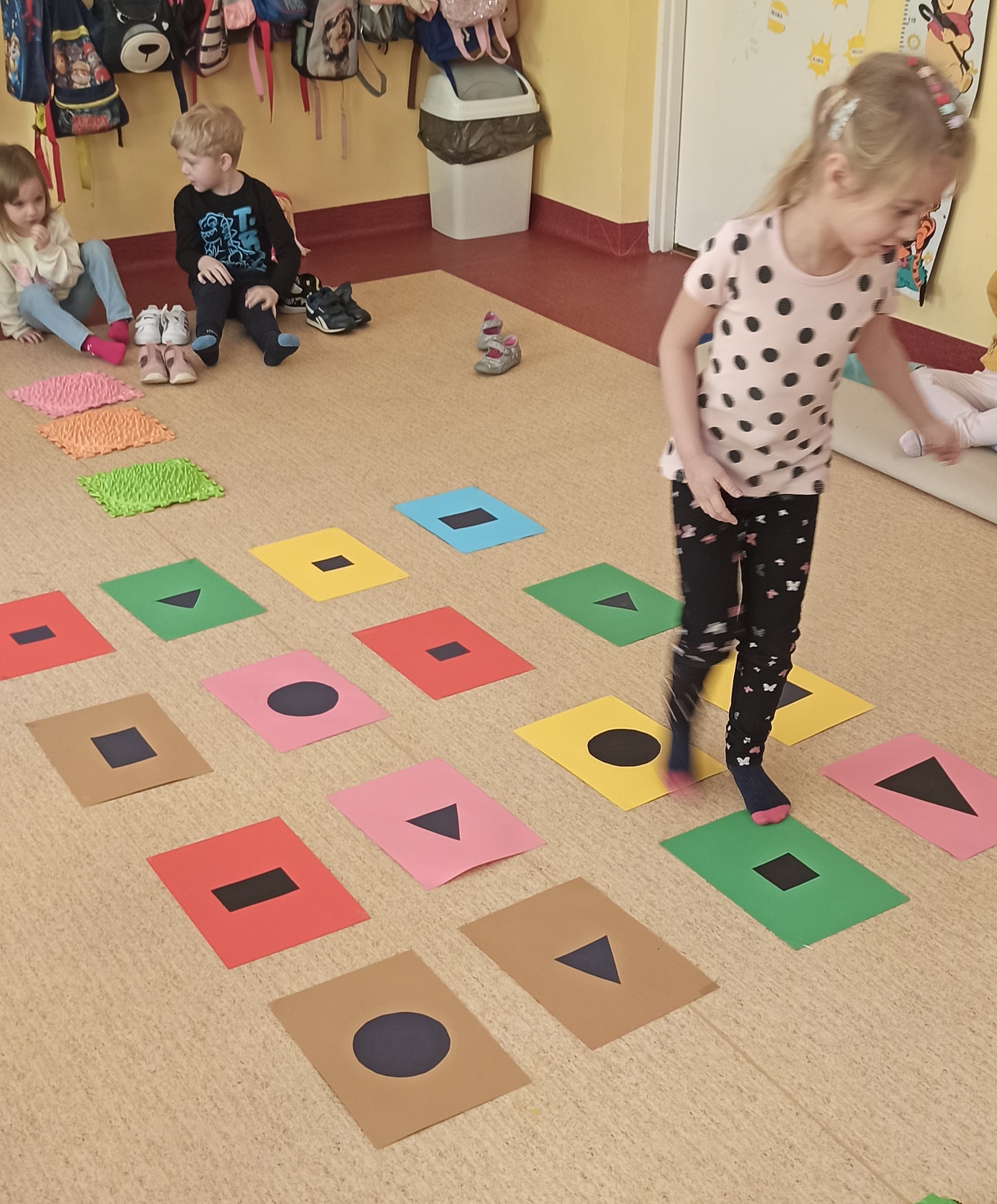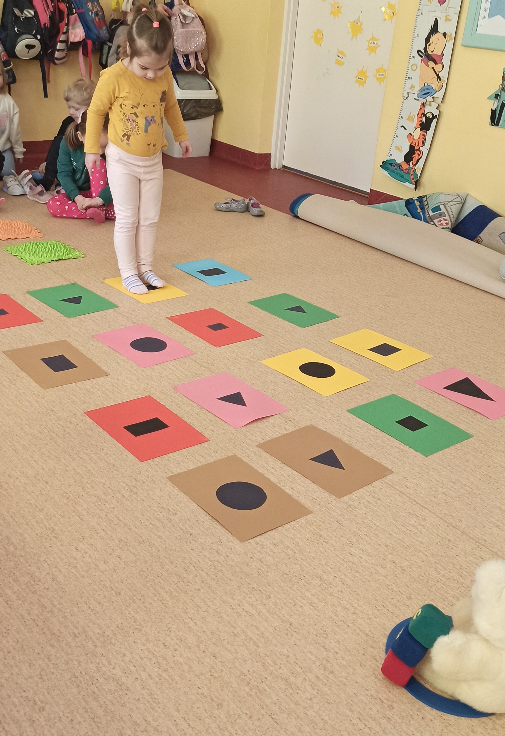 Zabawy sensoryczno- motoryczne to fajna propozycja dla przedszkolaków, które świetnie bawiły się w podskokach i utrwalały nazwy figur geometrycznych oraz budowały zamki. Dzieci przypomniały sobie także kolory oraz wybierały swoje ulubione zabawki, tj. misio, lalka, samochód lub klocki.