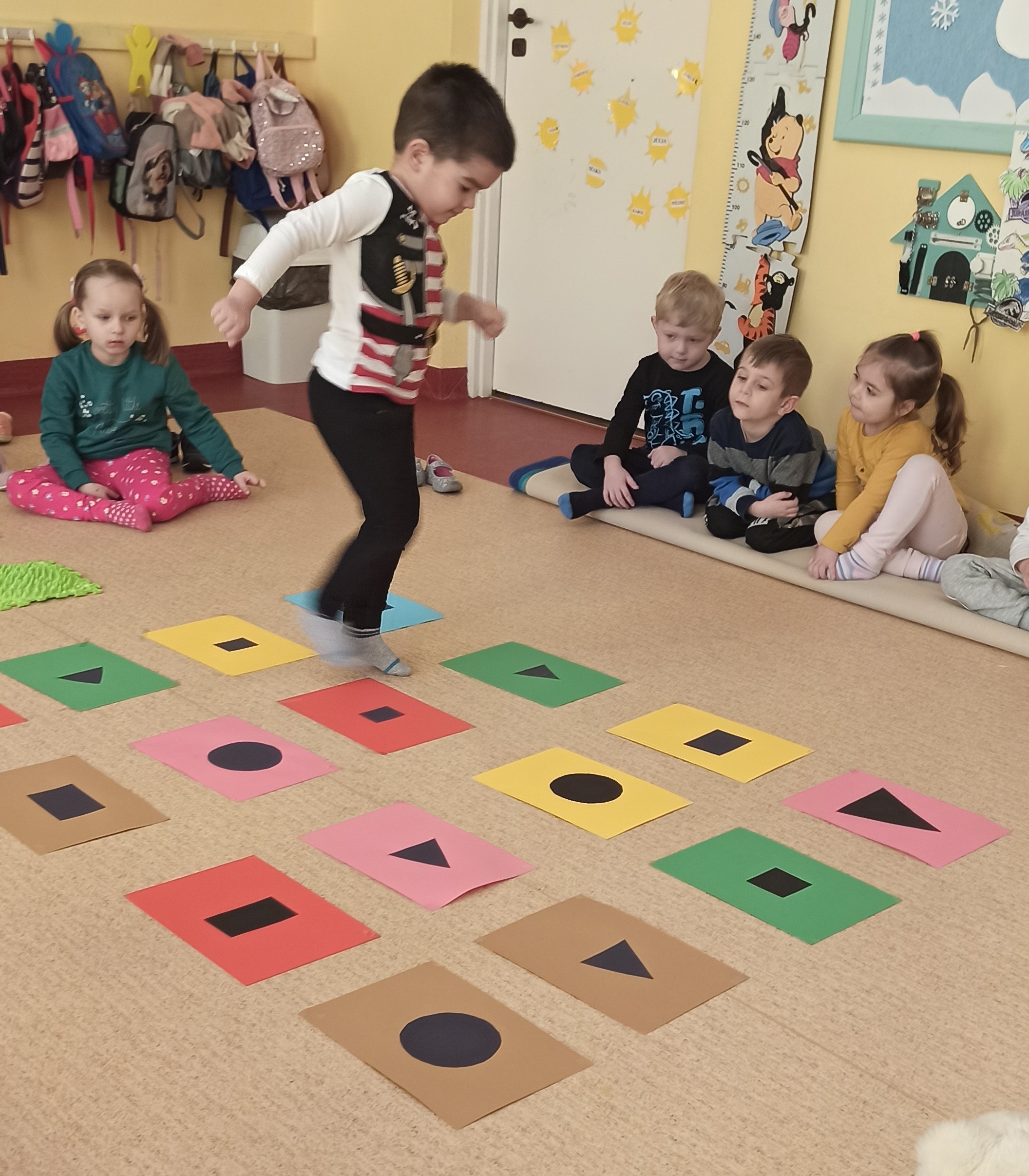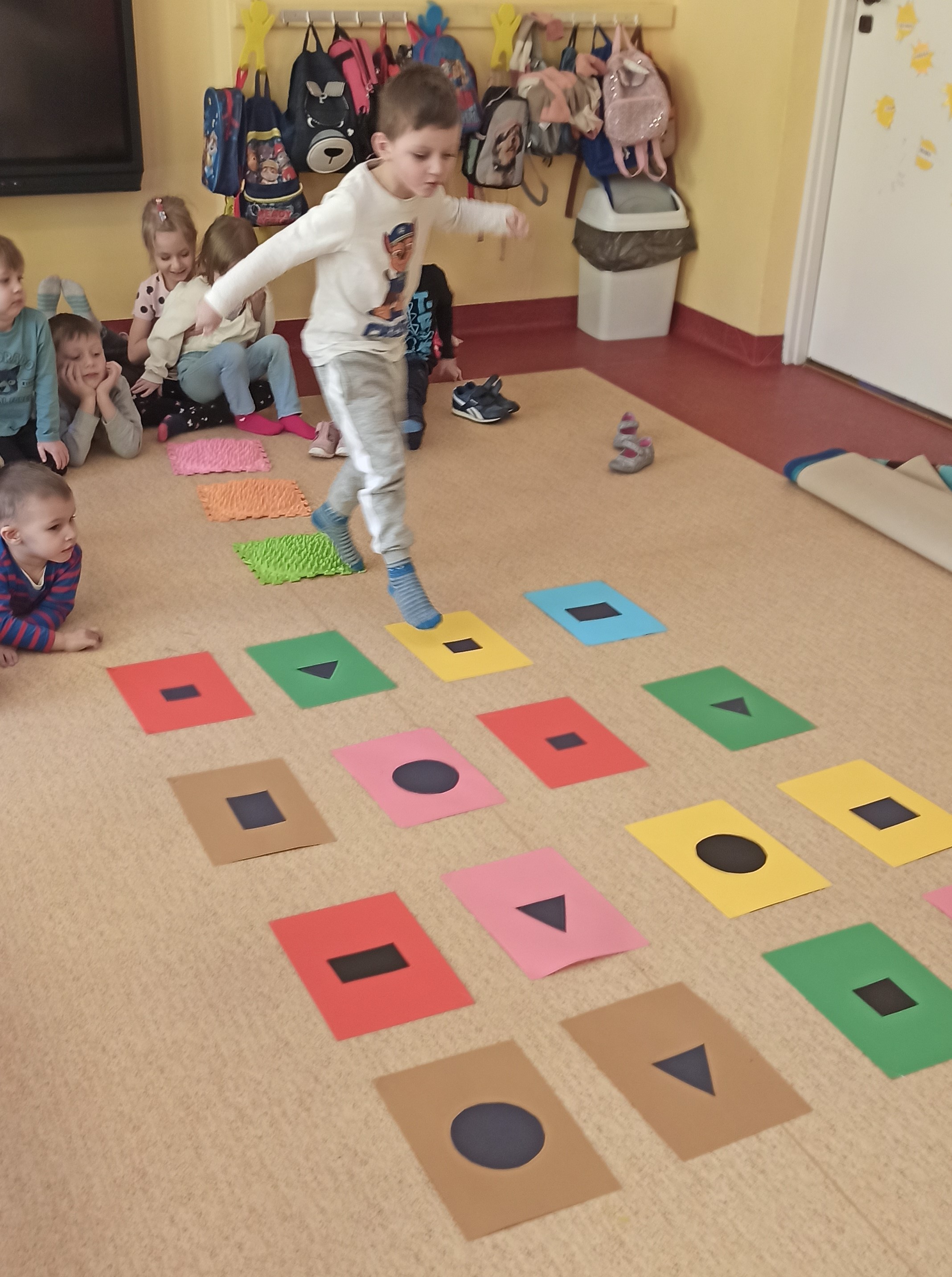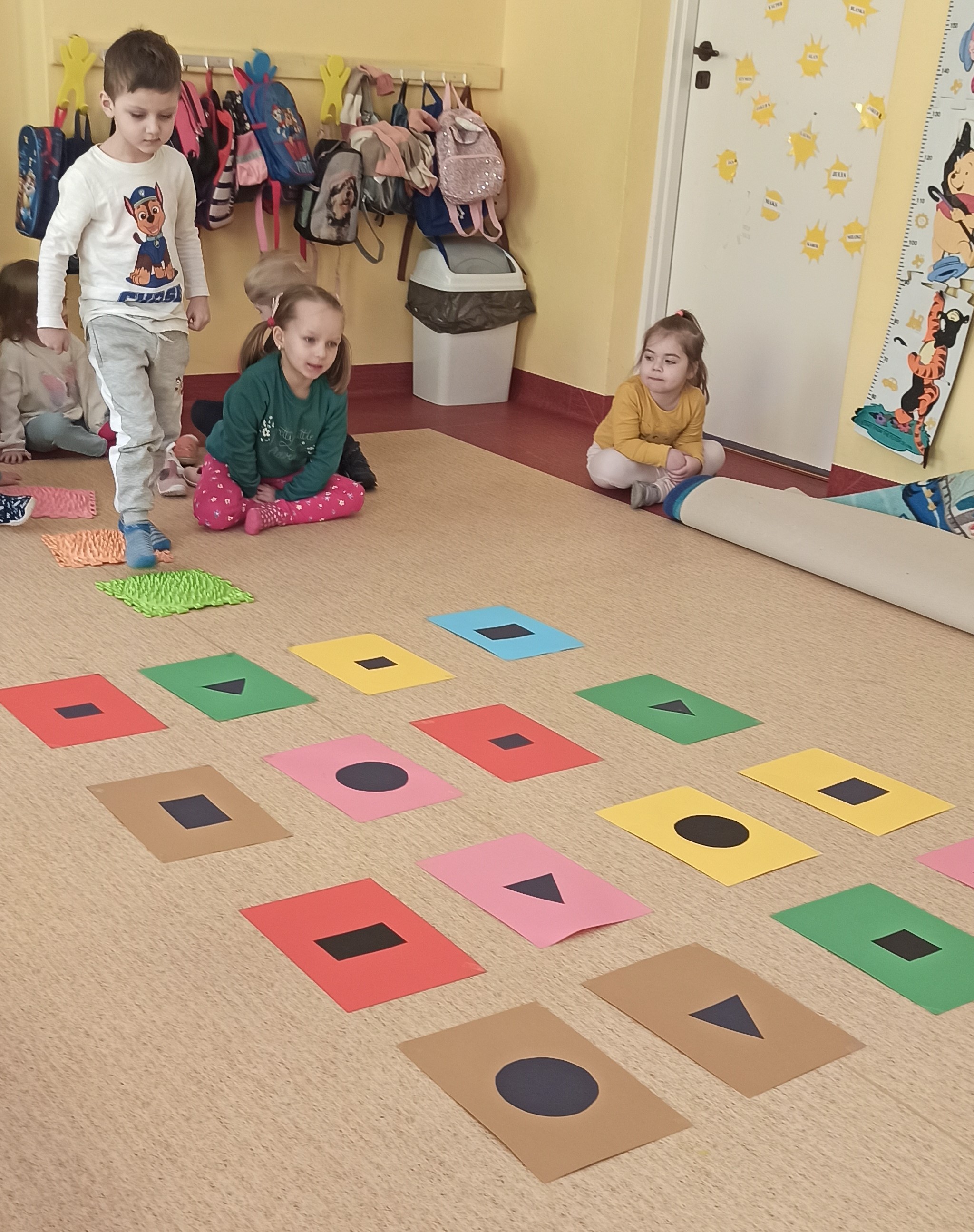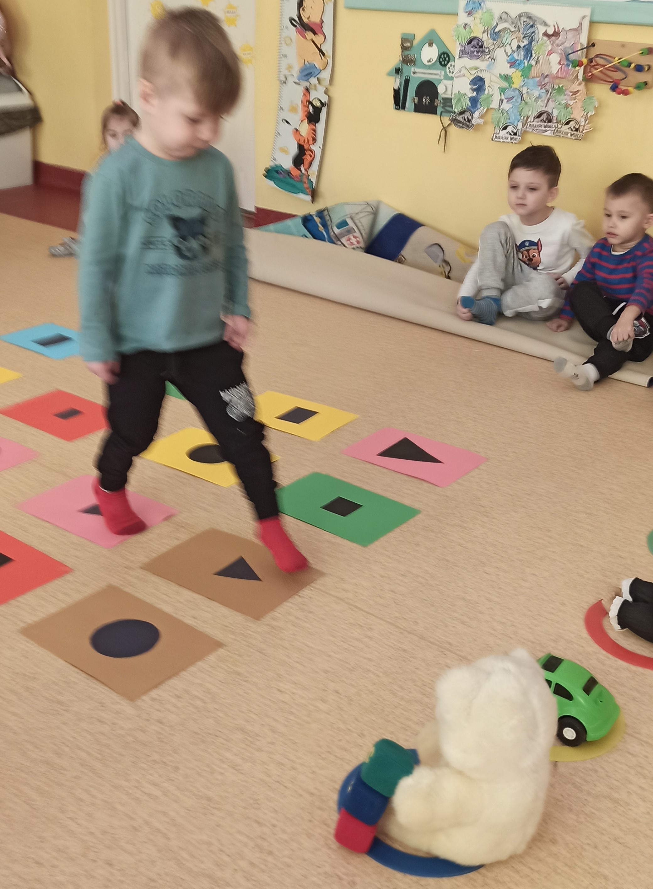 Zabawy sensoryczno- motoryczne to fajna propozycja dla przedszkolaków, które świetnie bawiły się w podskokach i utrwalały nazwy figur geometrycznych oraz budowały zamki. Dzieci przypomniały sobie także kolory oraz wybierały swoje ulubione zabawki, tj. misio, lalka, samochód lub klocki.