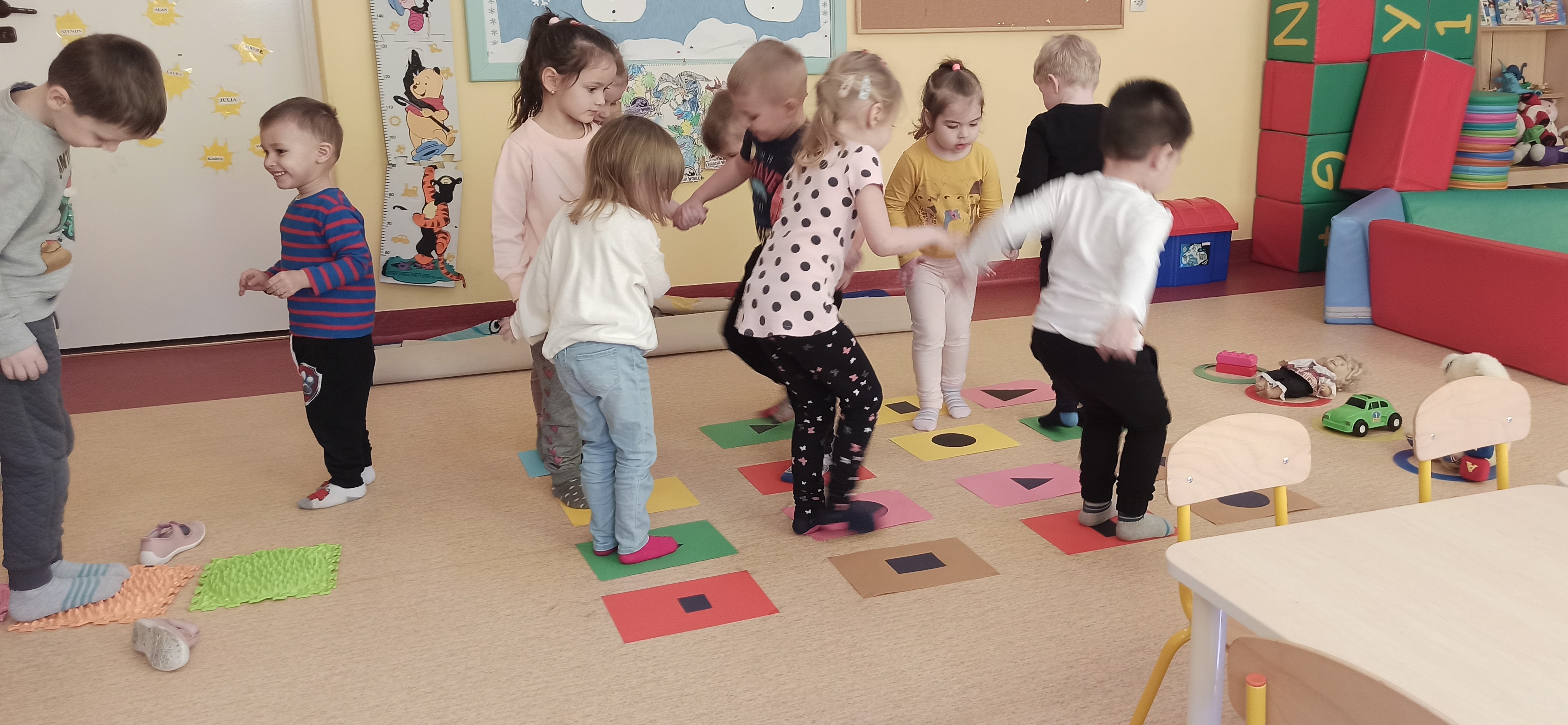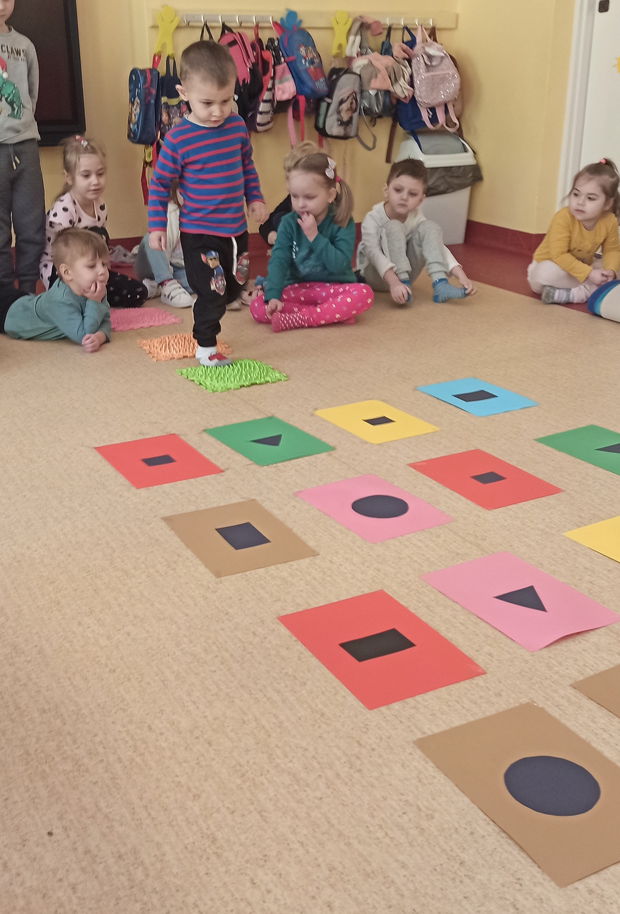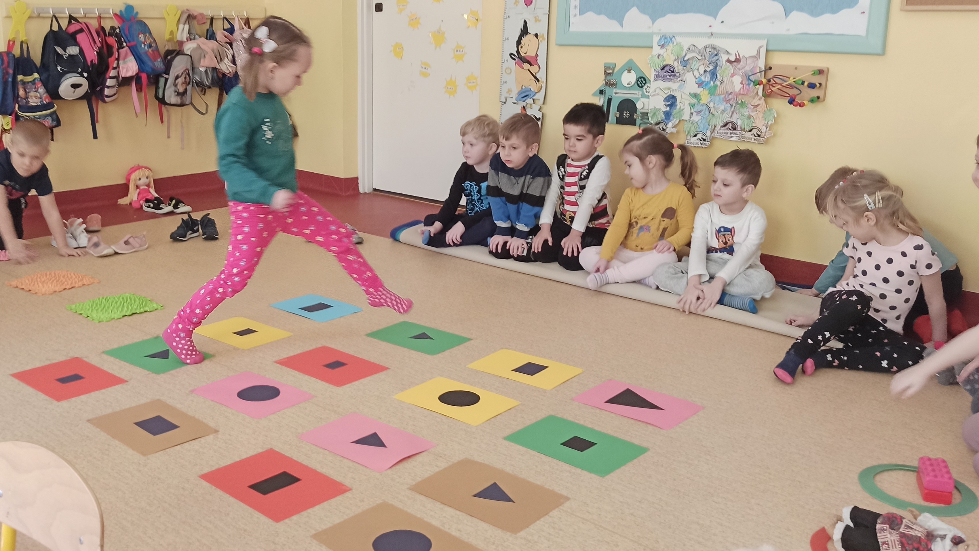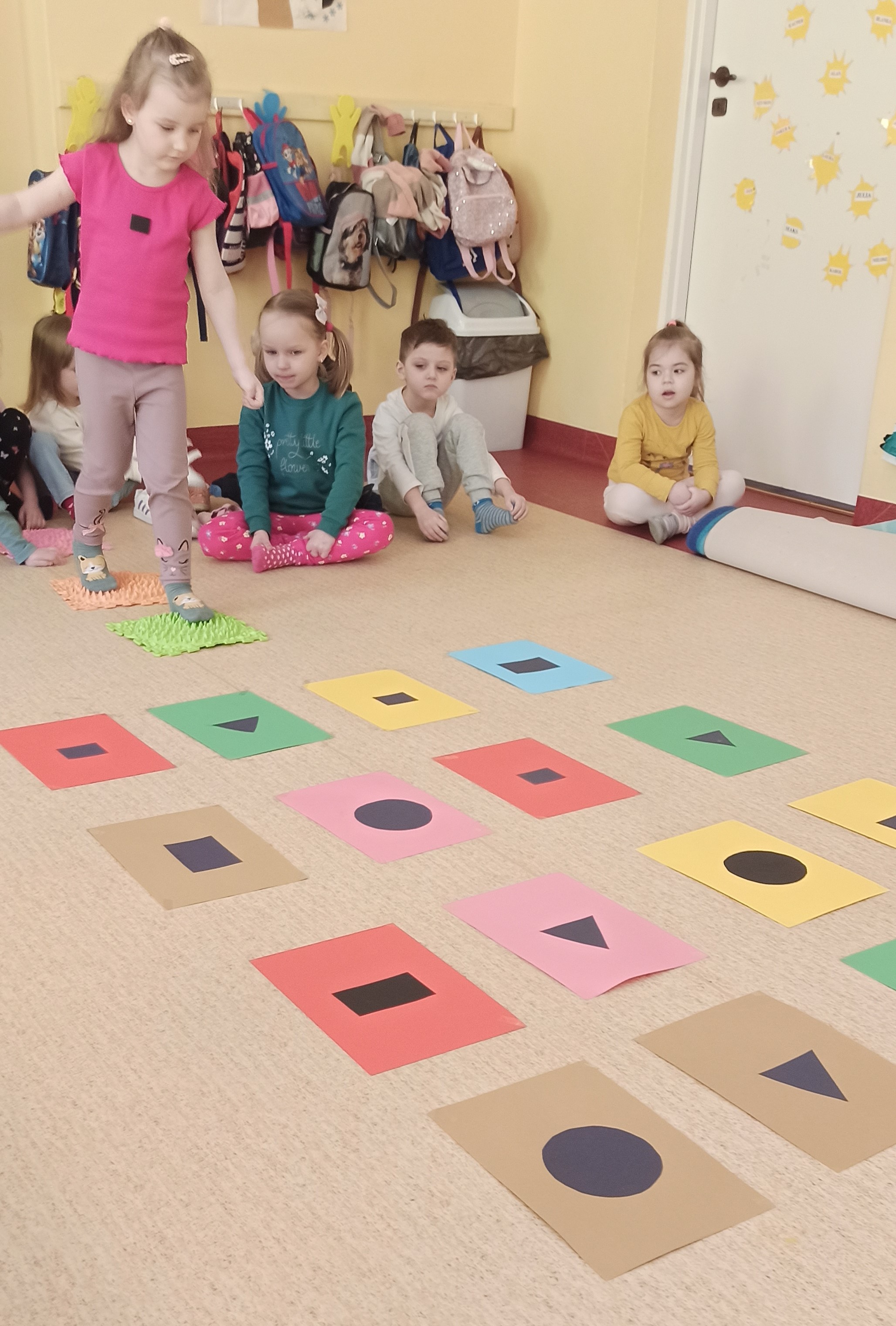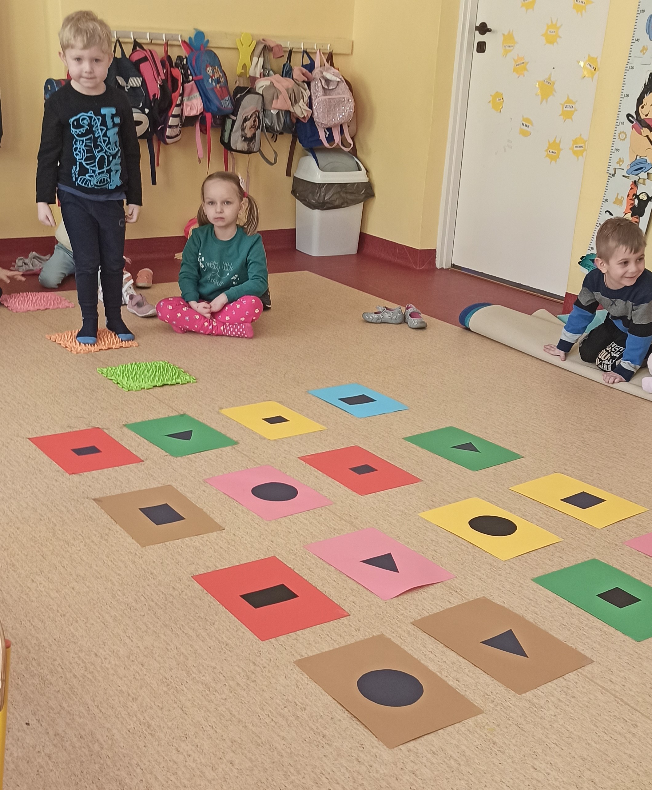 Zabawy sensoryczno- motoryczne to fajna propozycja dla przedszkolaków, które świetnie bawiły się w podskokach i utrwalały nazwy figur geometrycznych oraz budowały zamki. Dzieci przypomniały sobie także kolory oraz wybierały swoje ulubione zabawki, tj. misio, lalka, samochód lub klocki.