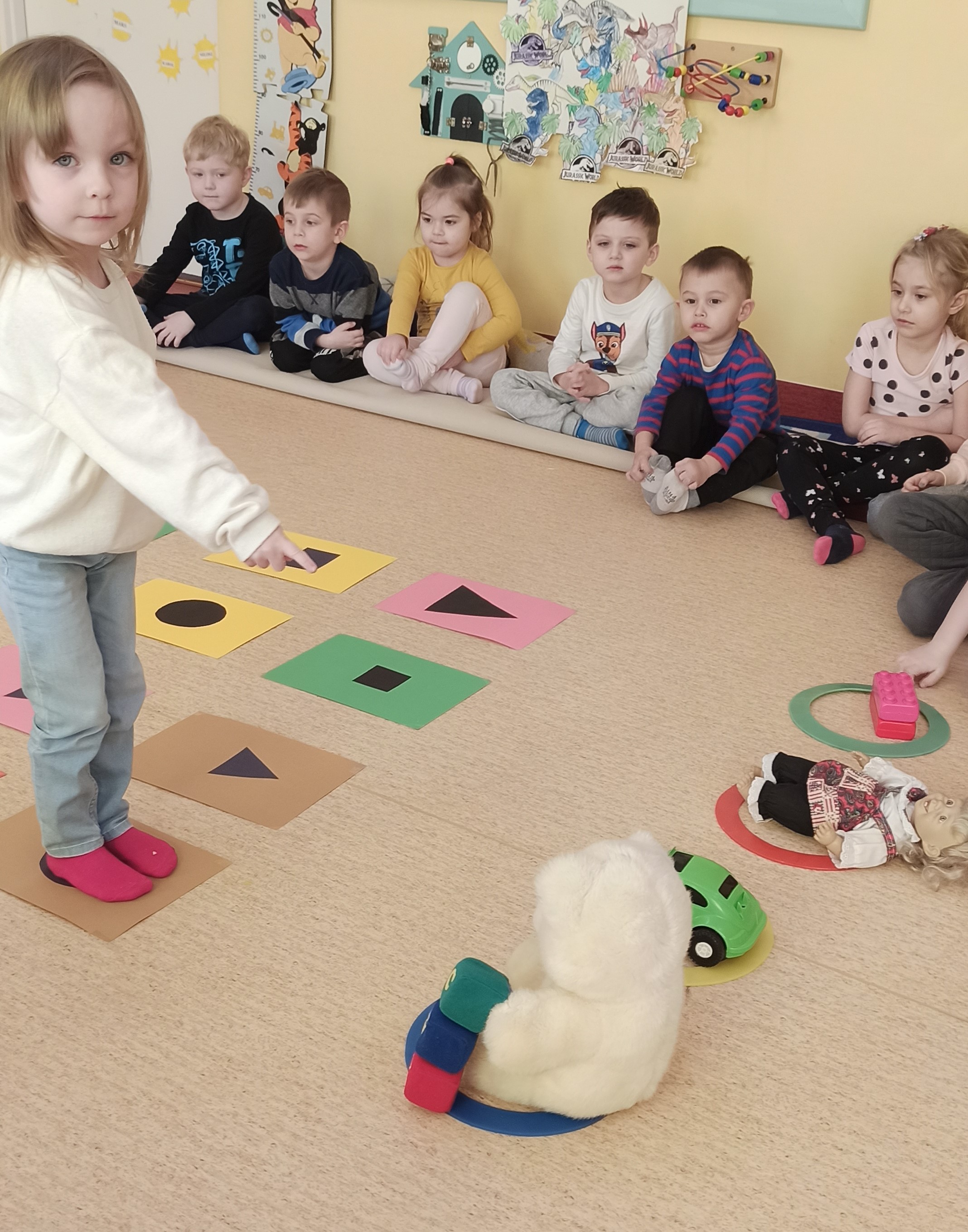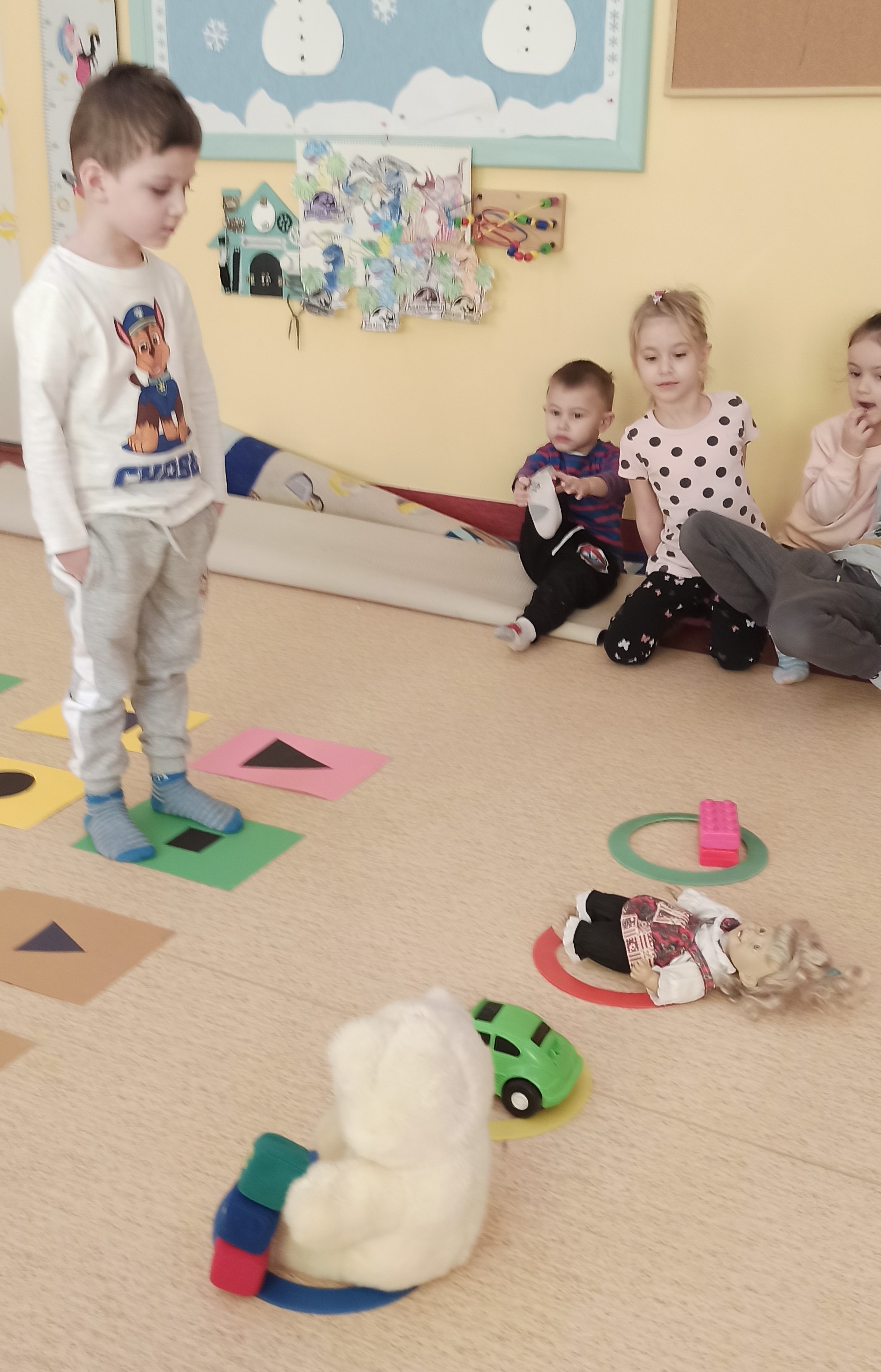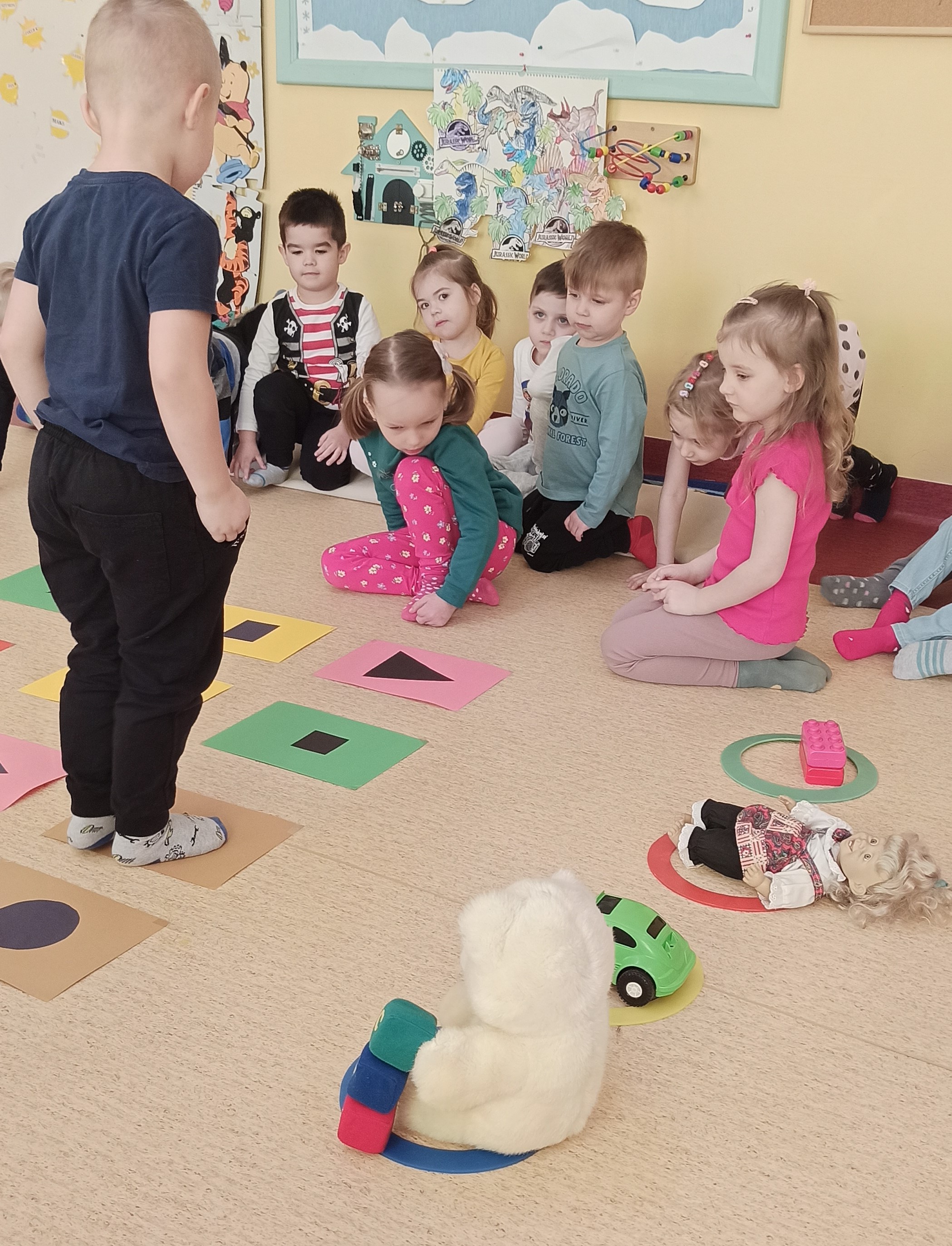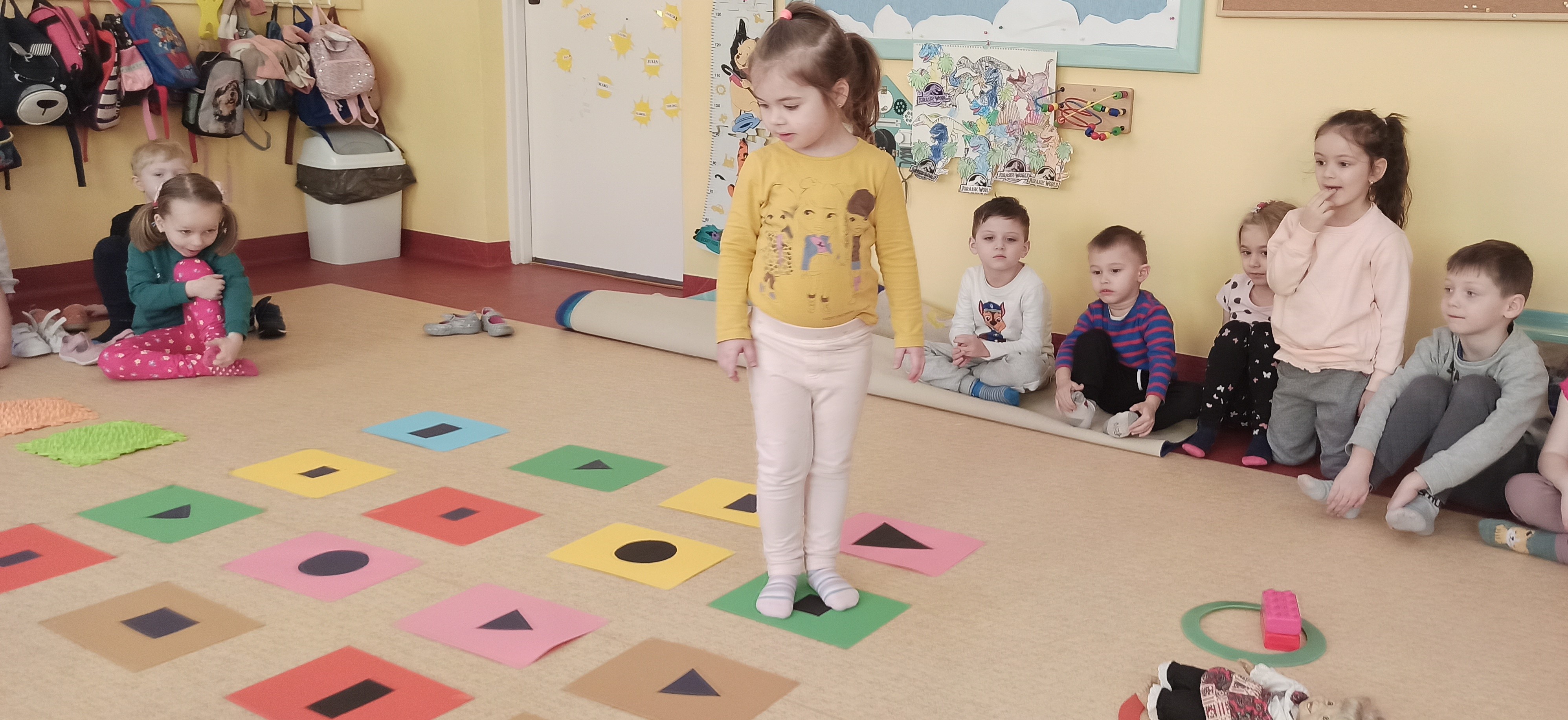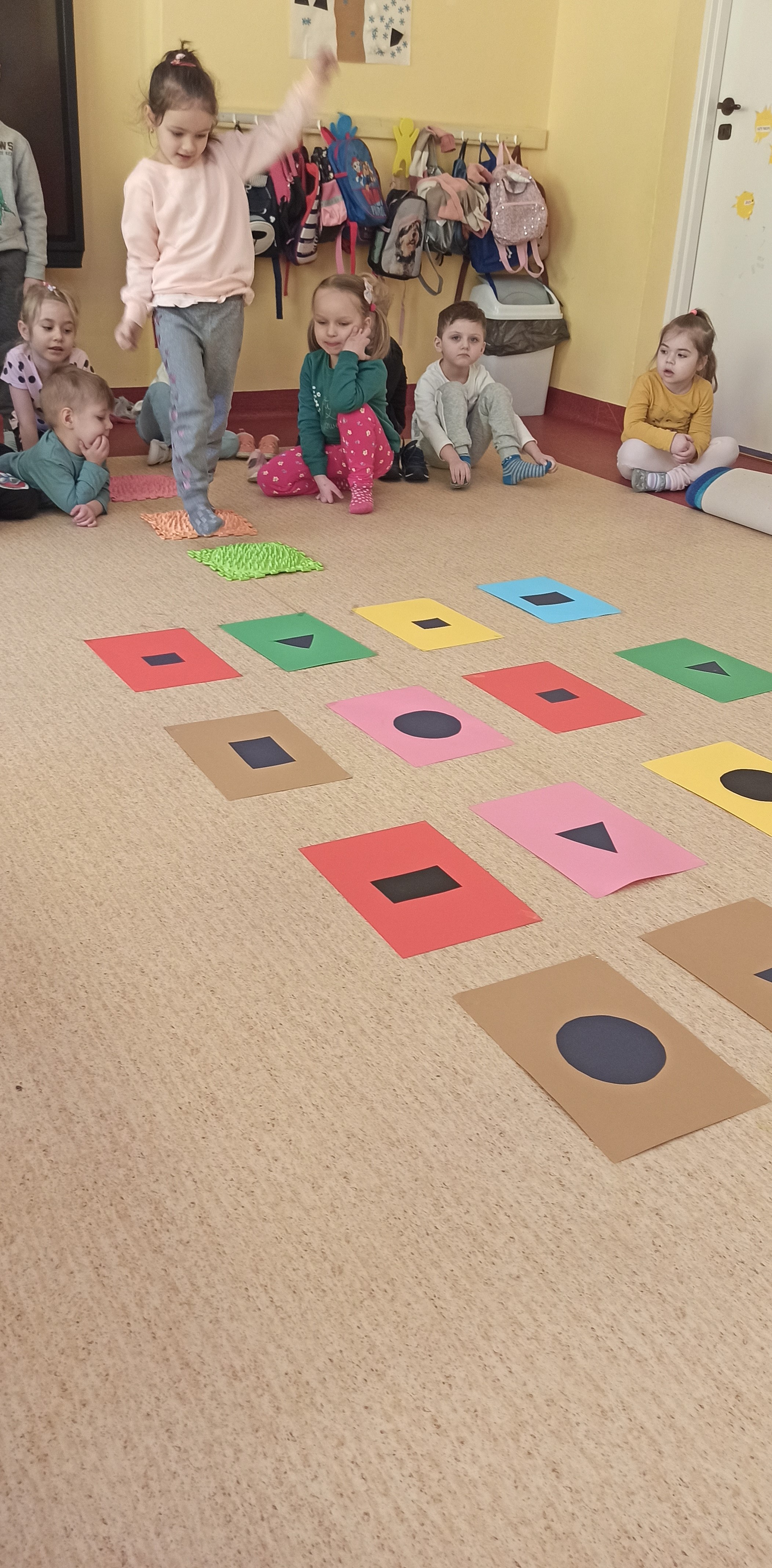 Zabawy sensoryczno- motoryczne to fajna propozycja dla przedszkolaków, które świetnie bawiły się w podskokach i utrwalały nazwy figur geometrycznych oraz budowały zamki. Dzieci przypomniały sobie także kolory oraz wybierały swoje ulubione zabawki, tj. misio, lalka, samochód lub klocki.