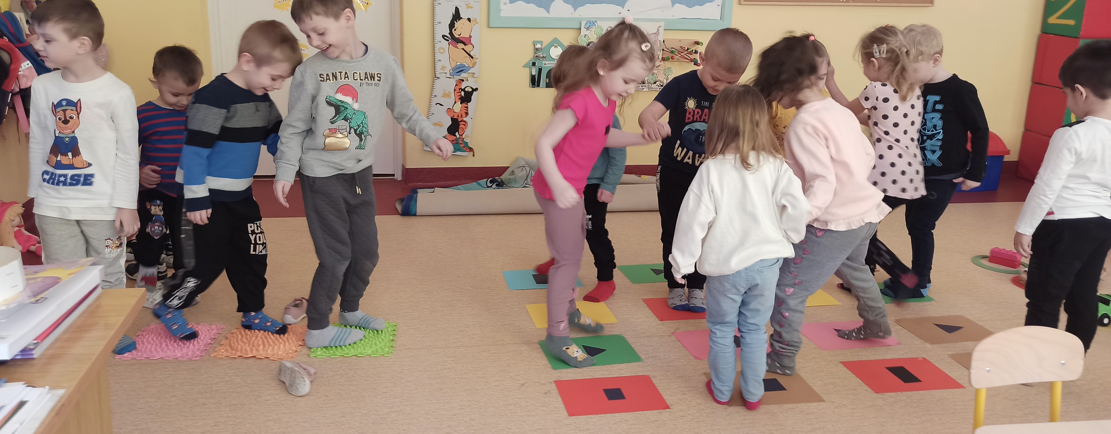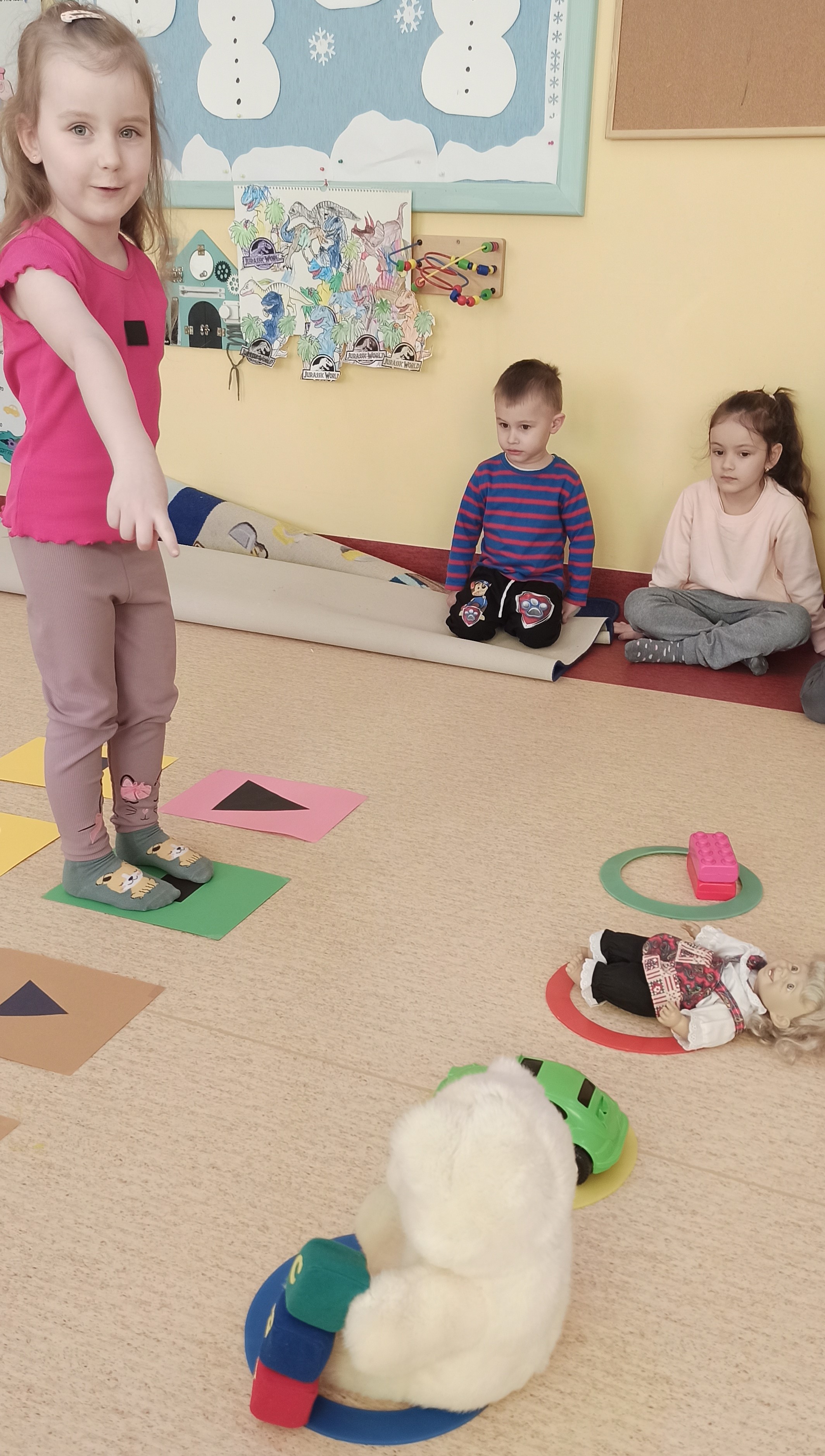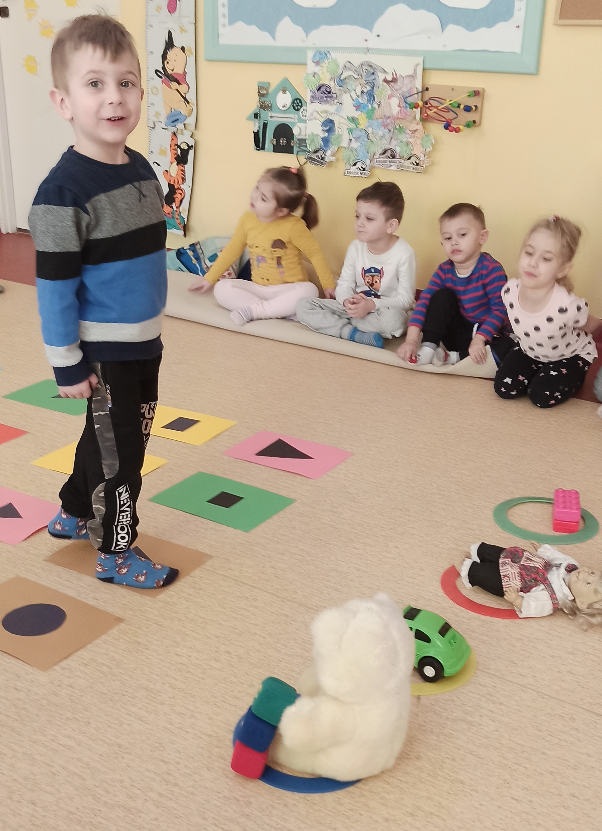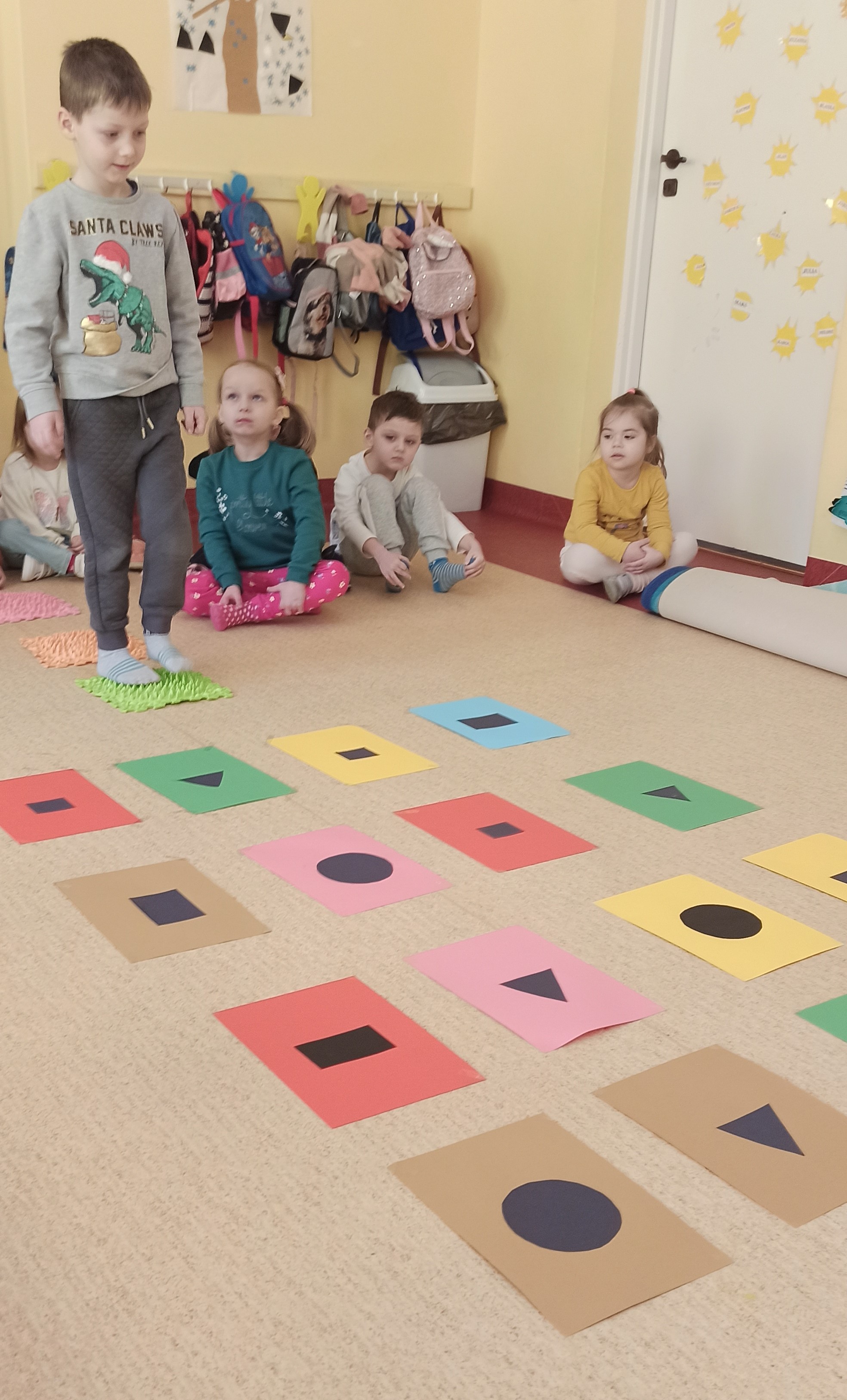 Zabawy sensoryczno- motoryczne to fajna propozycja dla przedszkolaków, które świetnie bawiły się w podskokach i utrwalały nazwy figur geometrycznych oraz budowały zamki. Dzieci przypomniały sobie także kolory oraz wybierały swoje ulubione zabawki, tj. misio, lalka, samochód lub klocki.