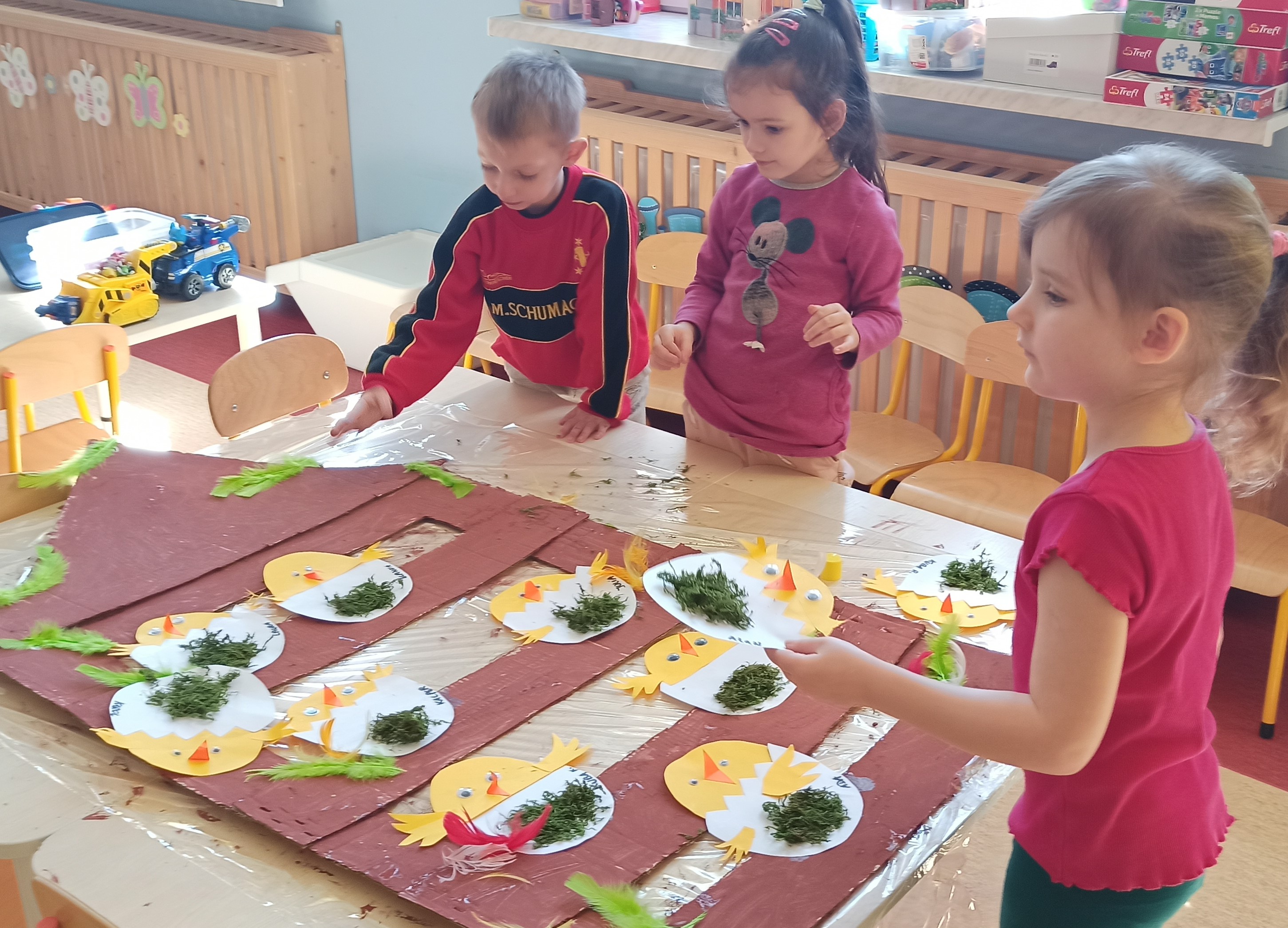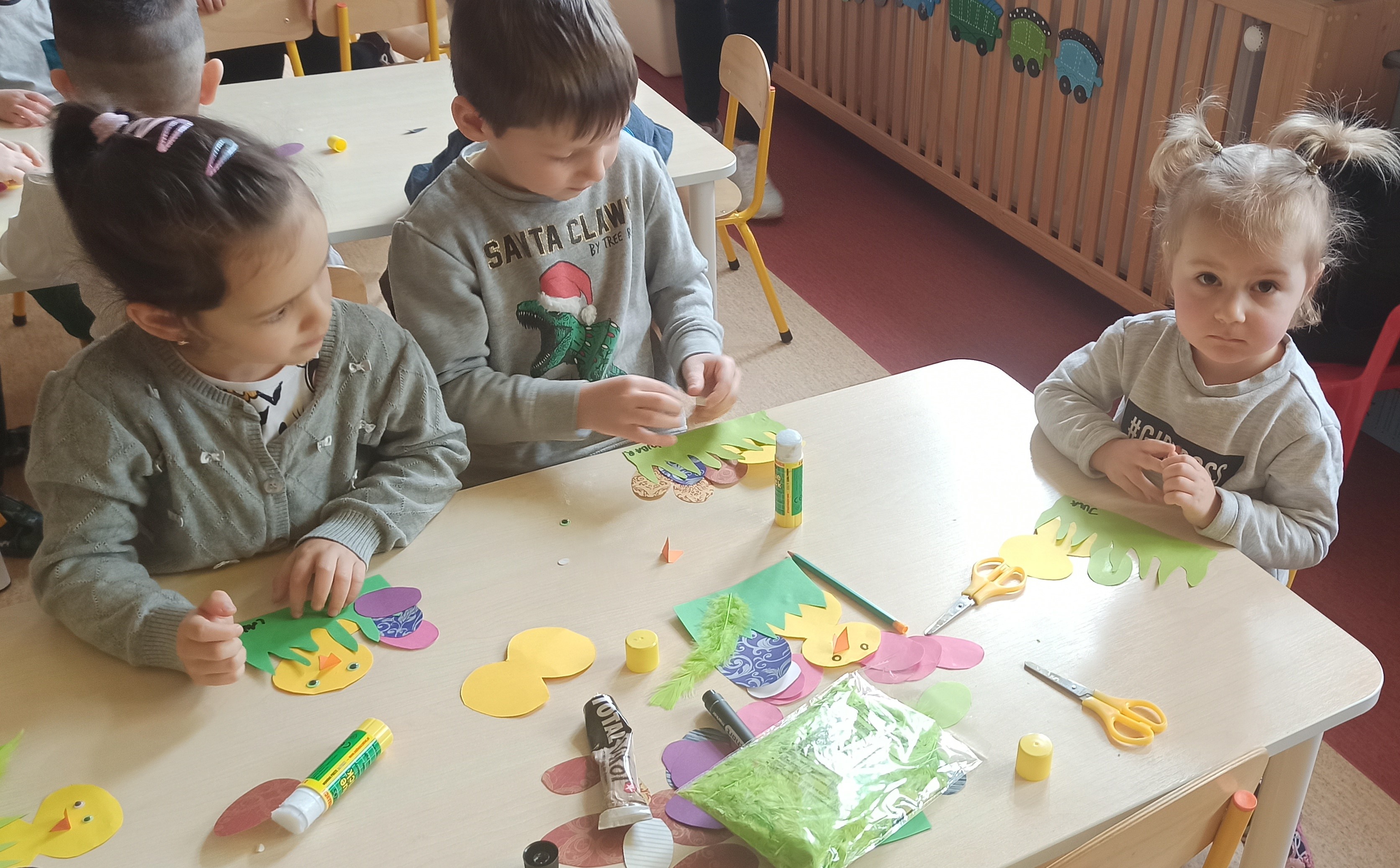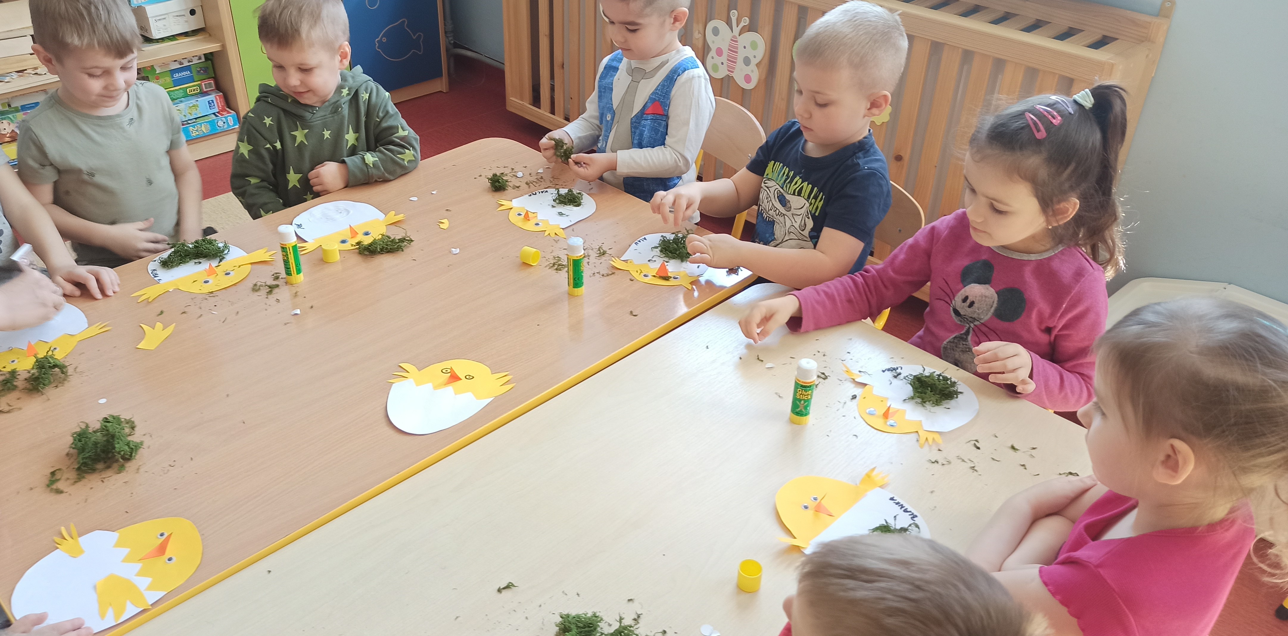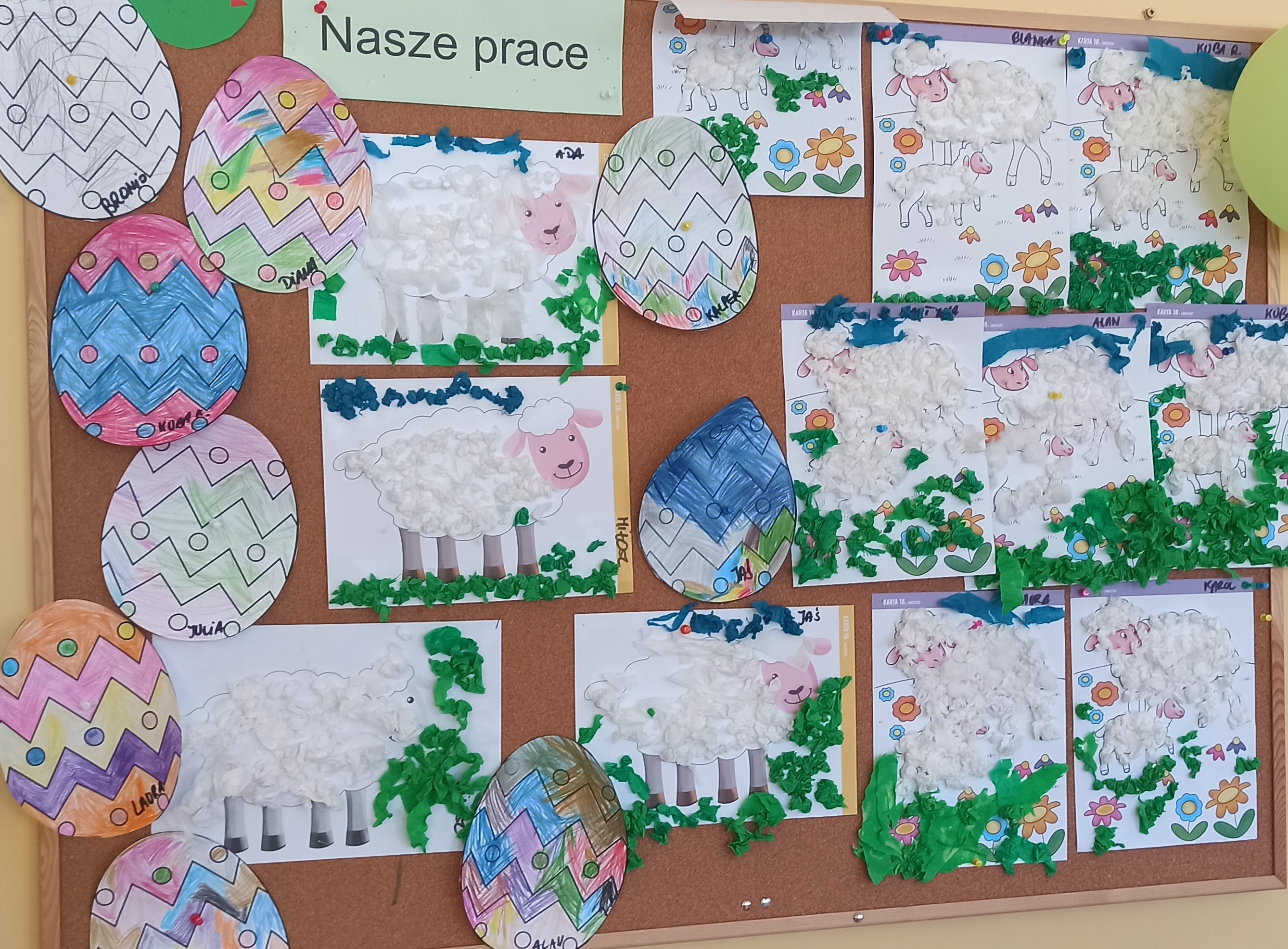 Maluchy oraz dzieci z oddziału „0” wykonały piękne, żółte pisklaki. Miały okazję poznać zwyczaj siania rzeżuchy, nie zabrakło „Śmigusa- dyngusa”, pokarmów, które wkładamy do wielkanocnej święconki. Malowanie pisanek, nauka wierszyka „Cukrowy baranek”, składanie życzeń to wszystko dzieci miały okazję poznać w przedszkolu.
