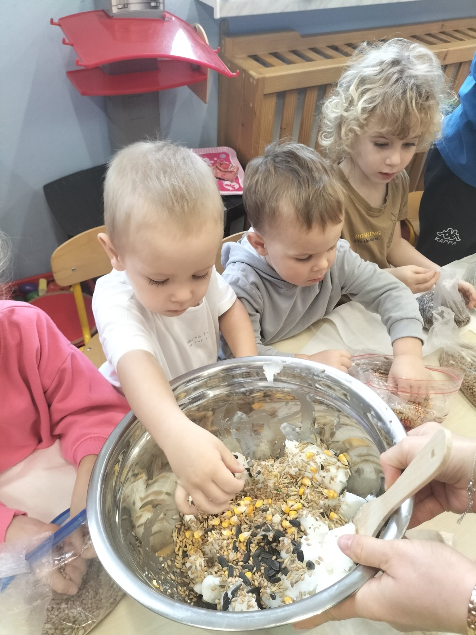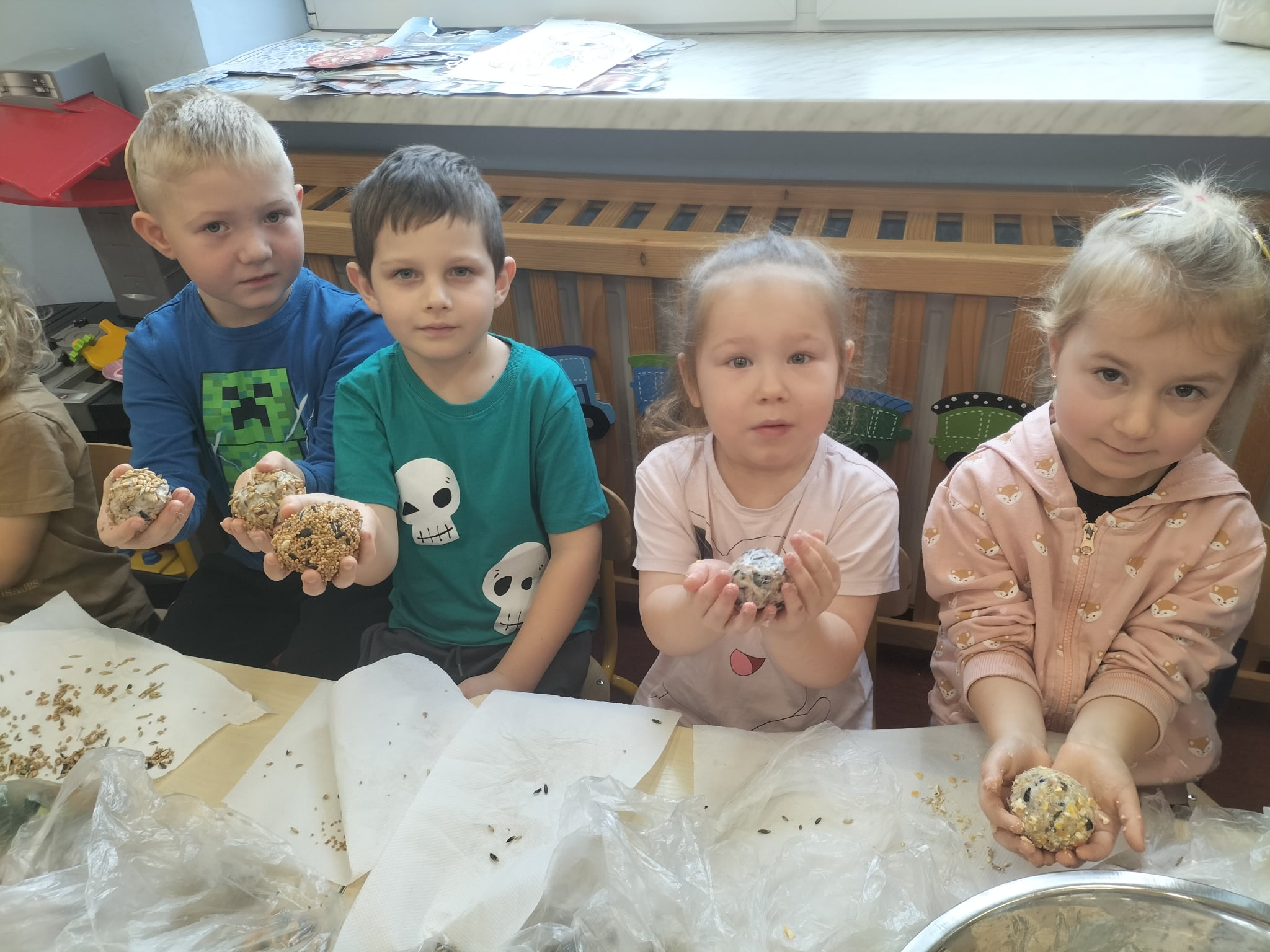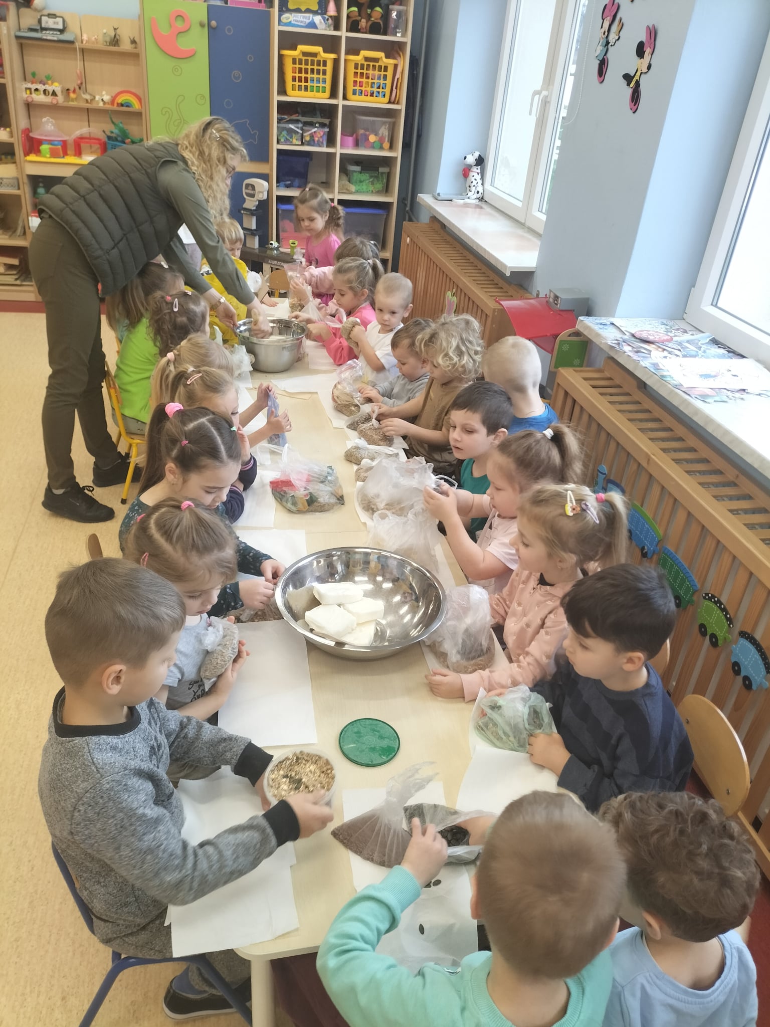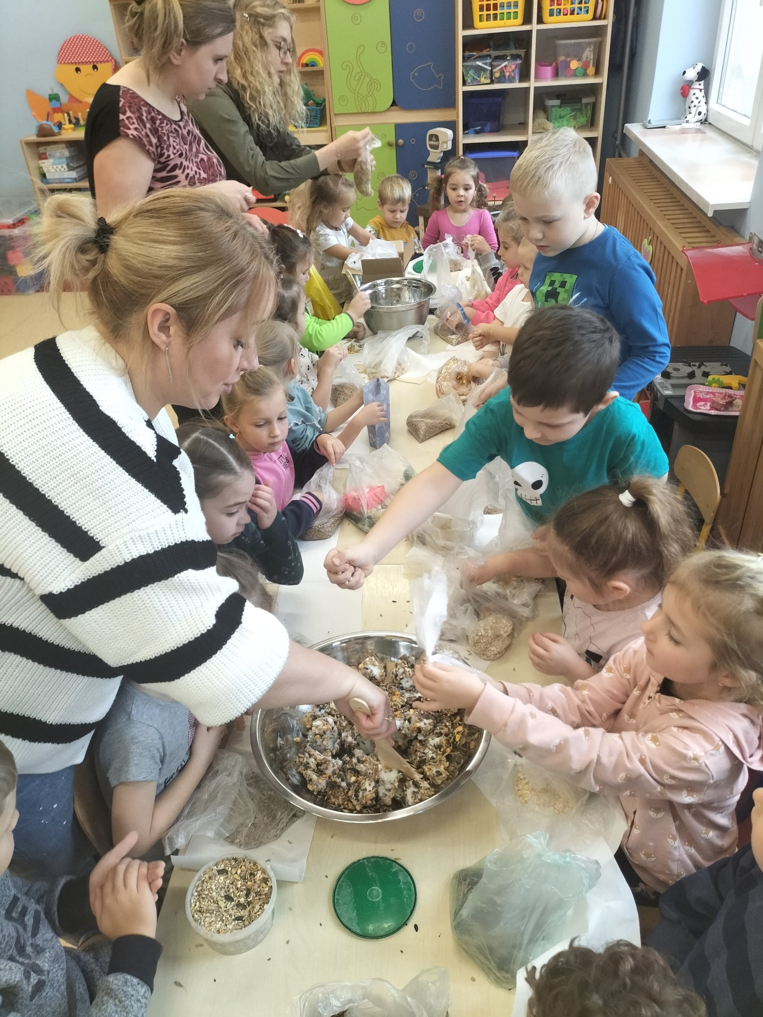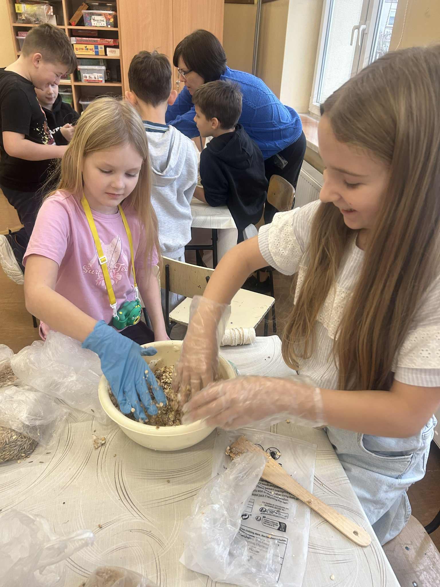 Kulminacją spotkania było tworzenie kul tłuszczowych dla ptaków. Dzieci mieszały ziarna i nasiona ze smalcem, a następnie formowały z nich kule.