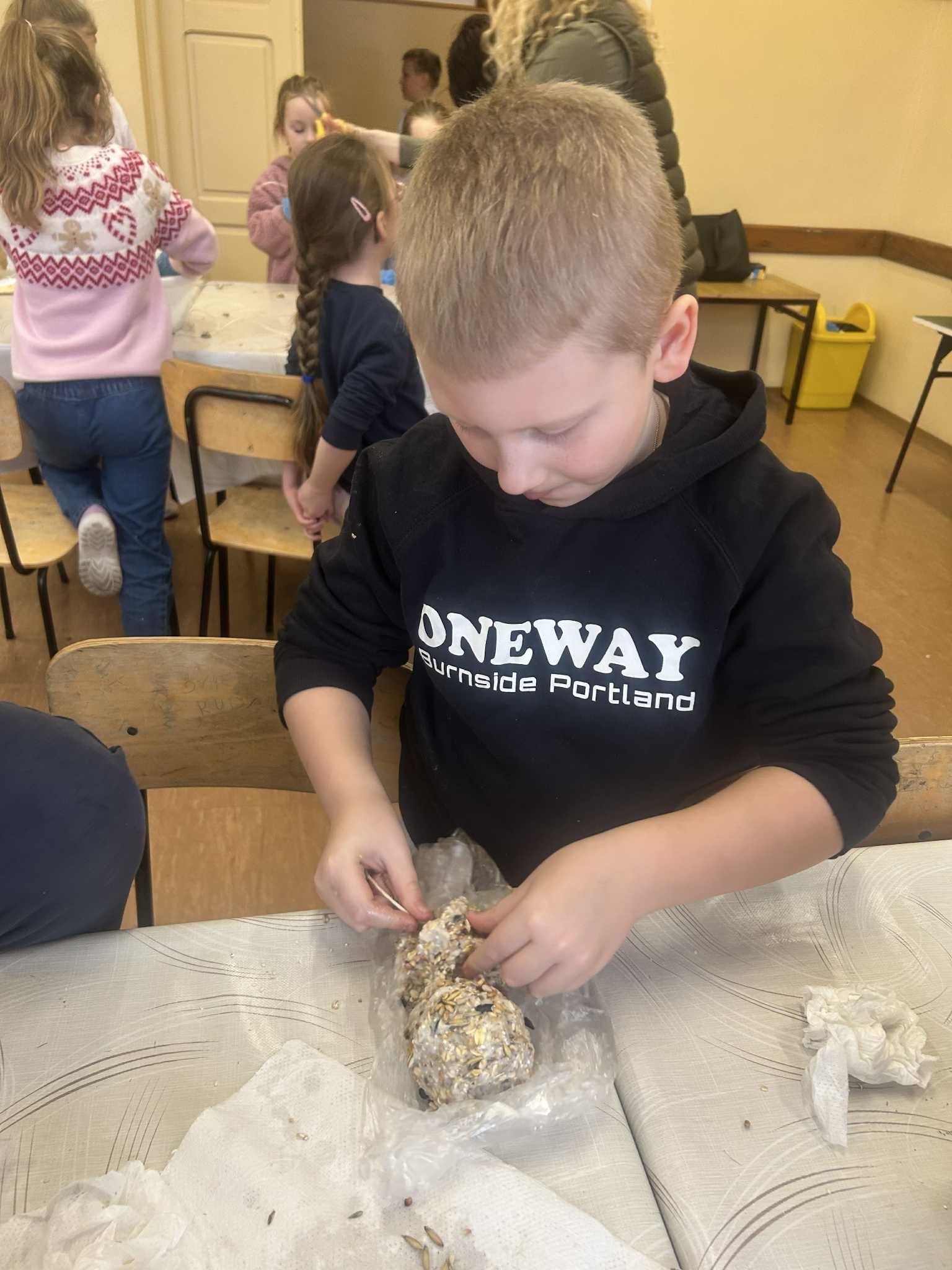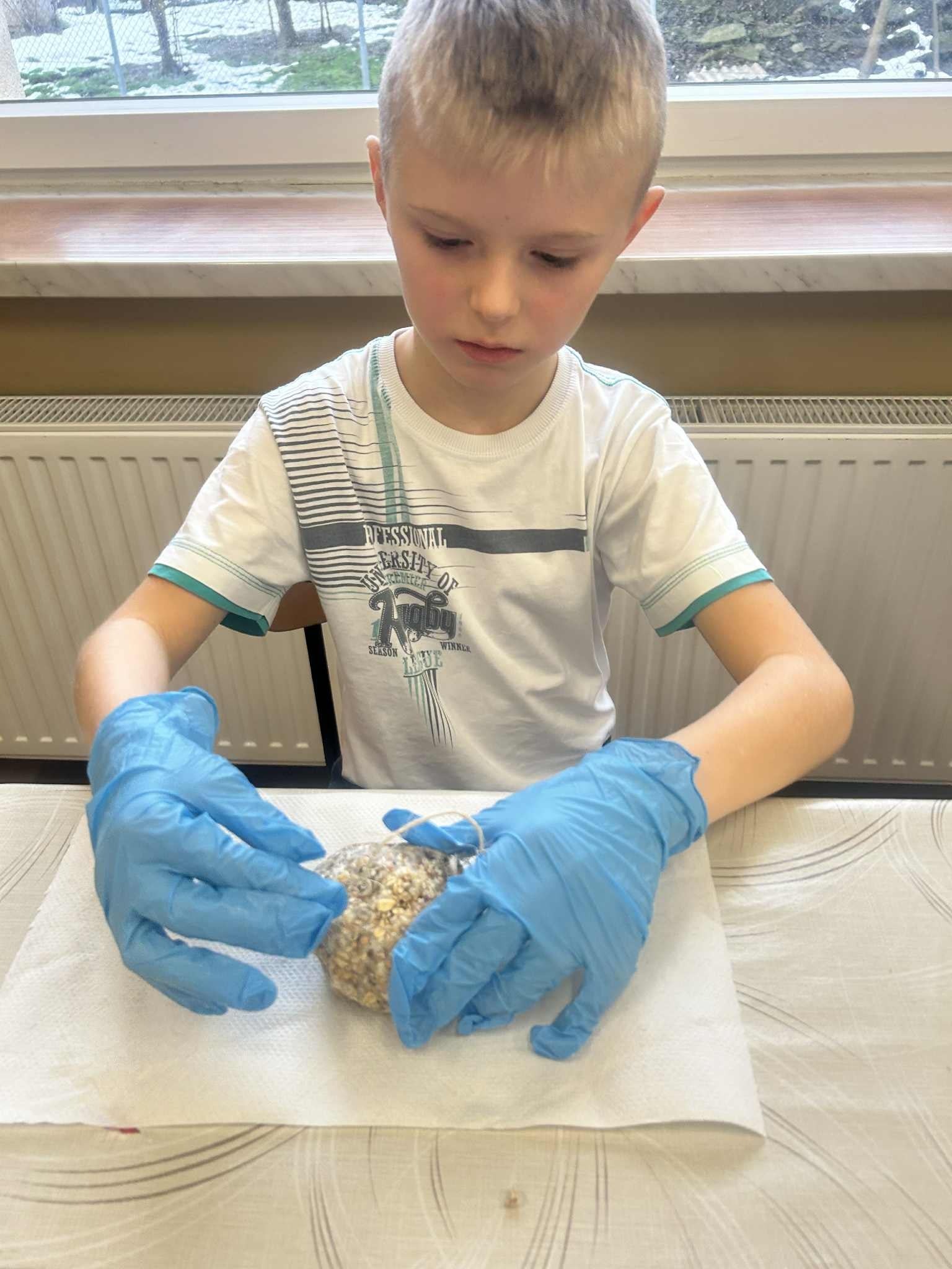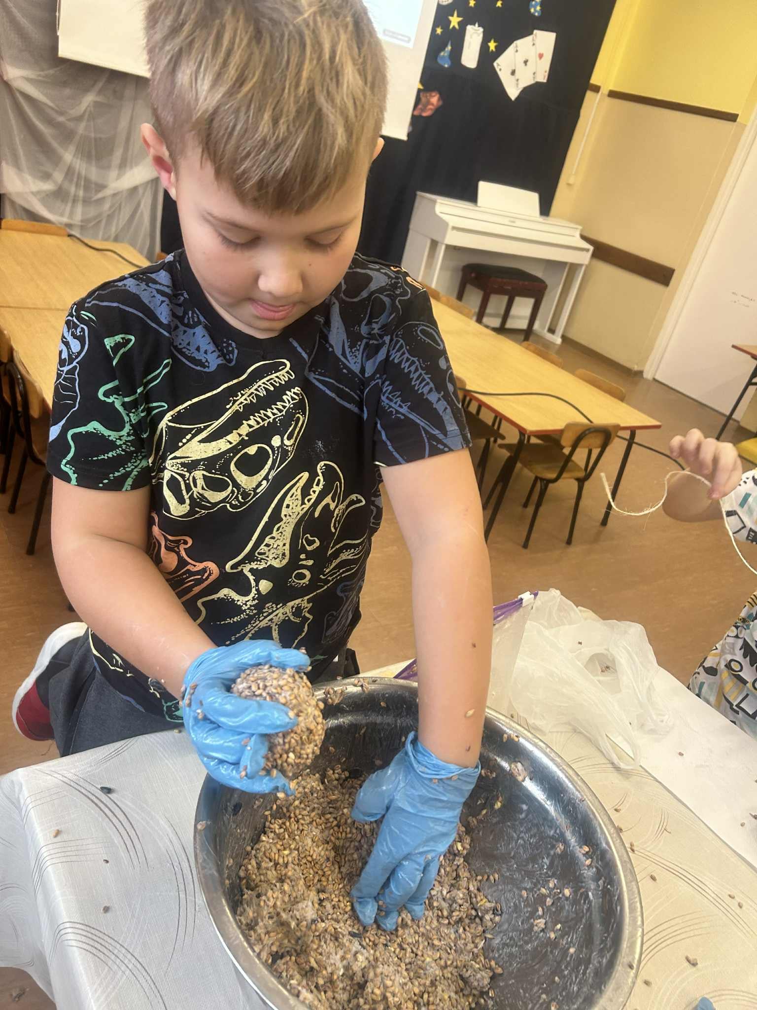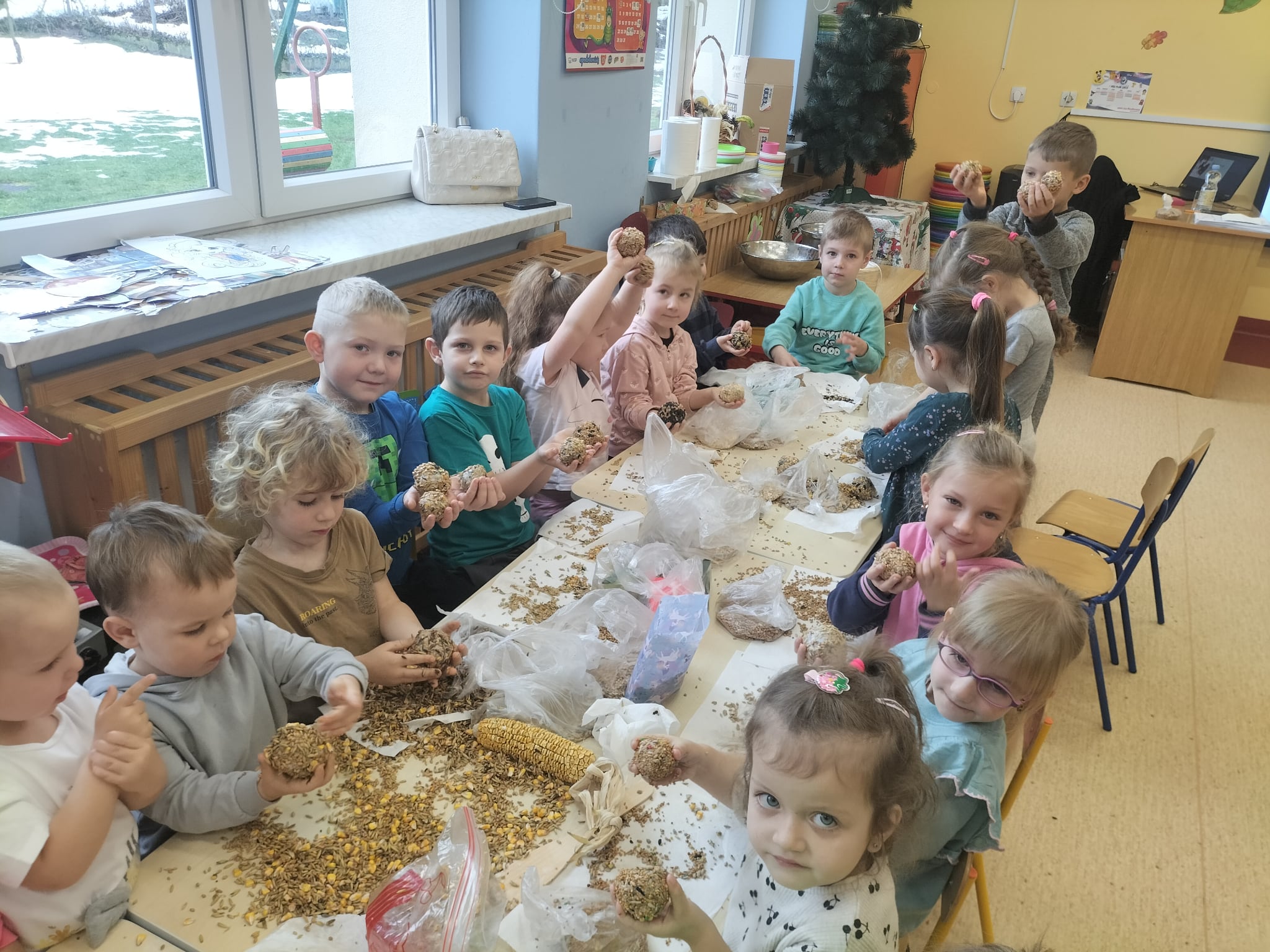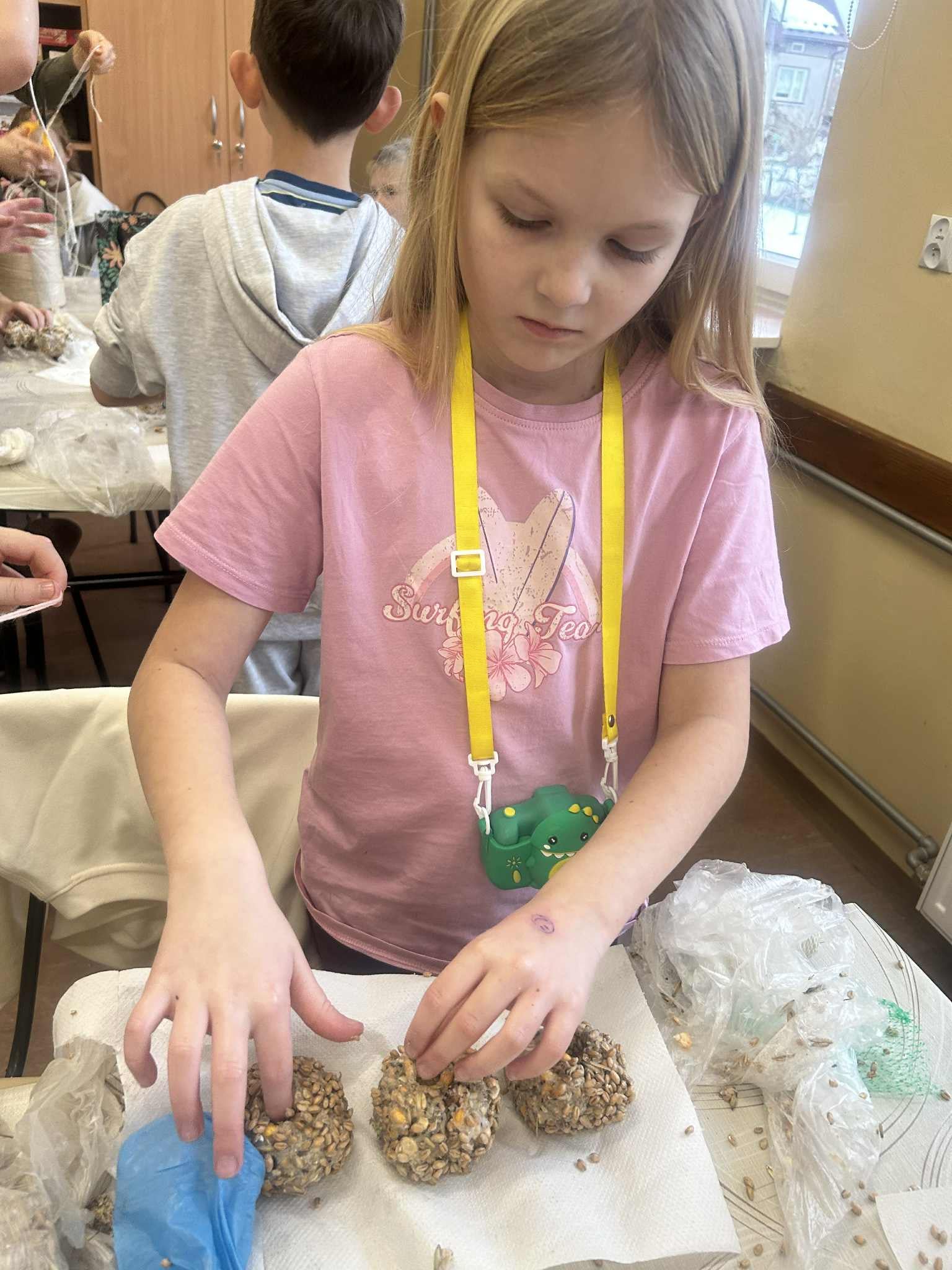 Kulminacją spotkania było tworzenie kul tłuszczowych dla ptaków. Dzieci mieszały ziarna i nasiona ze smalcem, a następnie formowały z nich kule.