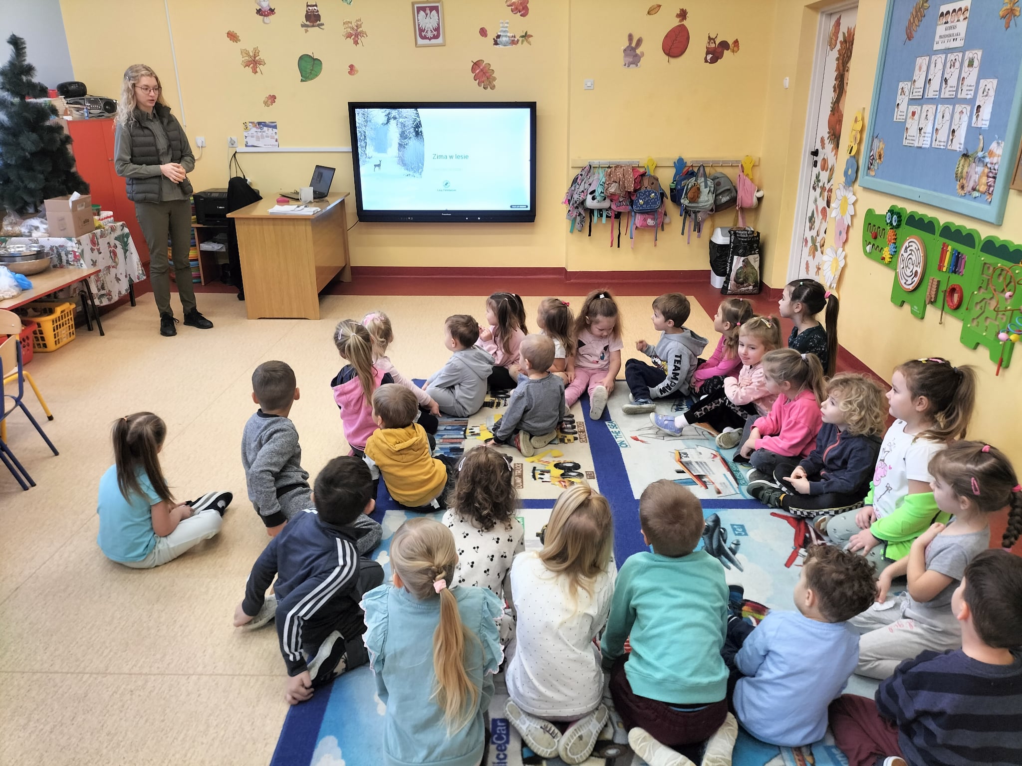 Dziś nasze przedszkolaki oraz uczniowie klas 1–3 mieli wyjątkową okazję spotkać się z Panią Leśnik z Nadleśnictwa Rymanów. Podczas ciekawych opowieści dzieci dowiedziały się, jak zwierzęta leśne przygotowują się do zimy, jak zmienia się las o tej porze roku oraz które ptaki odlatują do ciepłych krajów, a które zostają w Polsce. Pani Leśnik przypomniała również, jak prawidłowo dokarmiać ptaki zimą.