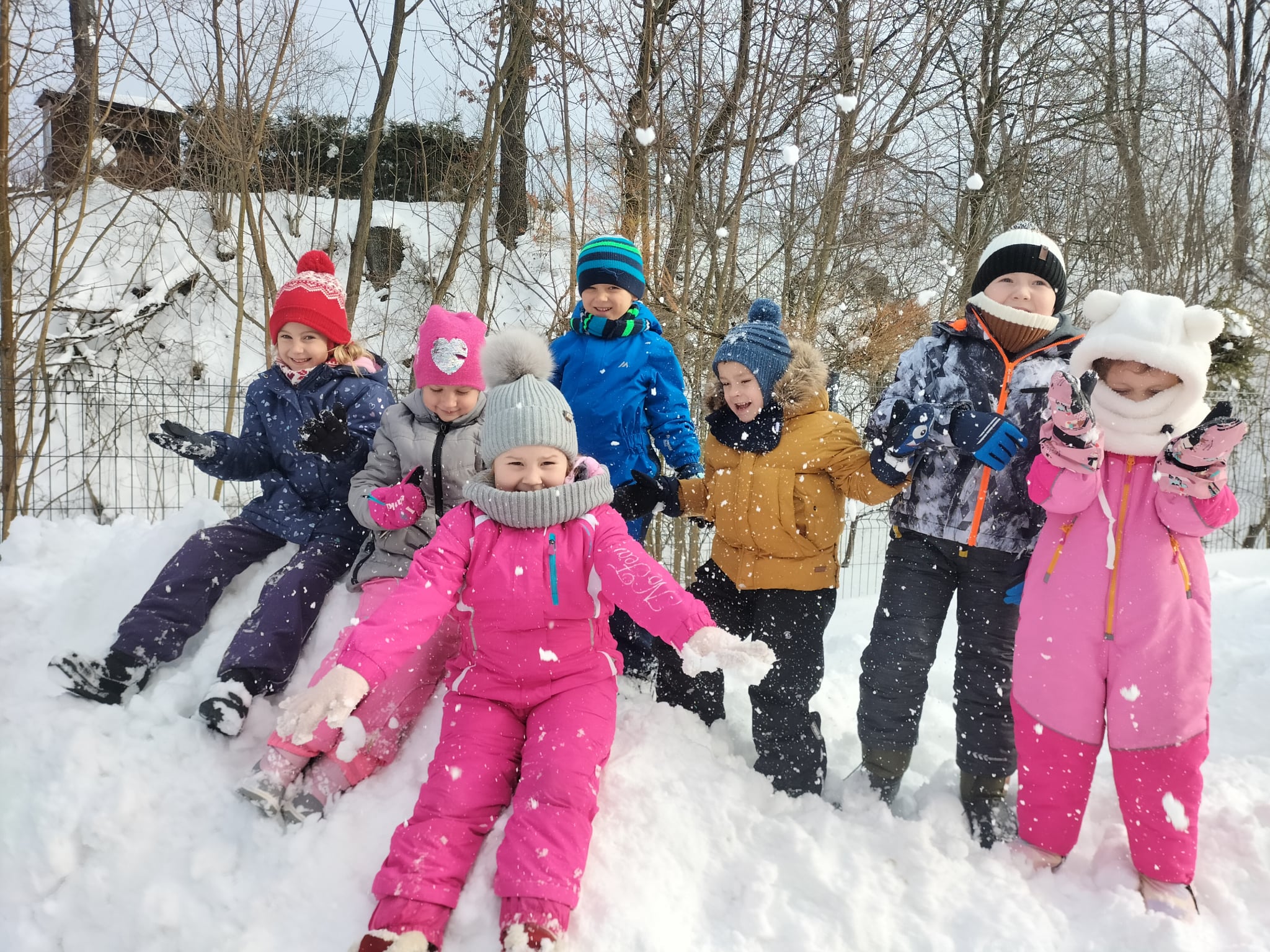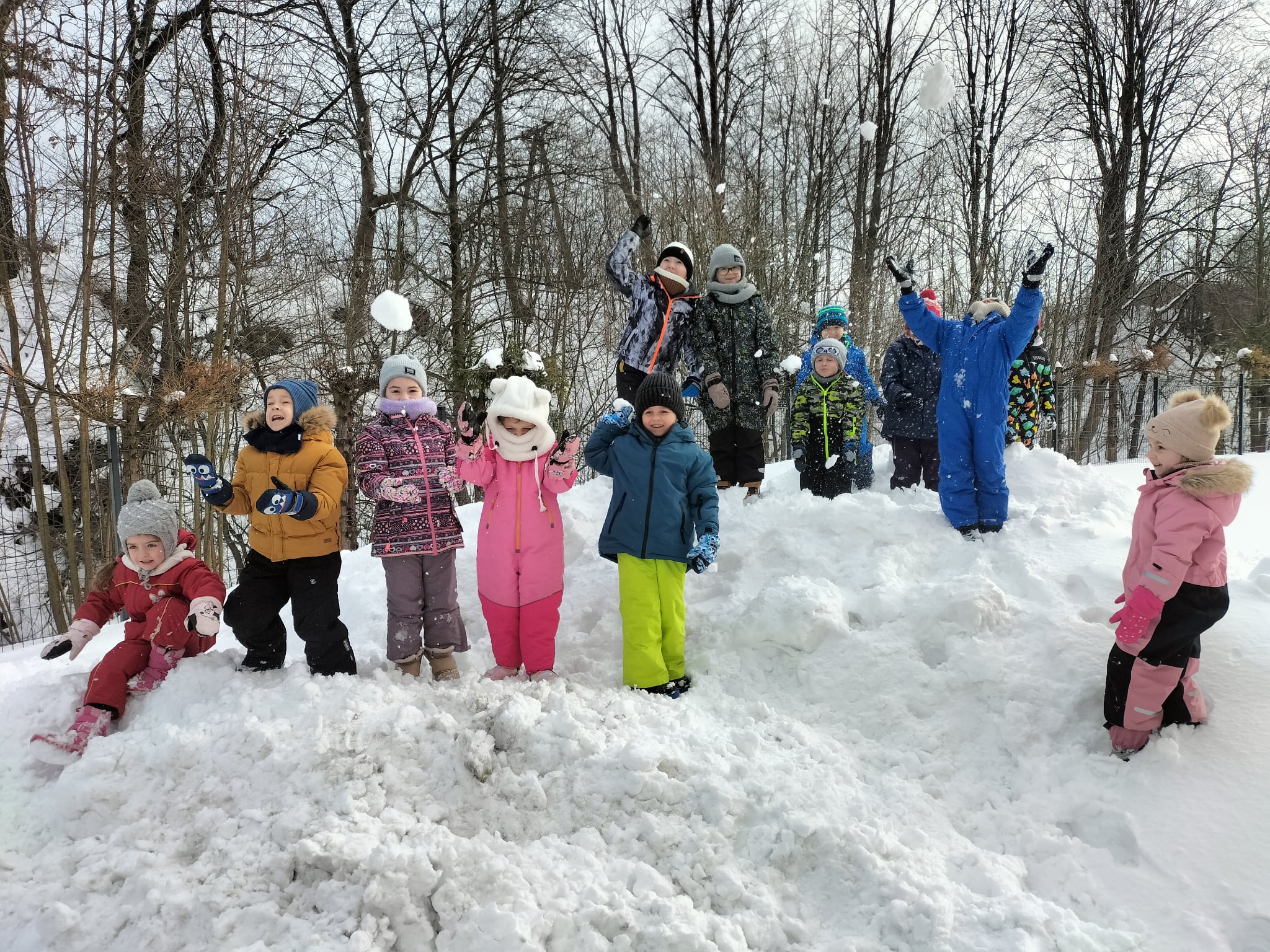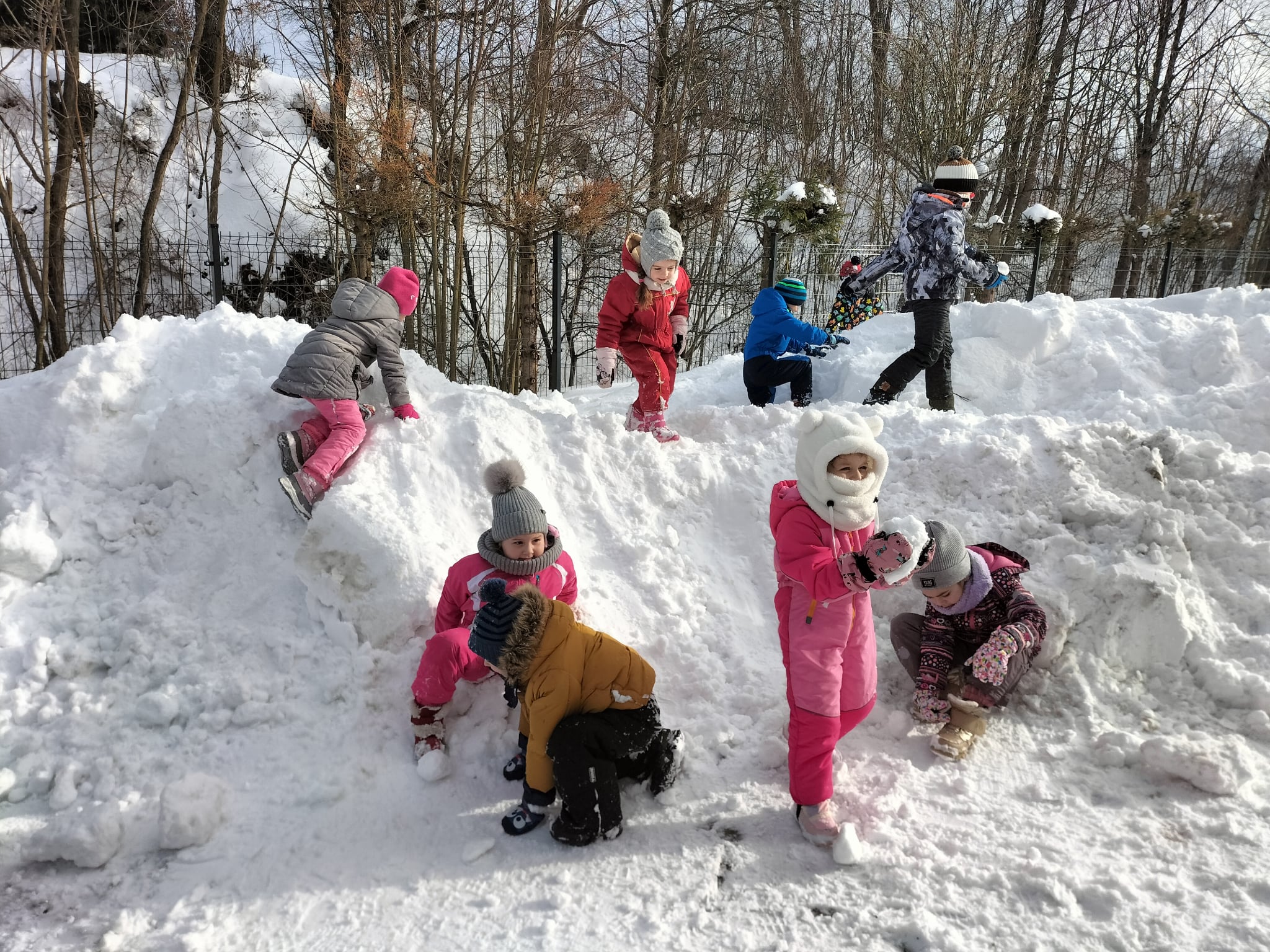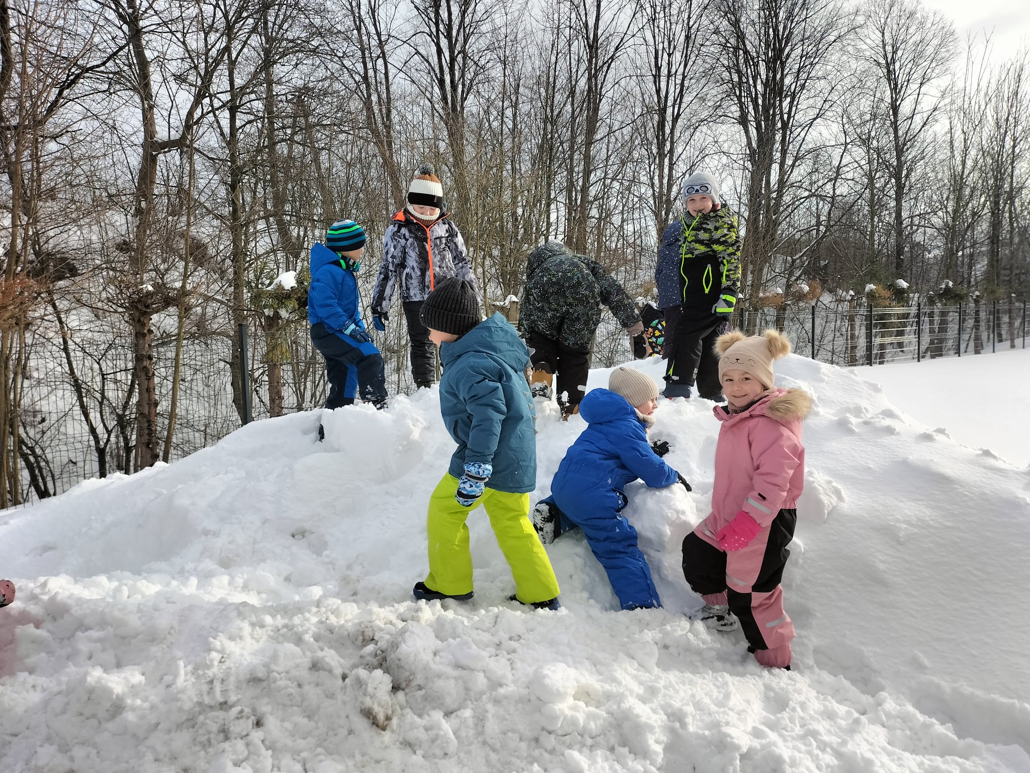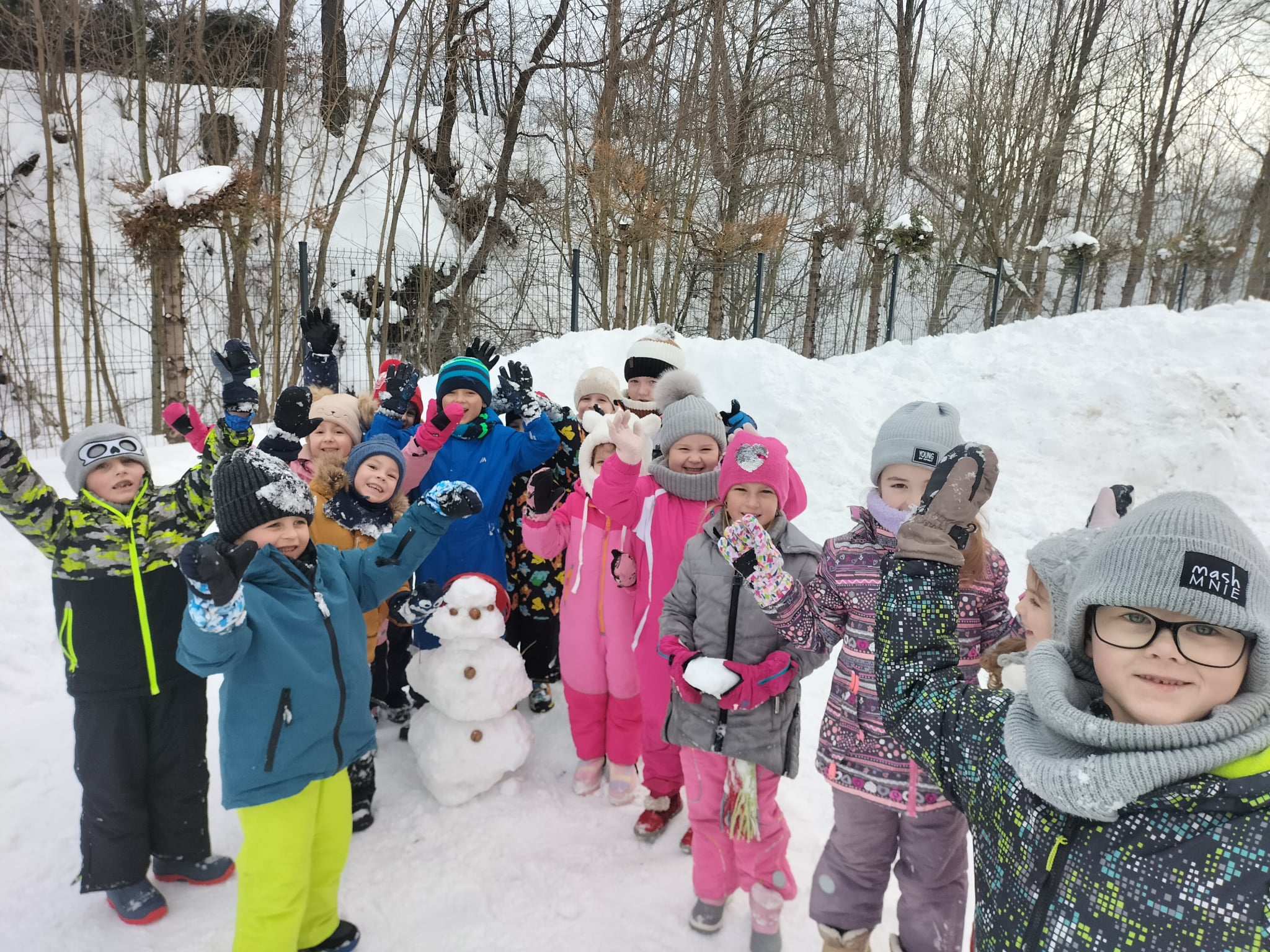 Dziś dzieci z grupy zerówkowej radośnie bawiły się na śniegu, korzystając z zimowej aury. Było dużo ruchu, uśmiechu i dobrej zabawy.
