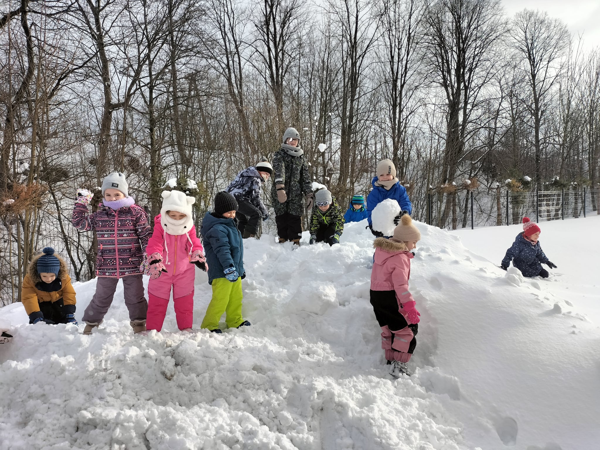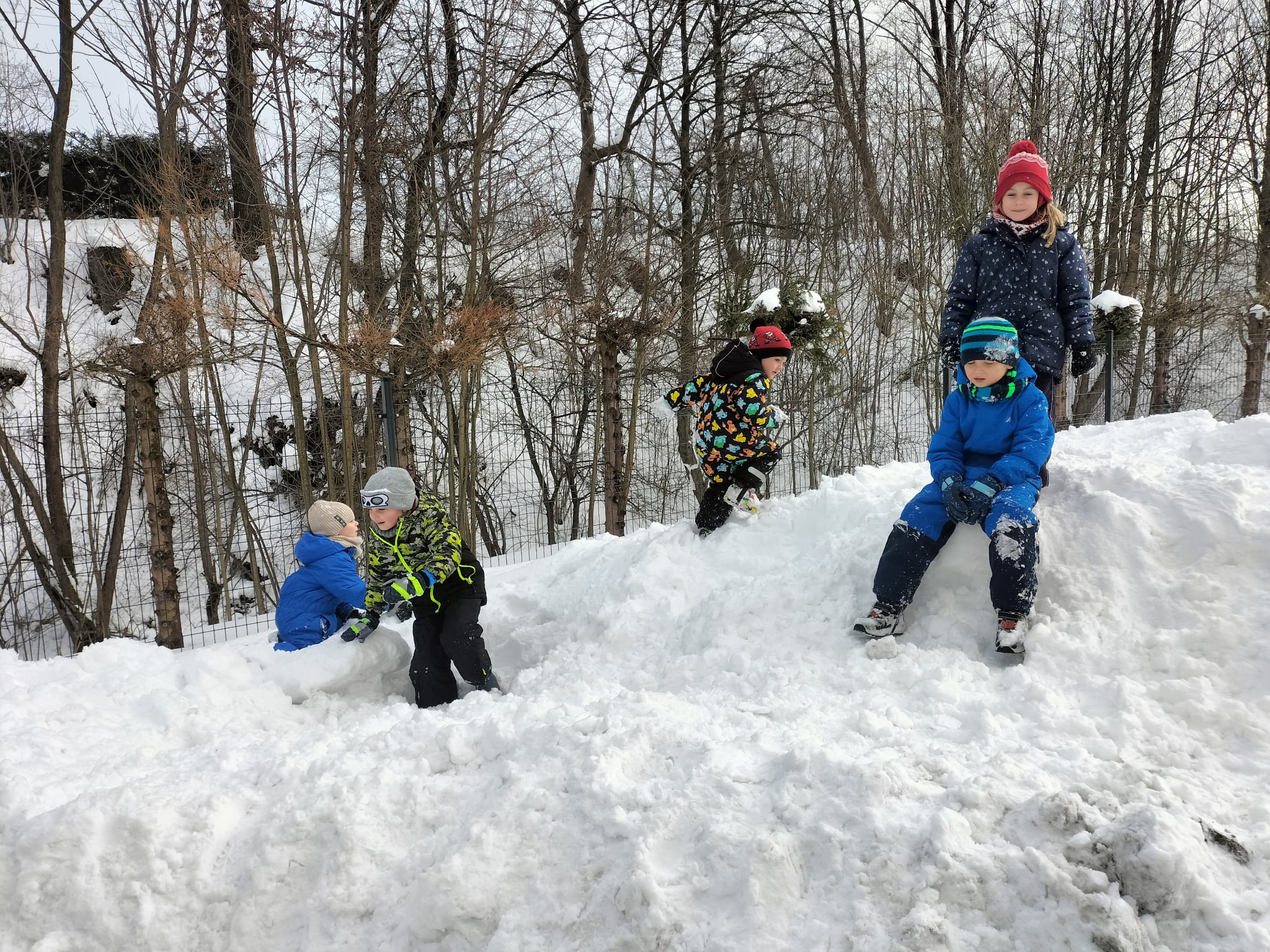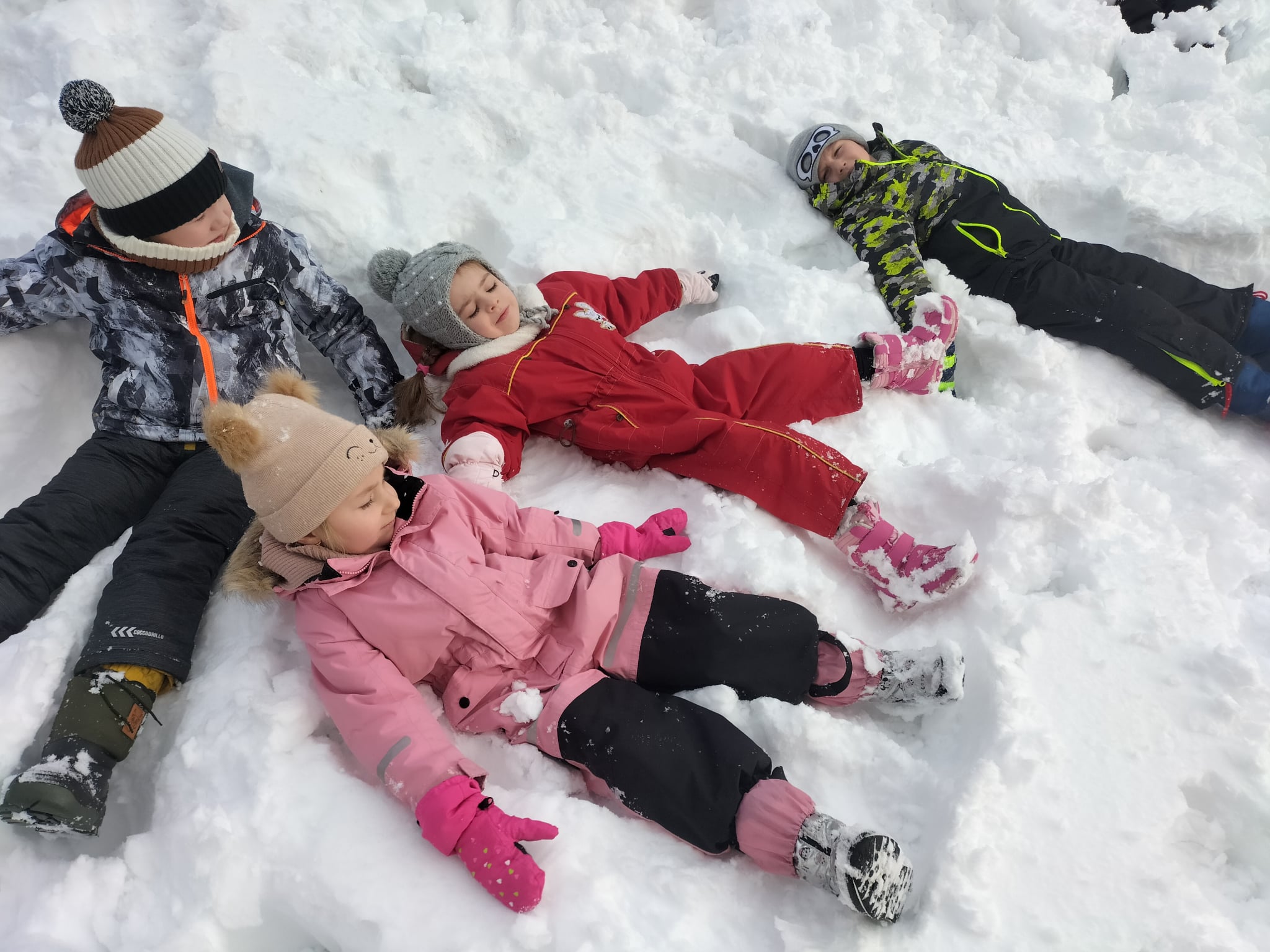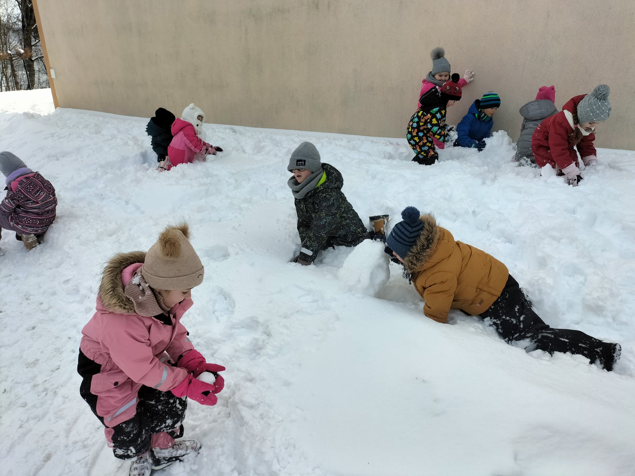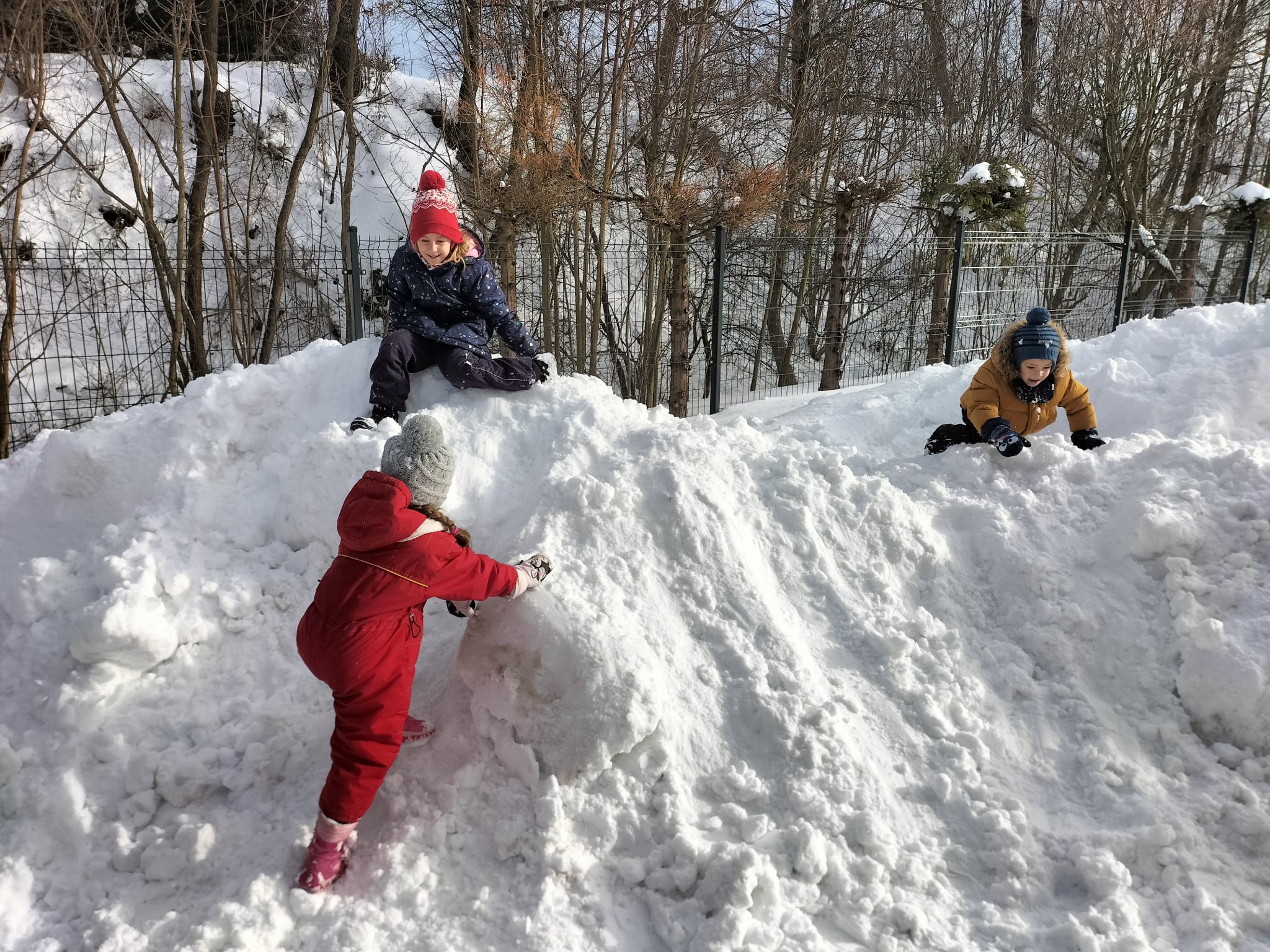 Dziś dzieci z grupy zerówkowej radośnie bawiły się na śniegu, korzystając z zimowej aury. Było dużo ruchu, uśmiechu i dobrej zabawy.