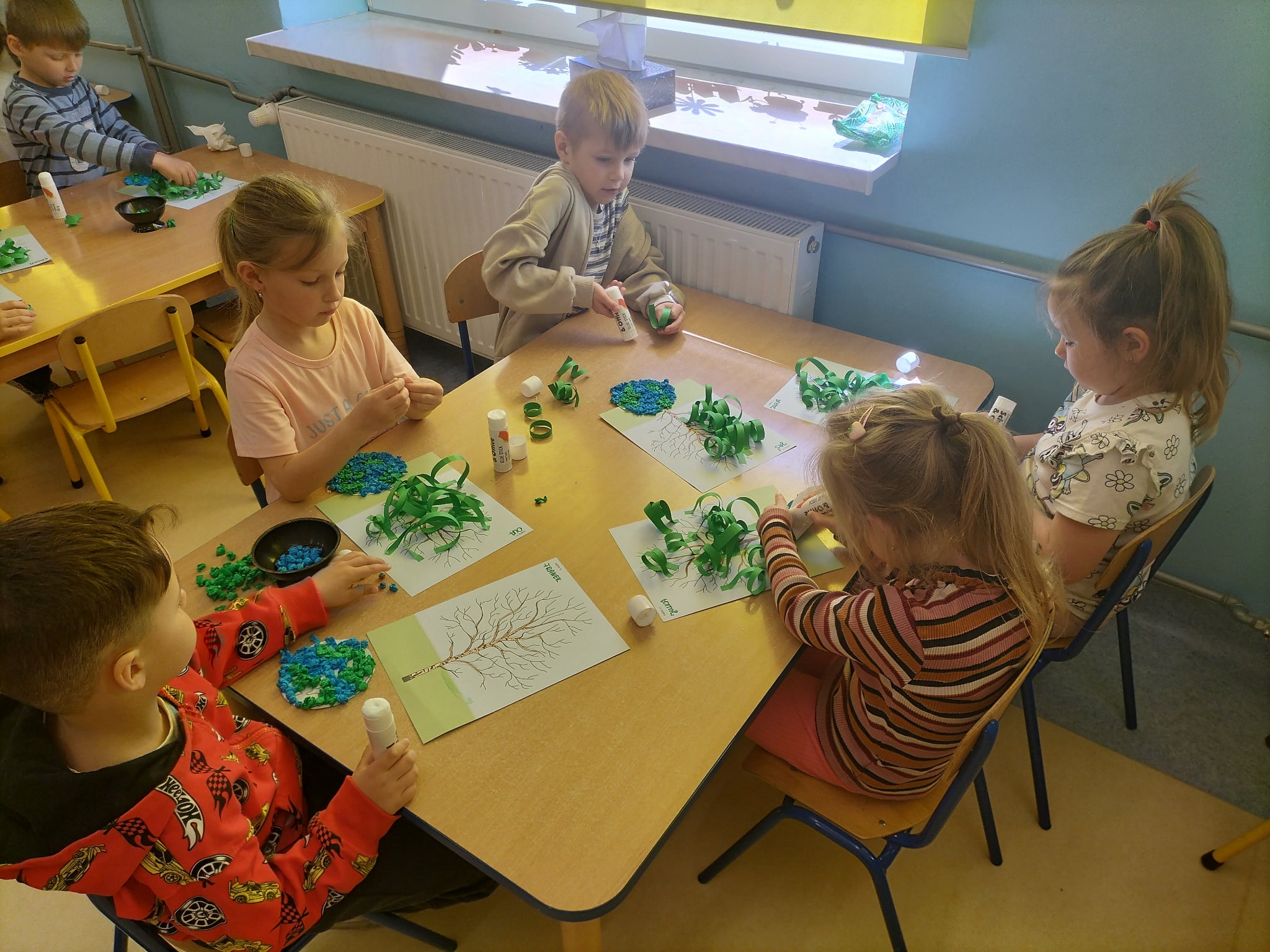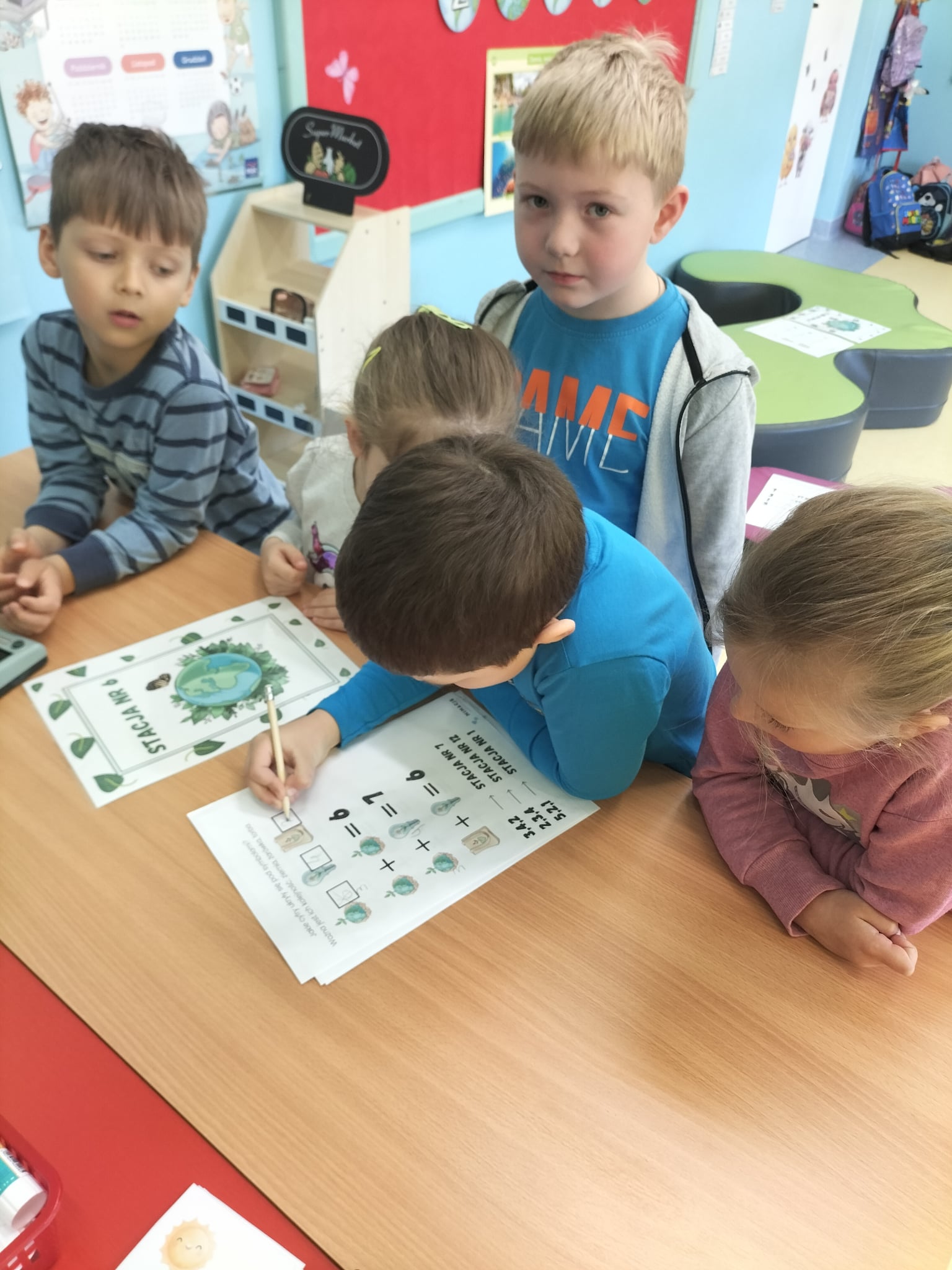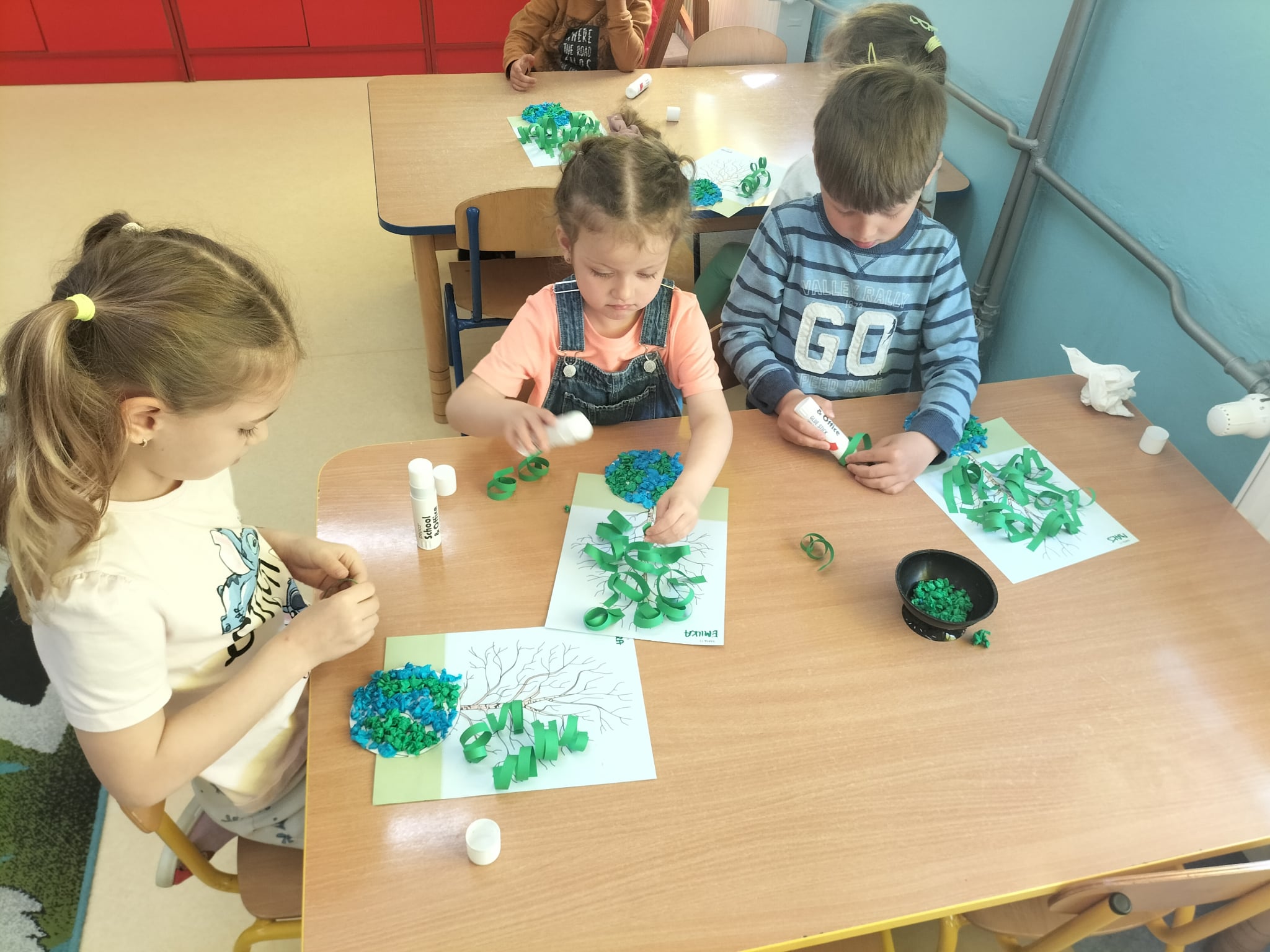 Następnie przedszkolaki brały udział w zabawie polegającej na segregowaniu śmieci do odpowiednich pojemników, utrwalając wiedzę na temat recyklingu. Kolejnym zadaniem było określanie, jakie sytuacje sprawiają, że Ziemia jest smutna, a jakie – że radosna. Dzieci chętnie wypowiadały się i wybierały odpowiednie obrazki, rozwijając swoją świadomość ekologiczną. W części plastycznej dzieci wykonały prace przedstawiające planetę Ziemię.