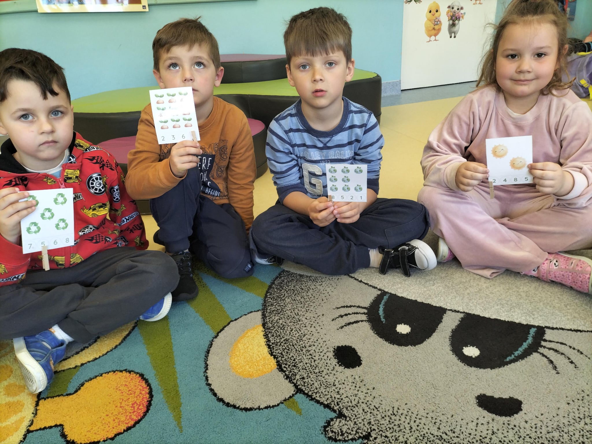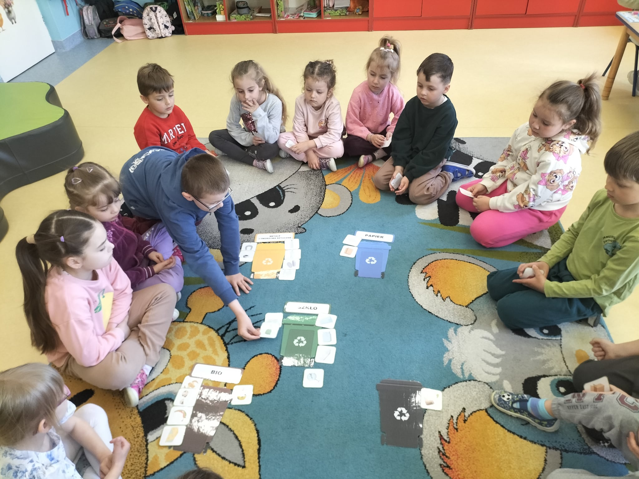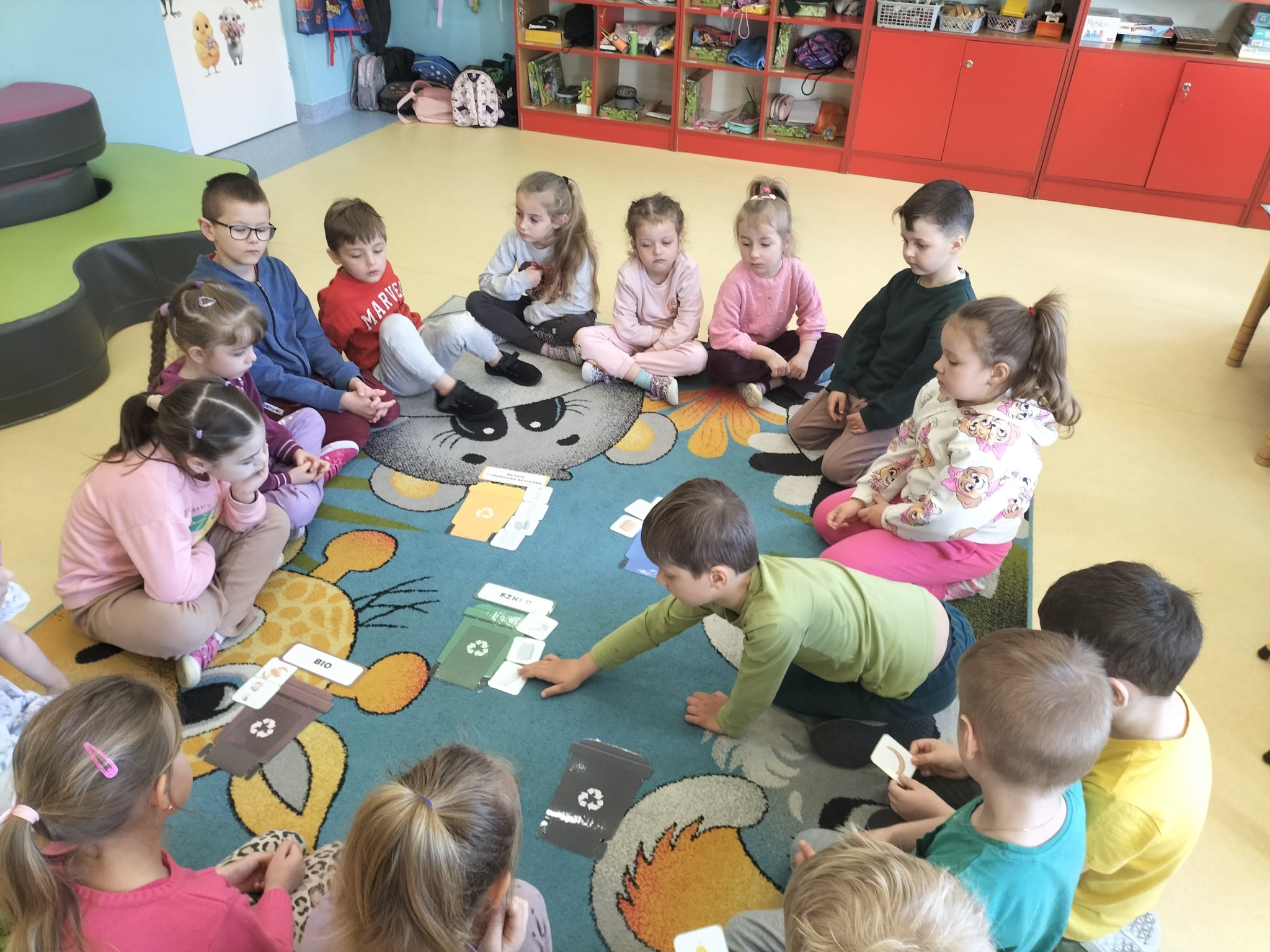 Następnie przedszkolaki brały udział w zabawie polegającej na segregowaniu śmieci do odpowiednich pojemników, utrwalając wiedzę na temat recyklingu. Kolejnym zadaniem było określanie, jakie sytuacje sprawiają, że Ziemia jest smutna, a jakie – że radosna. Dzieci chętnie wypowiadały się i wybierały odpowiednie obrazki, rozwijając swoją świadomość ekologiczną. W części plastycznej dzieci wykonały prace przedstawiające planetę Ziemię.