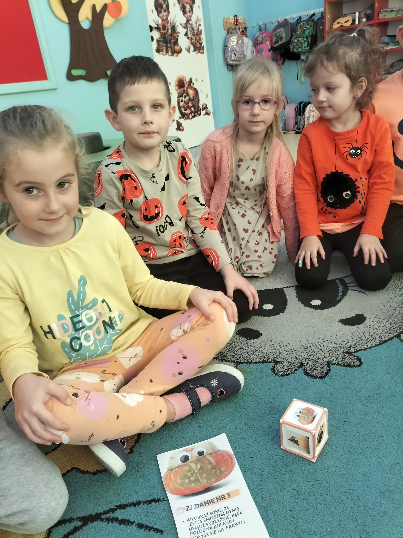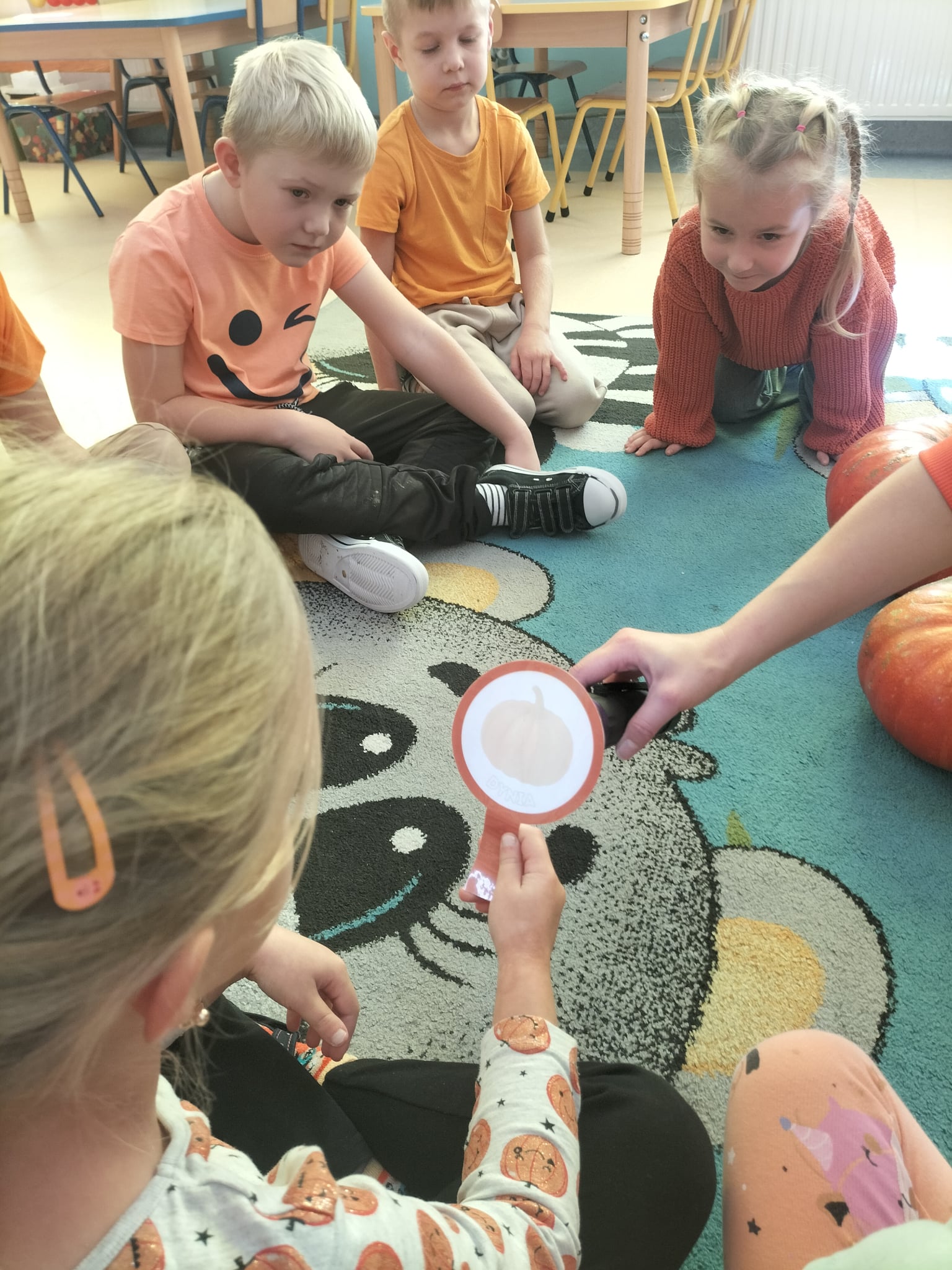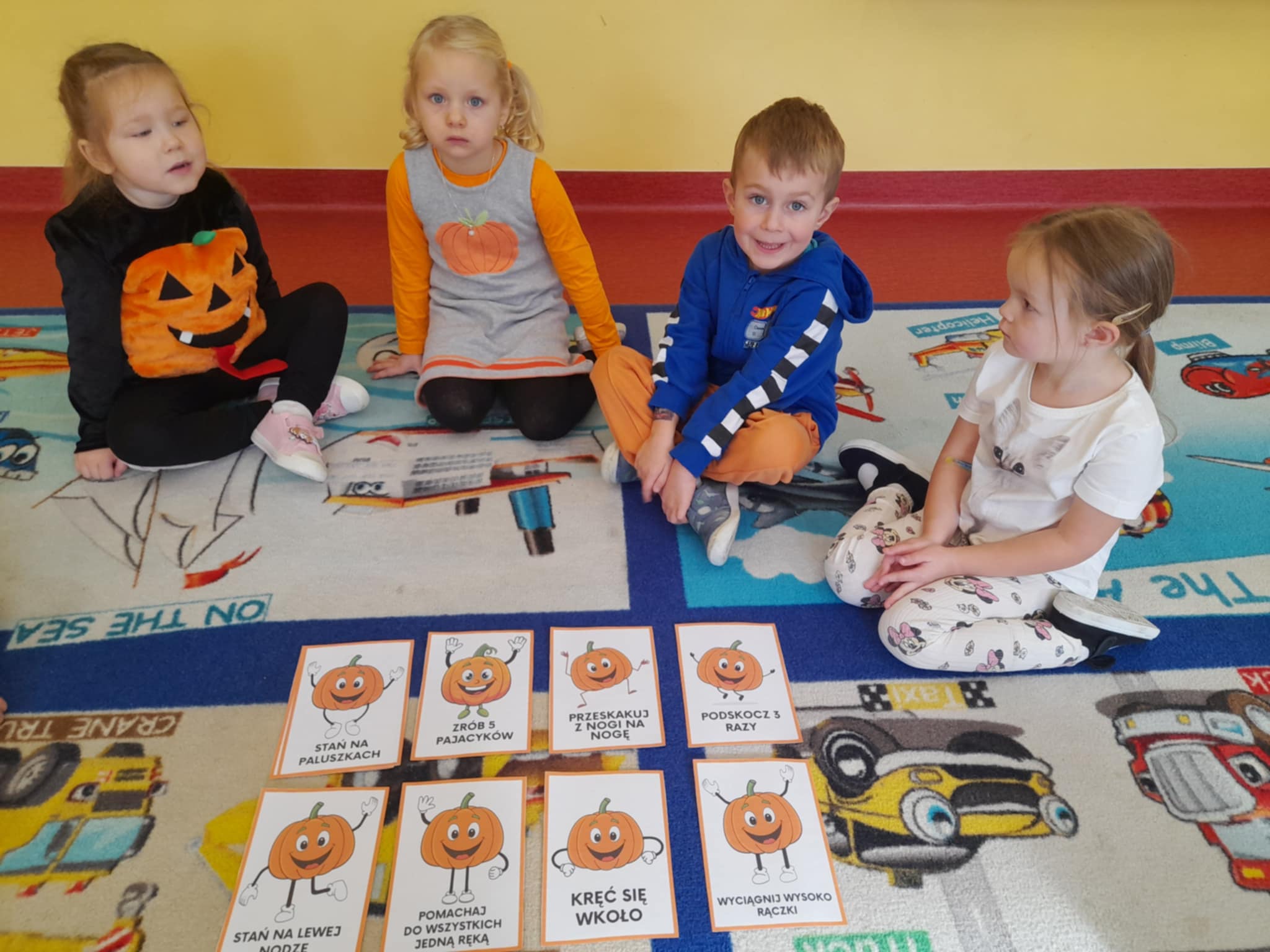 Dzieci miały okazję poznać budowę dyni oraz jej rodzaje i cykl rozwoju. Dowiedziały się też, jakie pyszne potrawy można z niej przygotować. Nie zabrakło również zabawy i ruchu. Przedszkolaki rzucały kostką, wykonując do niej różne dyniowe zadania, brały udział w zabawie „gorąca dynia”, a także świetnie bawiły się podczas zabawy latarkowej.