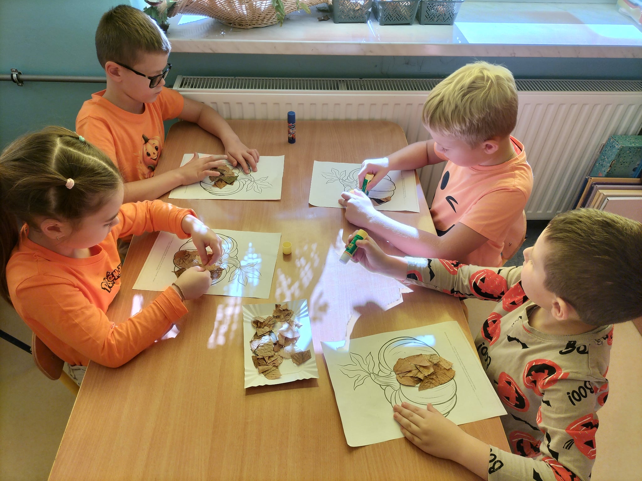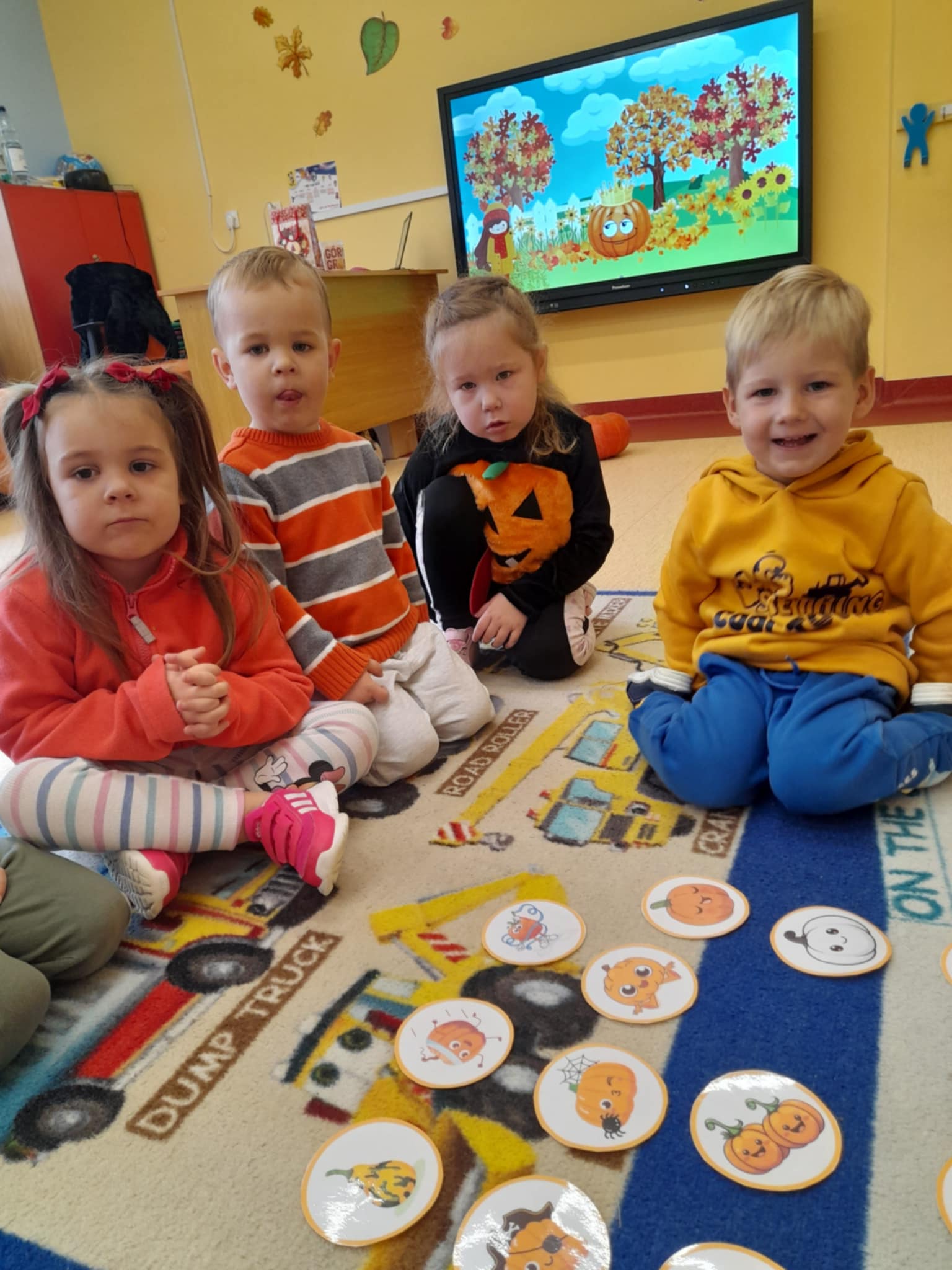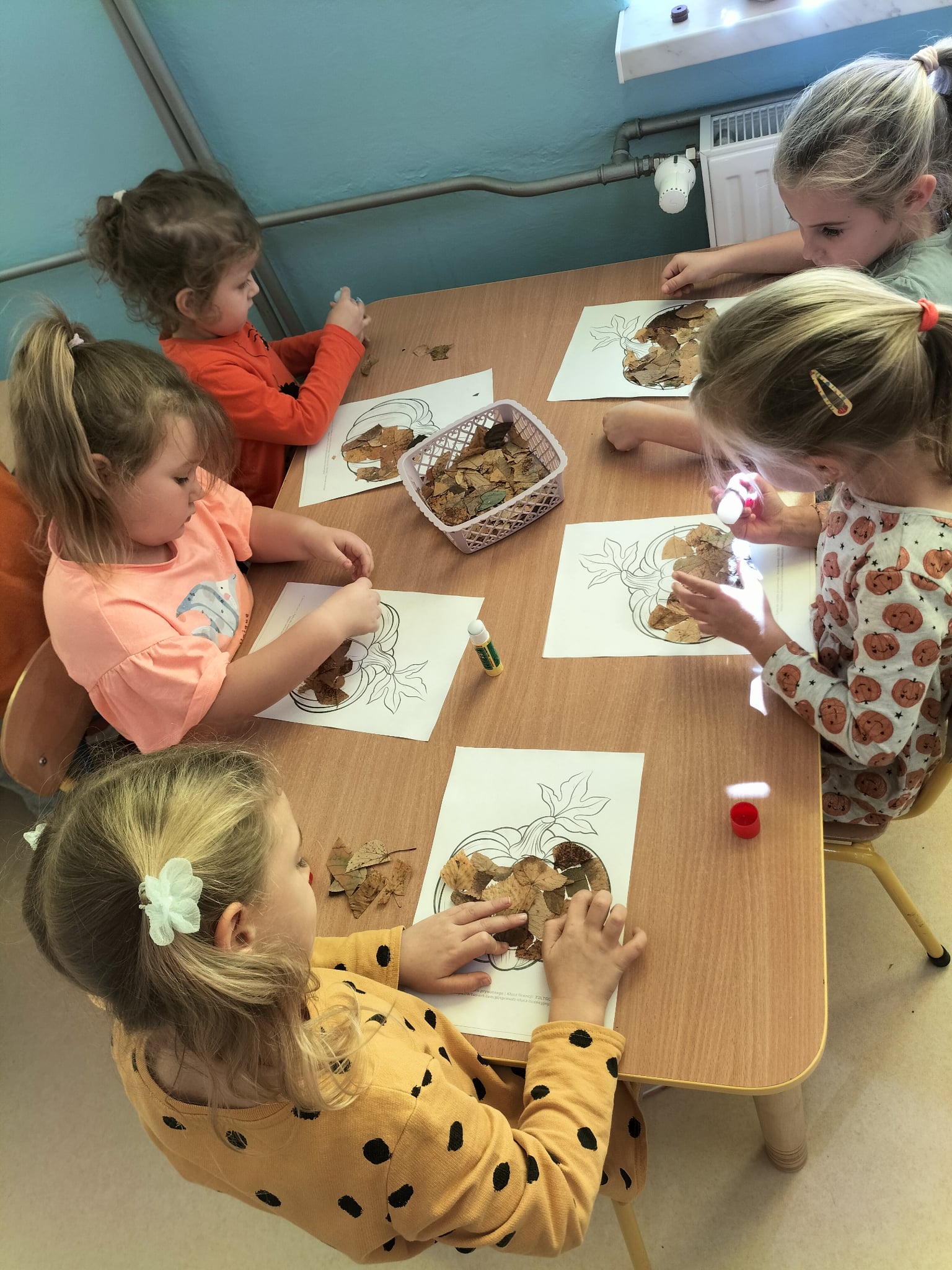 Dzieci ćwiczyły swoje umiejętności matematyczne podczas dyniowego przeliczania – liczyły pestki, czarne kropki i wskazywały daną liczbę na palcach. Przedszkolaki rozwijały orientację przestrzenną, określając położenie myszki względem dyni i wykonały pracę plastyczną „Dyniowa mozaika z liści”.