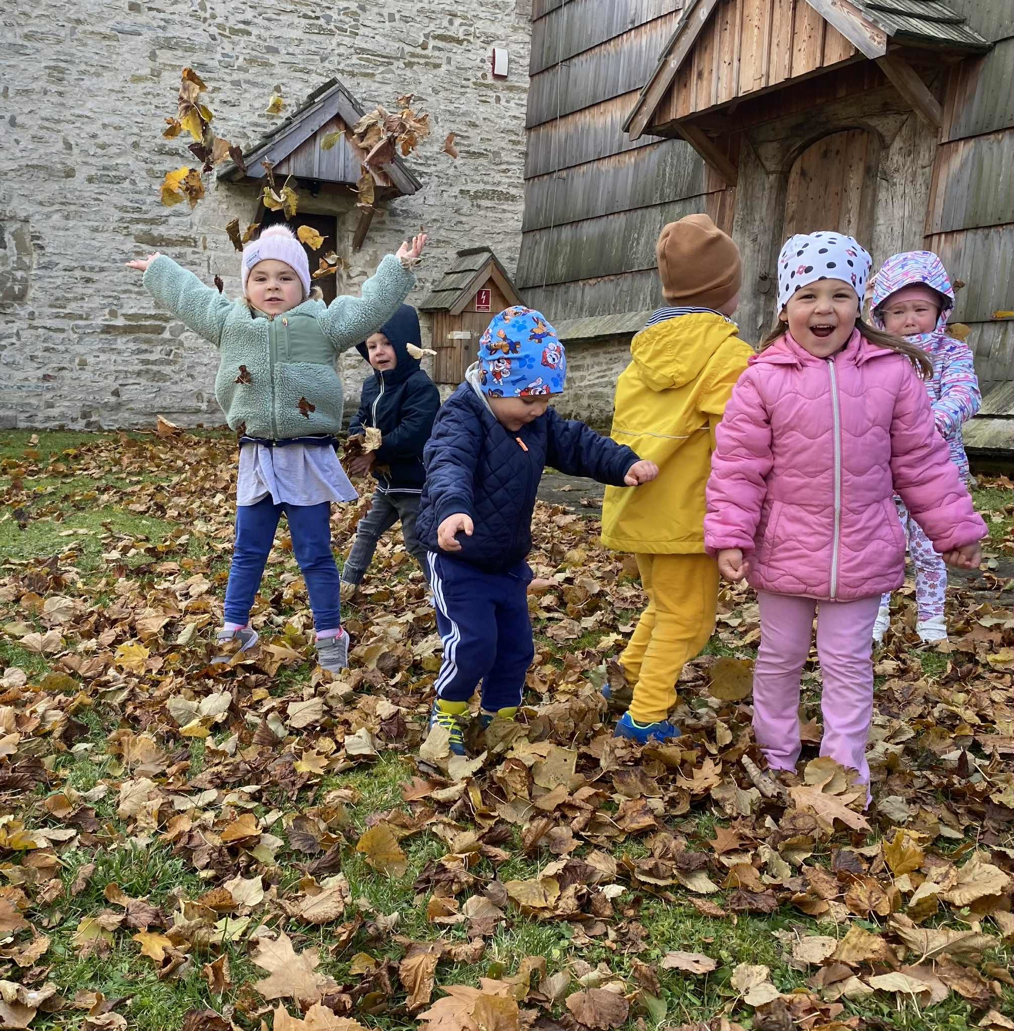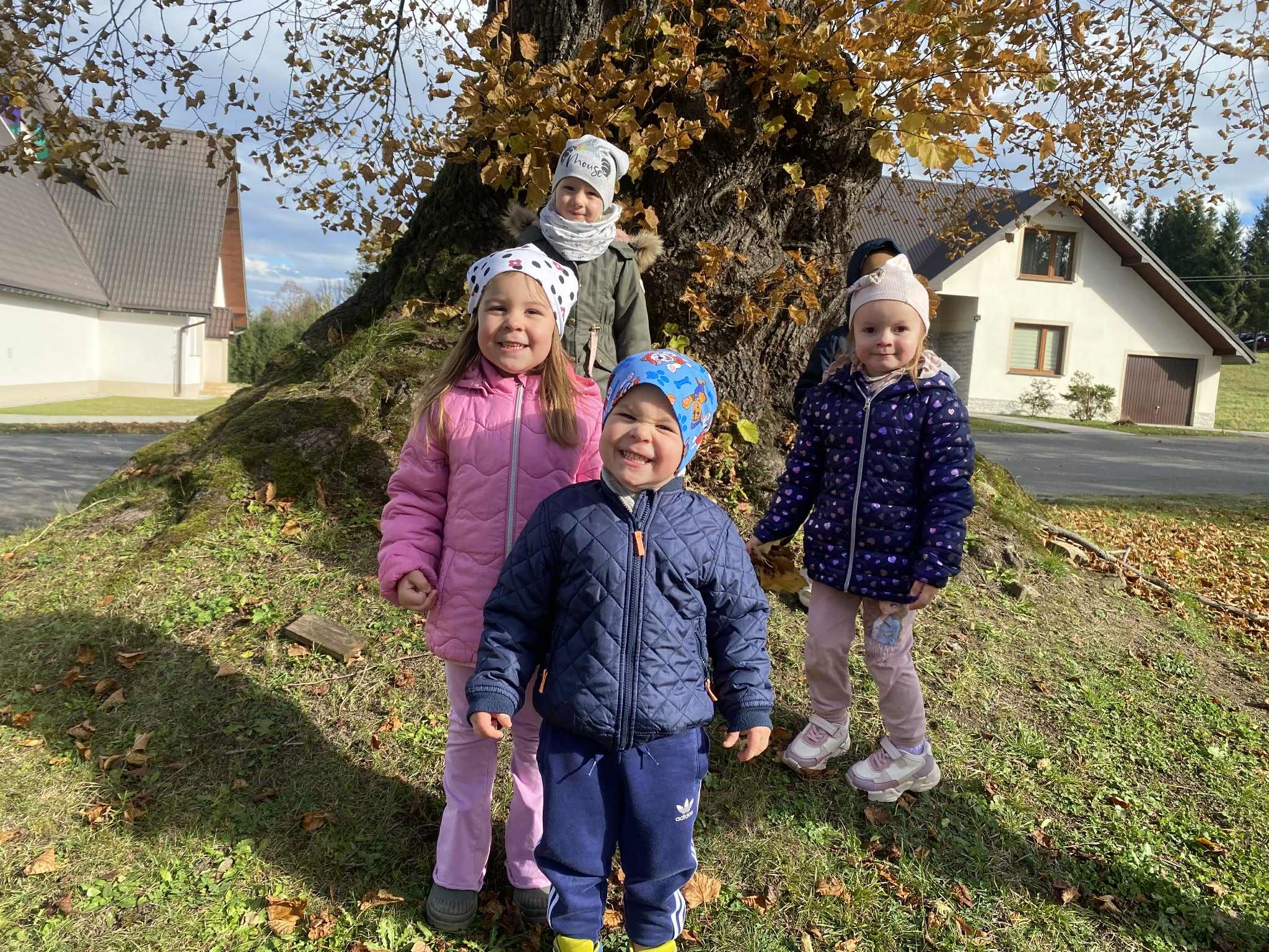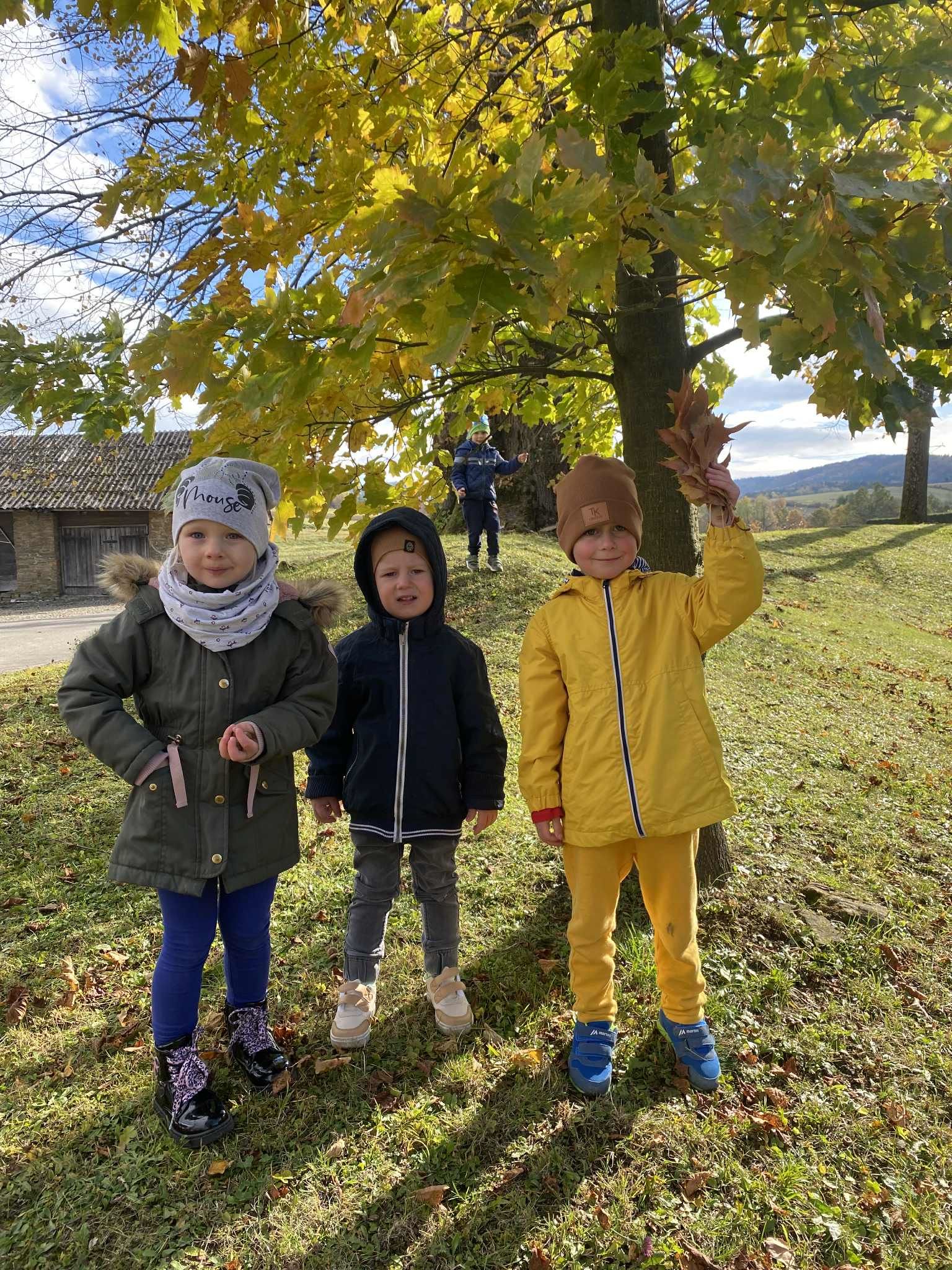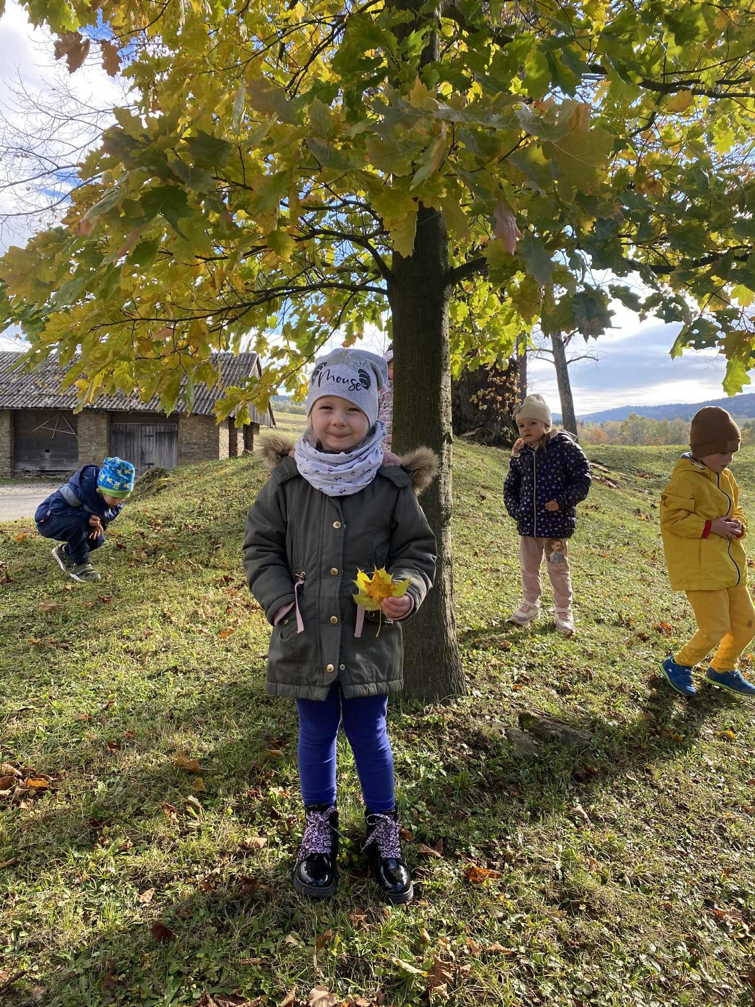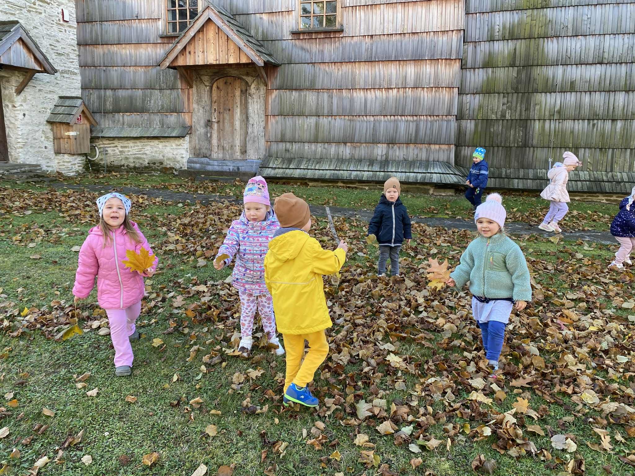 Korzystając z pięknej jesiennej pogody, również cała grupa „ Maluchów” wyruszyła dzisiaj na spotkanie z Panią Jesienią. Dzieci z radością zbierały różnokolorowe liście i inne skarby natury. Wielką frajdę sprawiły im też tańce i podskoki wśród wirujących na wietrze liści.