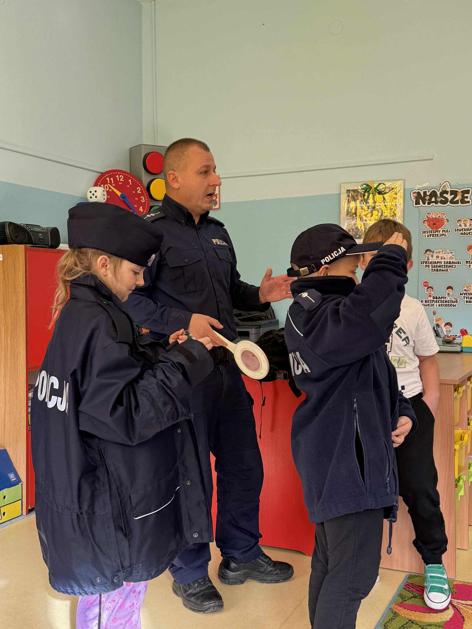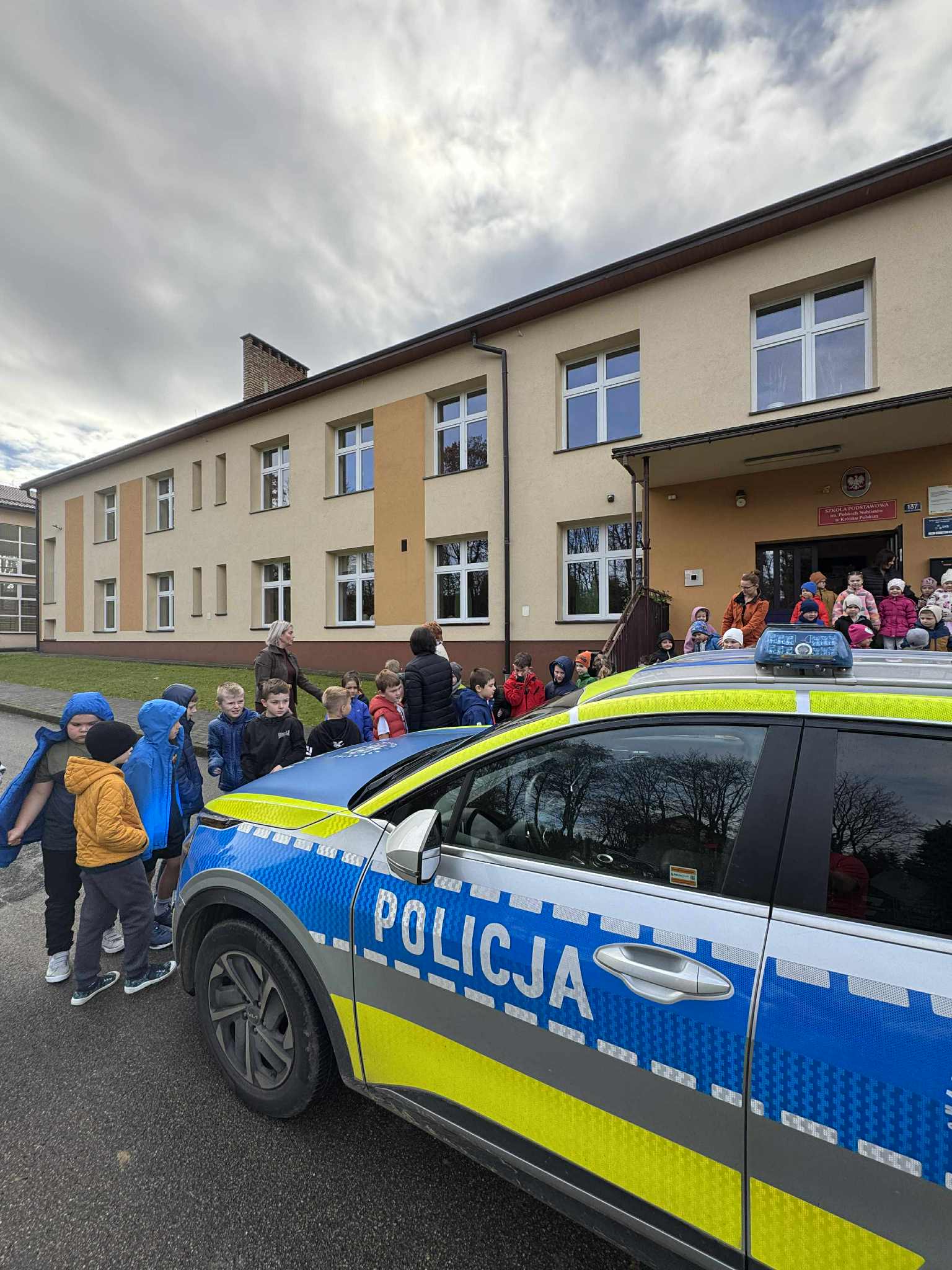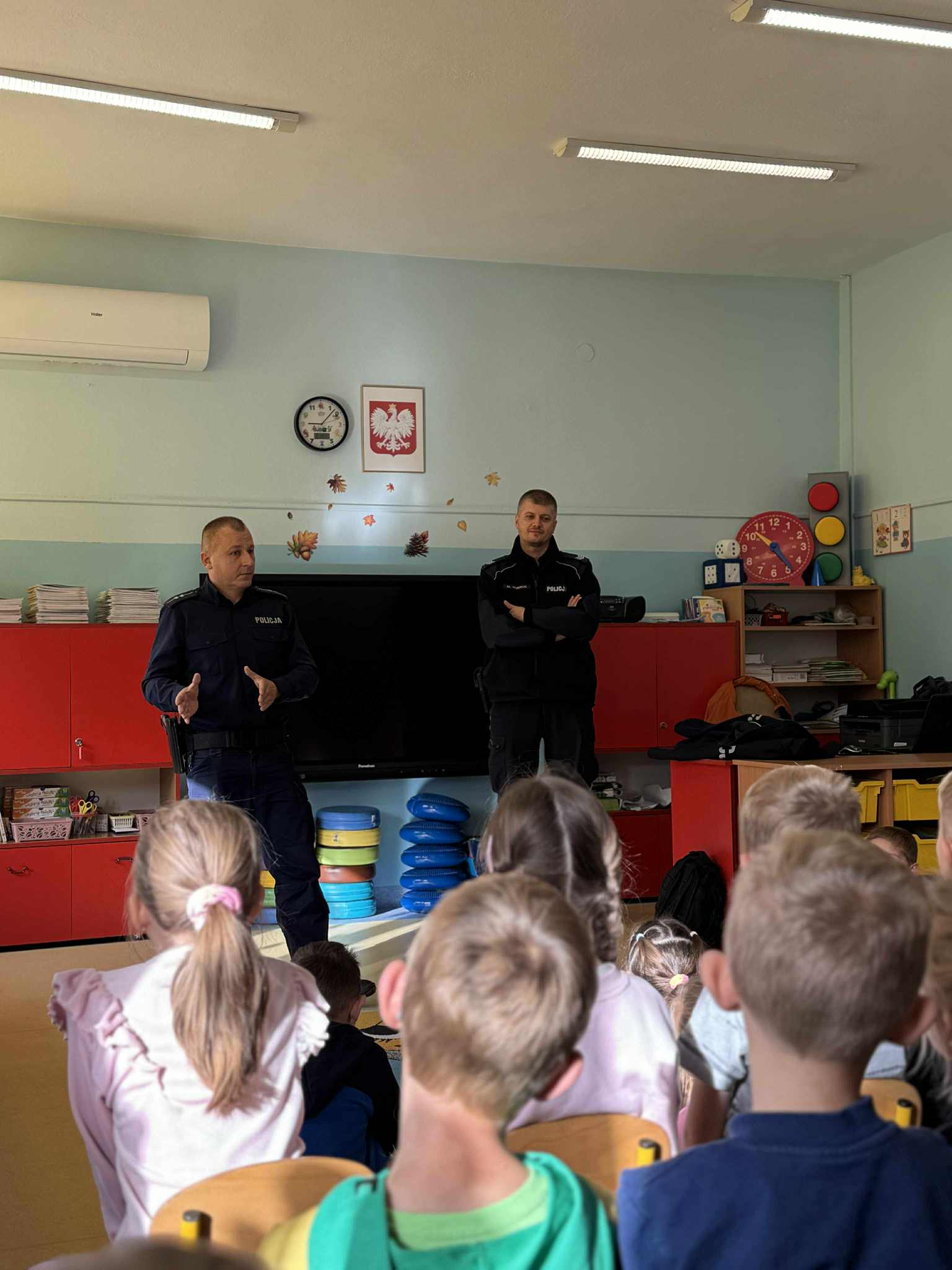 Policjanci rozmawiali z dziećmi o bezpieczeństwie na drodze, noszeniu odblasków, kontakcie z nieznajomymi oraz o tym, jak należy się zachować podczas spotkania z psem.