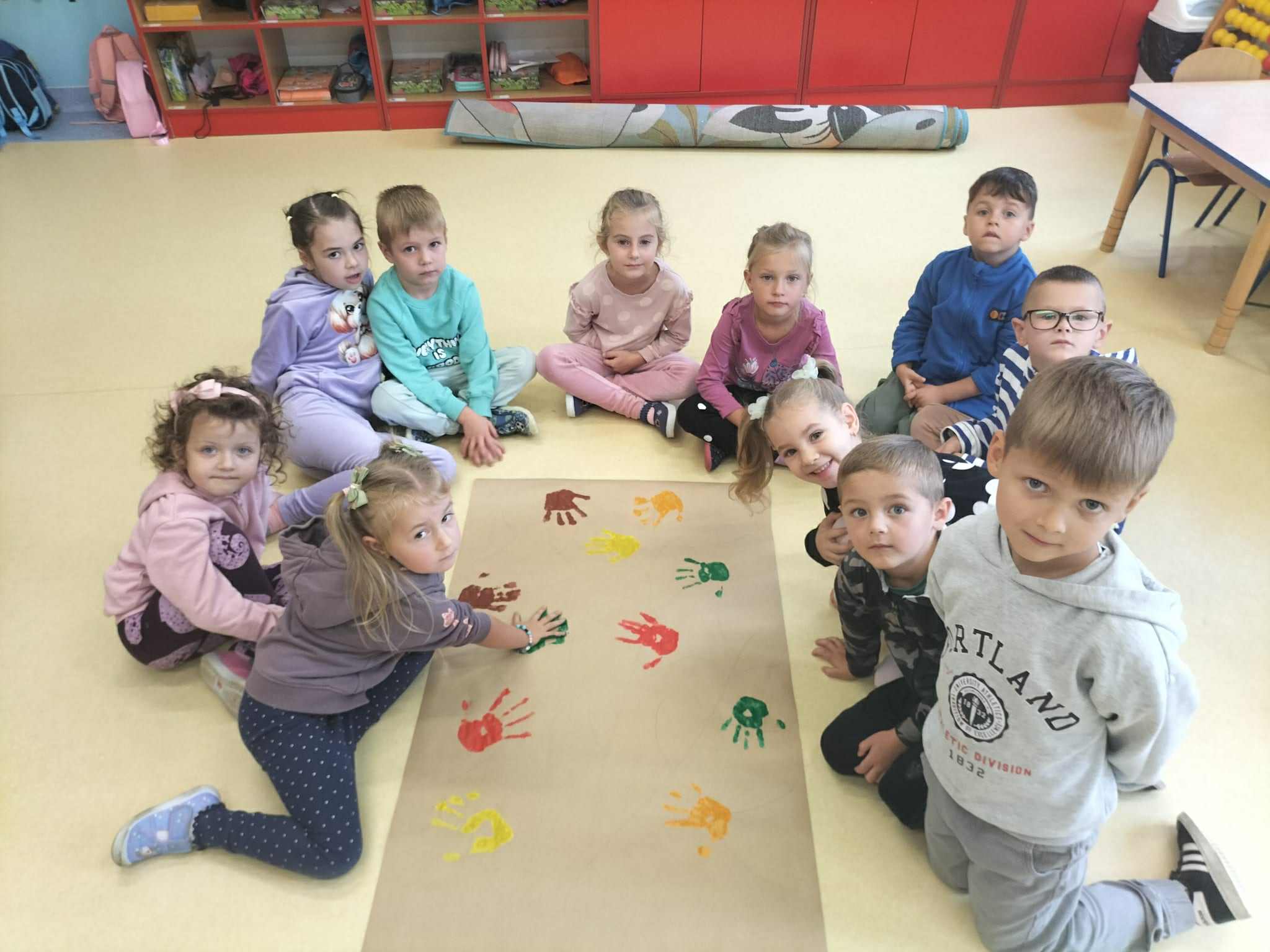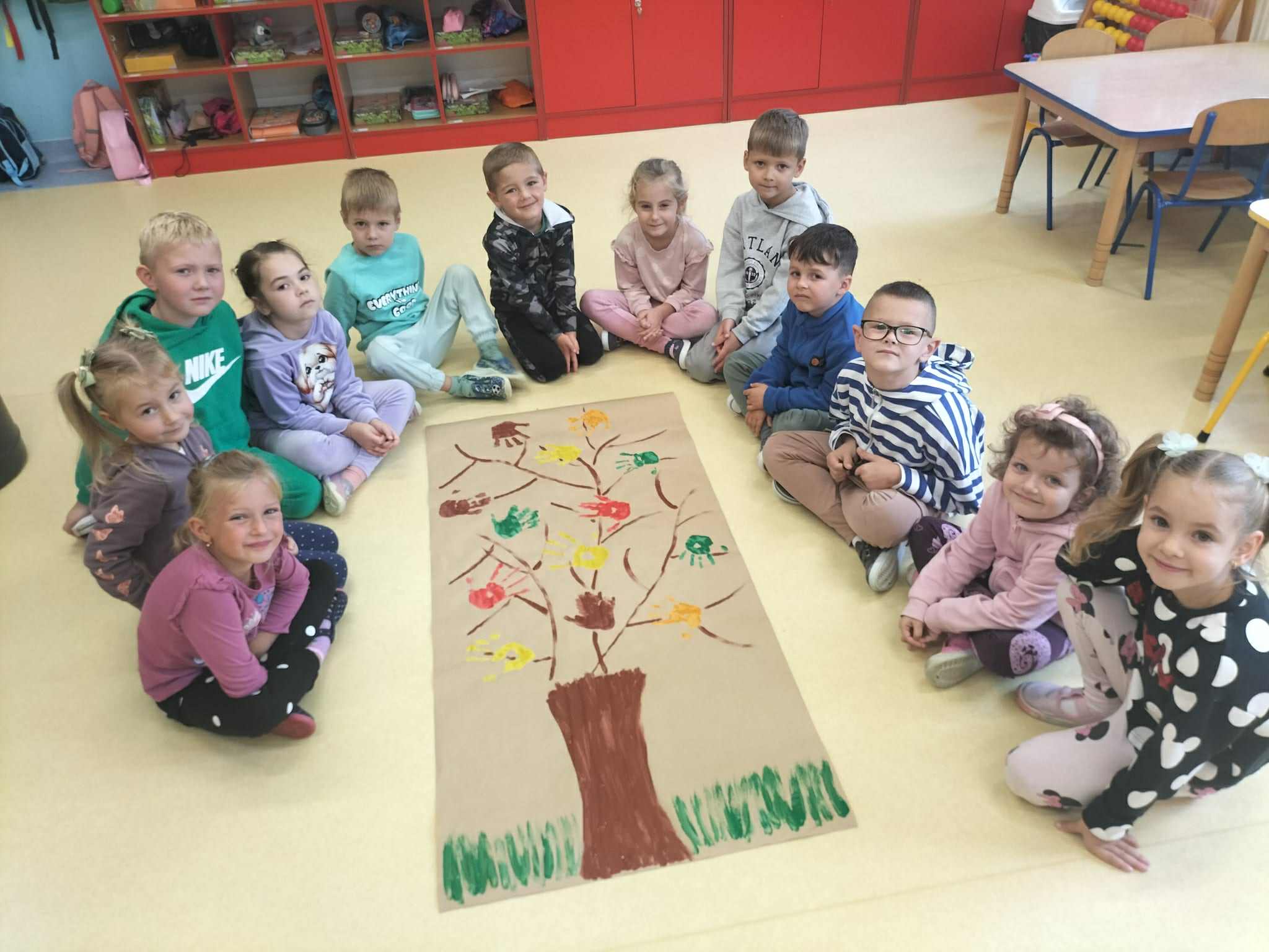 Na zakończenie zajęć przedszkolaki wykonały wspólną pracę plastyczną – „Nasze drzewo”, którego liście powstały z odcisków dziecięcych dłoni pomalowanych farbą.