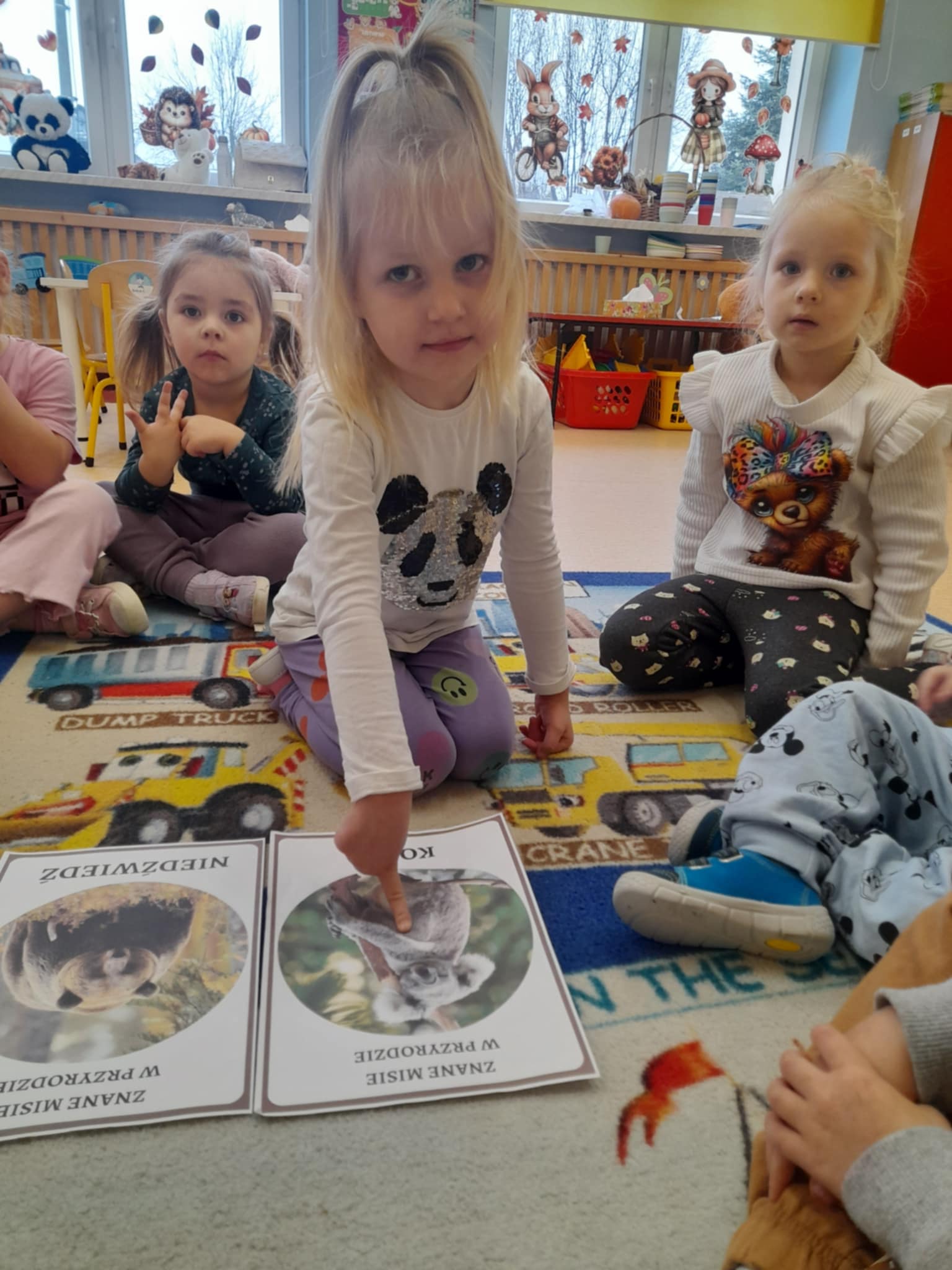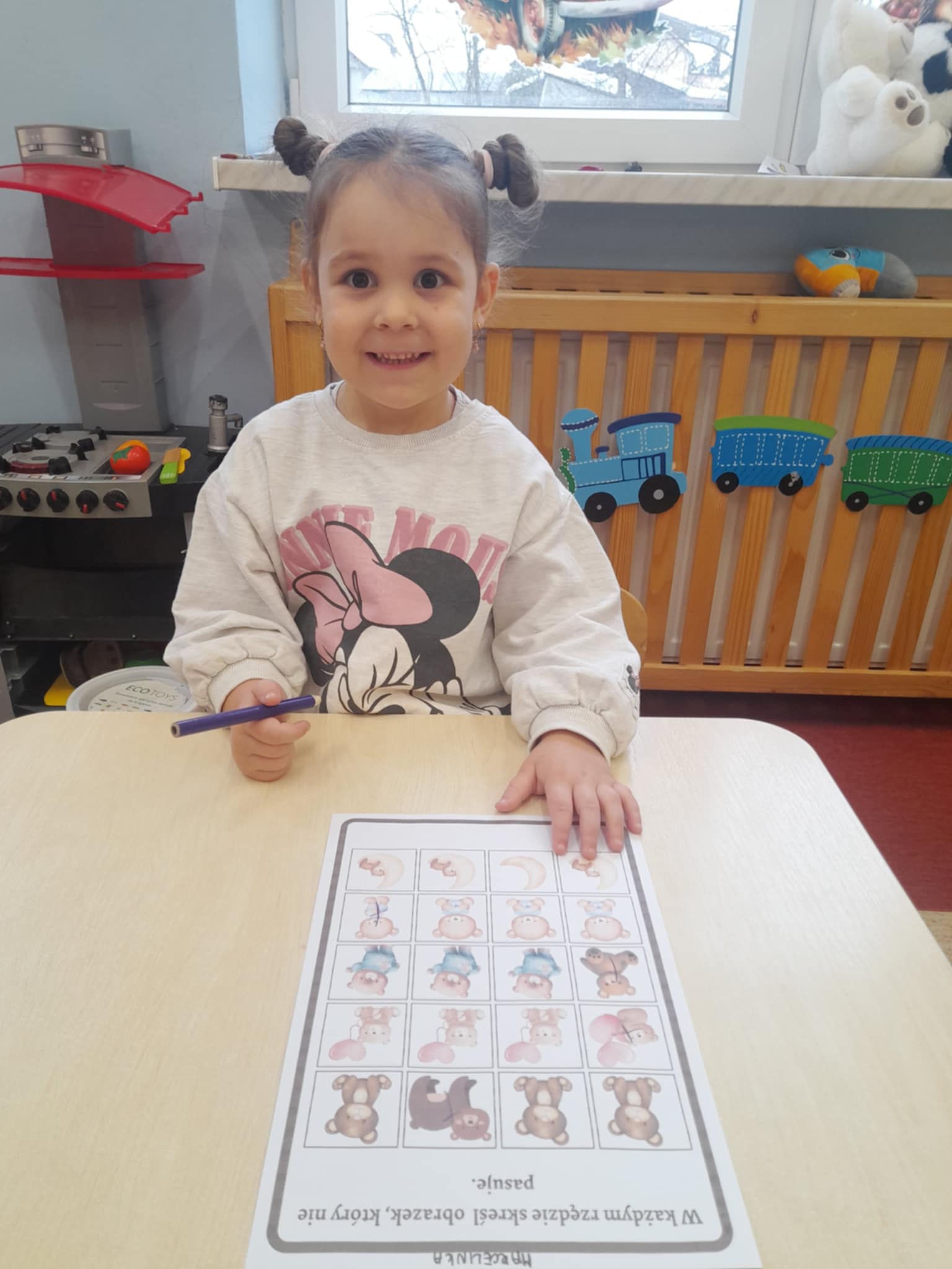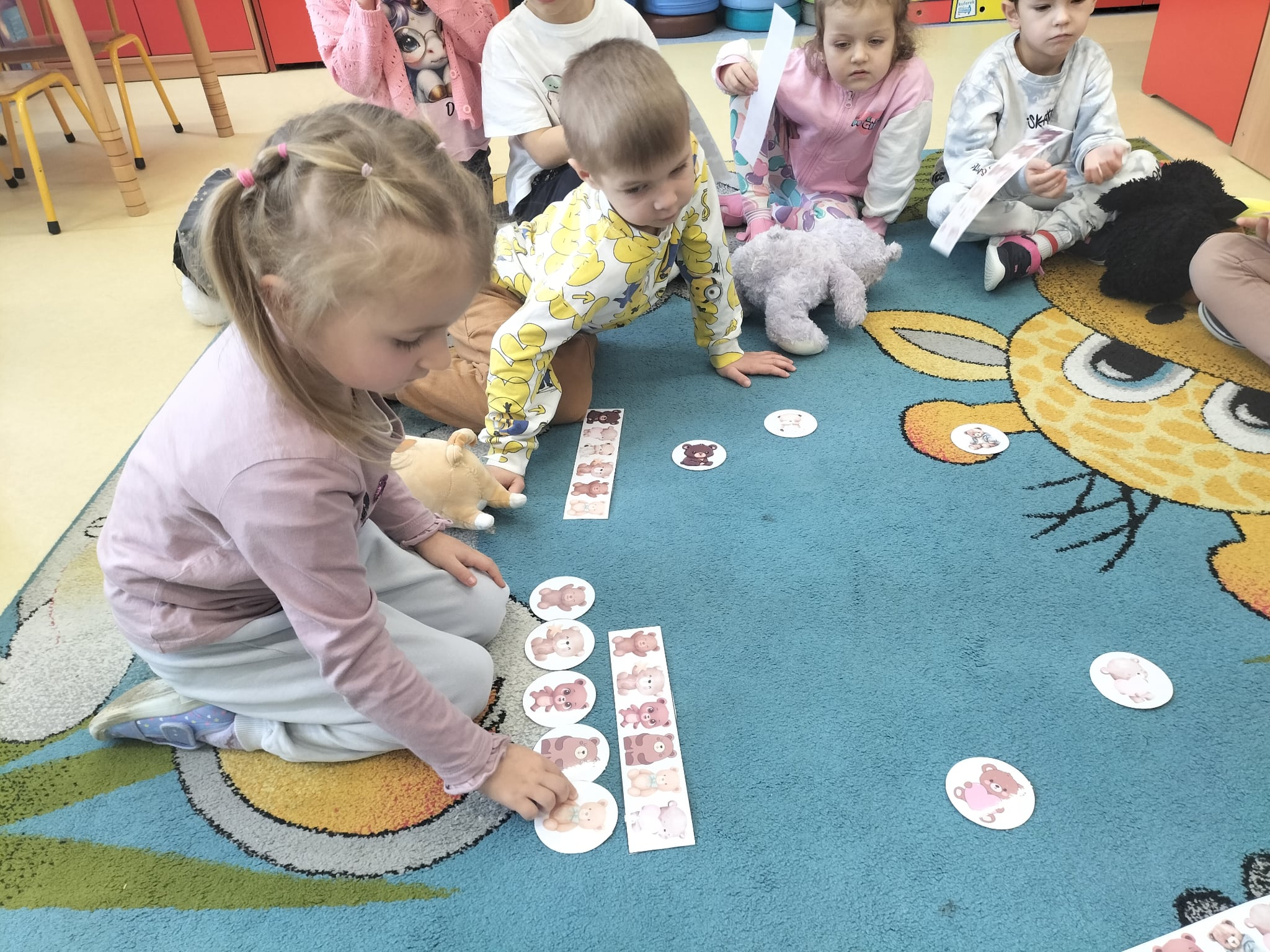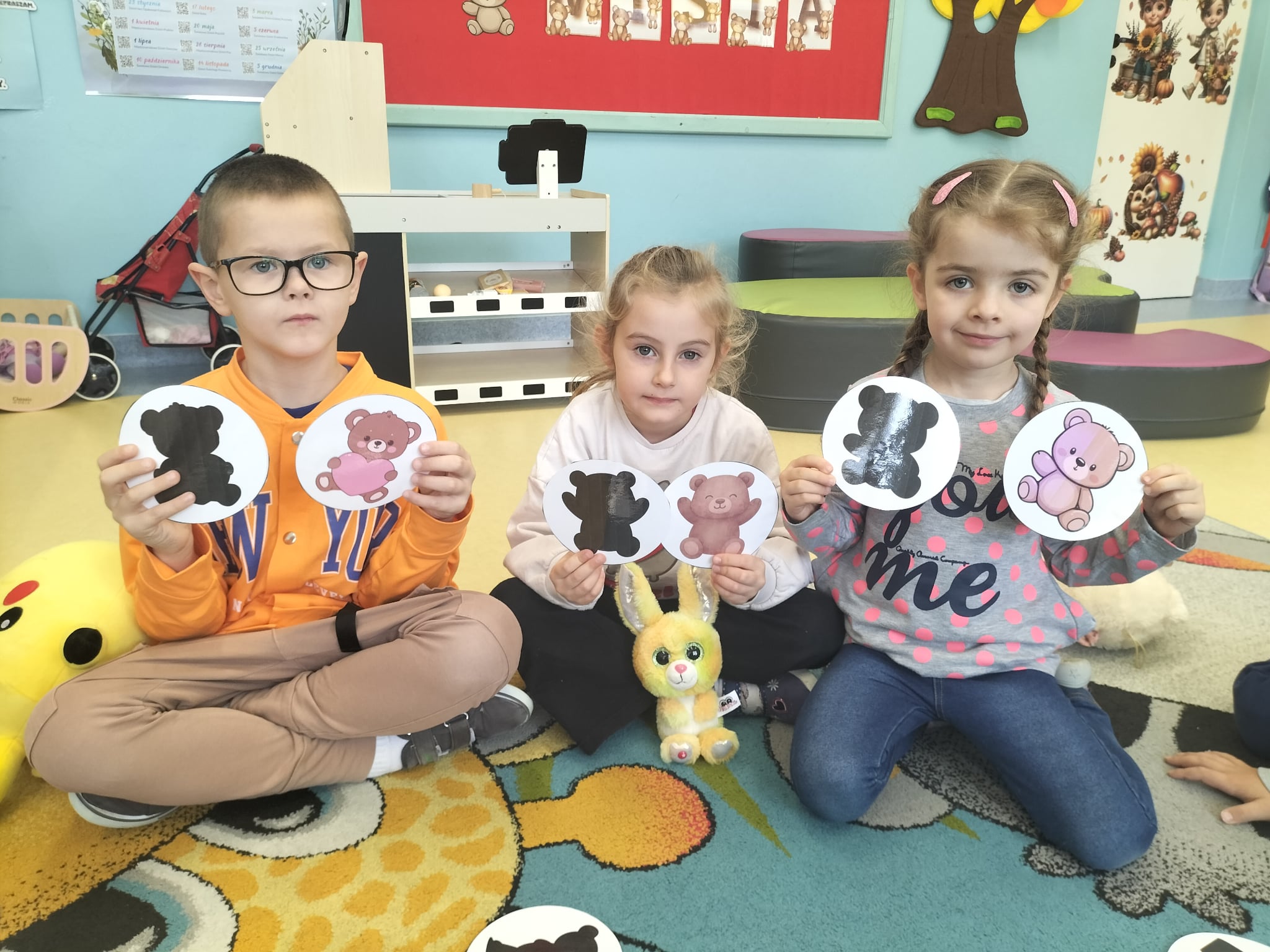 Dzisiejszy dzień był pełen misiowych atrakcji! Dzieci poznały historię pluszowego misia oraz przypomniały sobie znane misie z różnych bajek. Rozwiązywały także misiowe zadania – dopasowywały cienie do właściwych misiów oraz odnajdywały konkretnego misia wśród wielu innych.